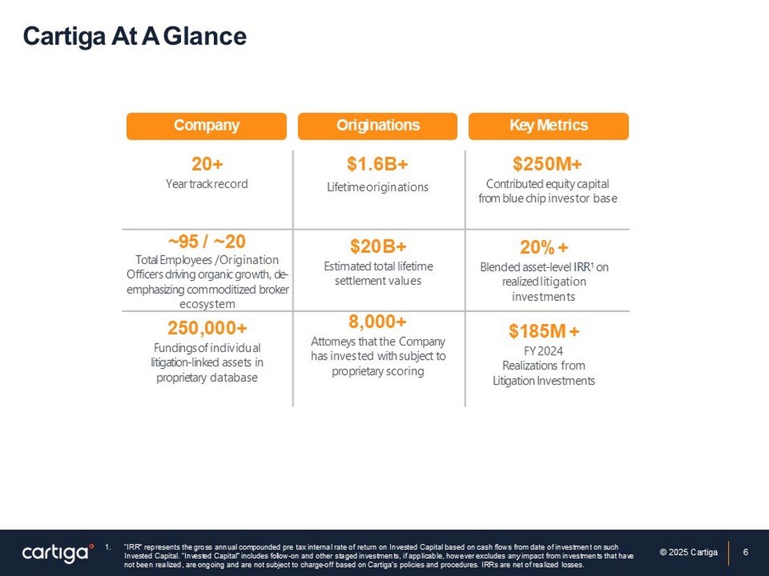 5 © 2025 Cartiga Our Mission Drives Our Business Our Business The Company benefits from a strong equity base, pioneering products, significant direct origination capabilities, and a proven track record with a long tenured management team x Large, proprietary claims database serves as competitive moat x Scaled, agile platform that drives intake, underwriting, tracking, management reporting, and ROI x Long track record of attractive EBITDA margins Law Firm Finance Backed by Claims & Other Legal Receivables Purchase of Consumer Claim Proceeds To power outstanding results for law firms and their clients Our Mission Cartiga is a leading data driven, tech forward asset management platform for investing in legal claims and law firms, a $300bn+ market representing ~1.4% GDP 1 • Underpenetrated by traditional sources of capital Cartiga leverages proprietary data and advanced analytics to achieve attractive risk adjusted returns by providing capital and other services to law firms and their clients Cartiga originates, manages, and monetizes assets in two primary business segments: 1. Source: Based on Legal Services Sector GDP concentration as per Bureau of Economic Analysis https:/ /www.bea.gov/data/gdp/gdp - industry 6 © 2025 Cartiga 1.