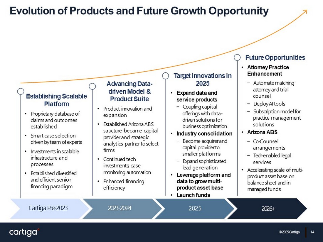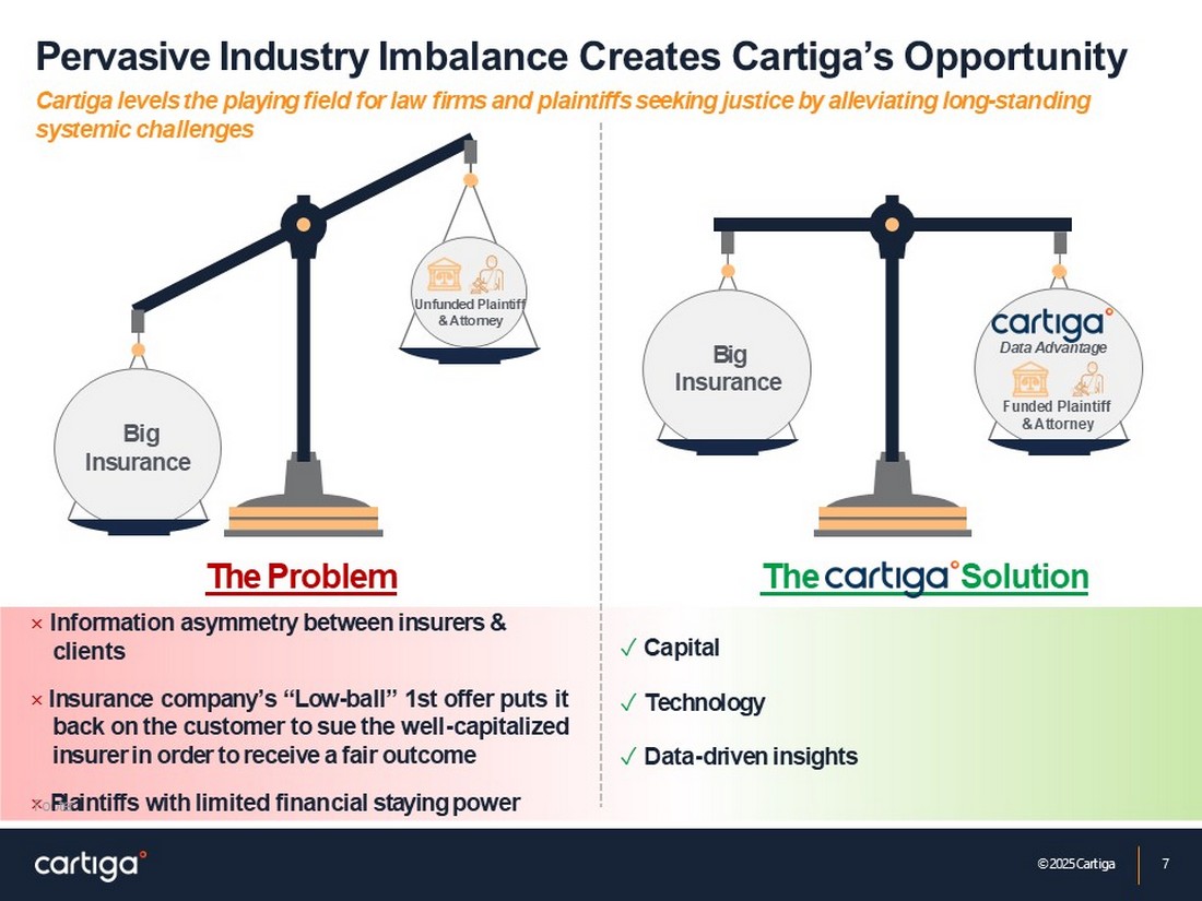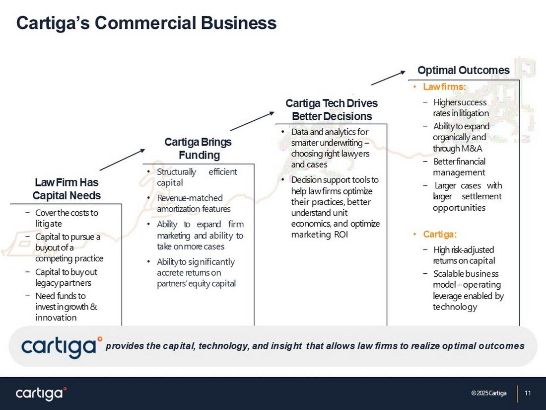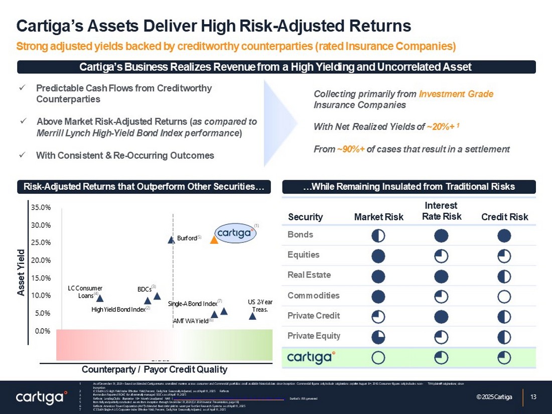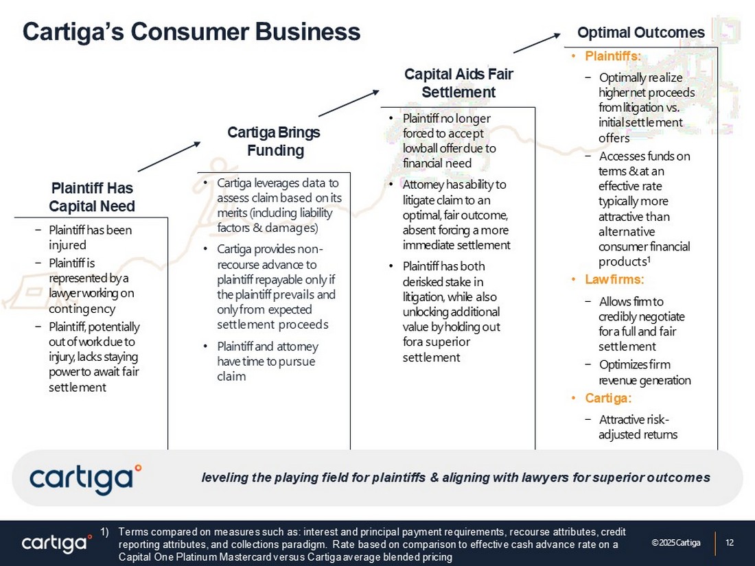 Innovative and Scalable Technology Driven Efficiency 20 years as an industry innovator, now with scaled database and tech platform driving business © 2025 Cartiga 10 Technology - Driven Efficient Business Operation Monetization Servicing & Claim Tracking Advisory Services Asset Management Underwriting & Funding Customer Acquisition Customer Relationship / Sales & Marketing Automation & Underwriting Efficiencies Predictive Analytics Cash Flow Modeling provides the capital, technology, and insight that allows law firms to realize optimal outcomes Cartiga’s Commercial Business Law Firm Has Capital Needs Cartiga Brings Funding Cartiga Tech Drives Better Decisions Optimal Outcomes − Cover the costs to litigate − Capital to pursue a buyout of a competing practice − Capital to buy out legacy partners − Need funds to invest in growth & innovation • Structurally efficient capital • Revenue - matched amortization features • Ability to expand firm marketing and ability to take on more cases • Ability to significantly accrete returns on partners’ equity capital • Data and analytics for smarter underwriting – choosing right lawyers and cases • Decision support tools to help law firms optimize their practices, better understand unit economics, and optimize marketing ROI • Law firms: − Higher success rates in litigation − Ability to expand organically and through M&A − Better financial management − Larger cases with larger settlement opportunities • Cartiga: − High risk - adjusted returns on capital − Scalable business model – operating leverage enabled by technology © 2025 Cartiga 11 12 © 2025 Cartiga leveling the playing field for plaintiffs & aligning with lawyers for superior outcomes Cartiga’s Consumer Business Plaintiff Has Capital Need Cartiga Brings Funding Optimal Outcomes − Plaintiff has been injured − Plaintiff is represented by a lawyer working on contingency − Plaintiff, potentially out of work due to injury, lacks staying power to await fair settlement • Cartiga leverages data to assess claim based on its merits (including liability factors & damages) • Cartiga provides non - recourse advance to plaintiff repayable only if the plaintiff prevails and only from expected settlement proceeds • Plaintiff and attorney have time to pursue claim • Plaintiff no longer forced to accept lowball offer due to financial need • Attorney has ability to litigate claim to an optimal, fair outcome, absent forcing a more immediate settlement • Plaintiff has both derisked stake in litigation, while also unlocking additional value by holding out for a superior settlement • Plaintiffs: − Optimally realize higher net proceeds from litigation vs. initial settlement offers − Accesses funds on terms & at an effective rate typically more attractive than alternative consumer financial products 1 • Law firms: − Allows firm to credibly negotiate for a full and fair settlement − Optimizes firm revenue generation • Cartiga: − Attractive risk - adjusted returns Capital Aids Fair Settlement 1) Terms compared on measures such as: interest and principal payment requirements, recourse attributes, credit reporting attributes, and collections paradigm. Rate based on comparison to effective cash advance rate on a Capital One Platinum Mastercard versus Cartiga average blended pricing