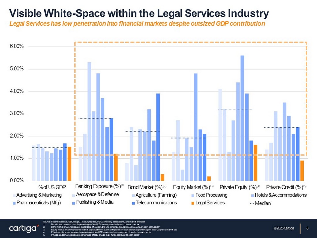Its analytics-driven strategy enables claim valuation, tech-enabled case monitoring, and dynamic risk adjustment. Cartiga streamlines the origination and investment process in a manner designed to mitigate risk and maximize returns. By investing in legal claims and legal services businesses, Cartiga continually improves its data advantage and value proposition to customers while delivering attractive non-correlated risk-adjusted returnsi. Cartiga believes that it is optimally positioned to drive growth by leveraging direct distribution and machine learning tools to both accelerate originations and deploy business optimization tools for law firms.