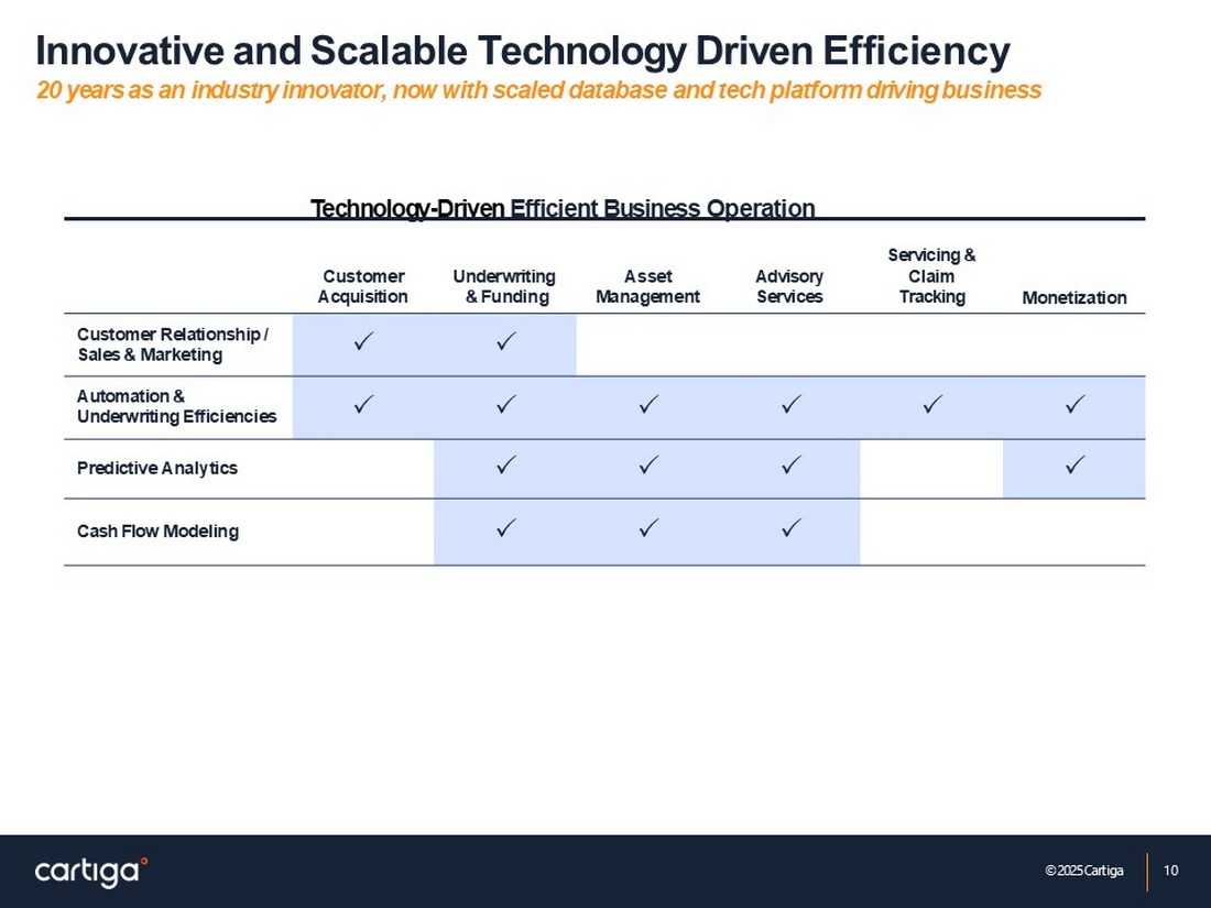 8 © 2025 Cartiga 0.00% 1.00% 2.00% 3.00% 4.00% 5.00% 6.00% % of US GDP Advertising & Marketing Pharmaceuticals (Mfg) Agriculture (Farming) Telecommunications Food Processing Legal Services Hotels & Accommodations Median Bond Market (%) (2) Equity Market (%) (3) Private Equity (%) (4) Private Credit (%) (5) Banking Exposure (%) (1) Aerospace & Defense Publishing & Media Visible White - Space within the Legal Services Industry Legal Services has low penetration into financial markets despite outsized GDP contribution Source: Federal Reserve, SEC filings, Treasury reports, PE/VC industry associations, and market analyses 1. 2. 3. 4. 5. Banking exposure represents percentage of total US banking assets deployed to each sector Bond market share represents percentage of outstanding US corporate bonds issued by companies in each sector Equity market share represents market capitalization of public companies in each sector as percentage of total US public market cap Private equity share represents percentage of total PE assets under management invested in each sector Private credit share represents percentage of total private debt funds deployed to each sector Proven Technology Platform Delivers Successful Outcomes 20 years as an industry innovator, now with scaled database and tech platform driving business Attorney Jurisdiction Defense Lawyer Medical Injury Limits Accident Type Proprietary Claims and Outcomes Database Case Type Insurance Counterparty Data Science & Analytics 10M+ data points from 250,000+ outcomes x Better financial forecasting x More predictable cash flows x Attorney scoring to drive selection and pricing Law Firms Consumers Powerful Outcomes for All Stakeholders Decision support tools enable optimization © 2025 Cartiga 9