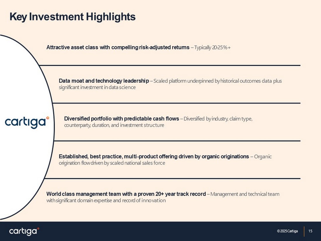 Evolution of Products and Future Growth Opportunity Cartiga Pre - 2023 2023 - 2024 2026+ Target Innovations in 2025 • Expand data and service products − Coupling capital offerings with data - driven solutions for business optimization • Industry consolidation − Become acquirer and capital provider to smaller platforms − Expand sophisticated lead generation • Leverage platform and data to grow multi - product asset base • Launch funds 2025 Advancing Data - driven Model & Product Suite • Product innovation and expansion • Established Arizona ABS structure; became capital provider and strategic analytics partner to select firms • Continued tech investments; case monitoring automation • Enhanced financing efficiency Establishing Scalable Platform • Proprietary database of claims and outcomes established • Smart case selection driven by team of experts • Investments in scalable infrastructure and processes • Established diversified and efficient senior financing paradigm Future Opportunities • Attorney Practice Enhancement − Automate matching attorney and trial counsel − Deploy AI tools − Subscription model for practice management solutions • Arizona ABS − Co - Counsel arrangements − Tech - enabled legal services • Accelerating scale of multi - product asset base on balance sheet and in managed funds © 2025 Cartiga 14 Attractive asset class with compelling risk - adjusted returns – Typically 20 - 25%+ Established, best practice, multi - product offering driven by organic originations – Organic origination flow driven by scaled national sales force Data moat and technology leadership – Scaled platform underpinned by historical outcomes data plus significant investment in data science World class management team with a proven 20+ year track record – Management and technical team with significant domain expertise and record of innovation Key Investment Highlights Diversified portfolio with predictable cash flows – Diversified by industry, claim type, counterparty, duration, and investment structure © 2025 Cartiga 15