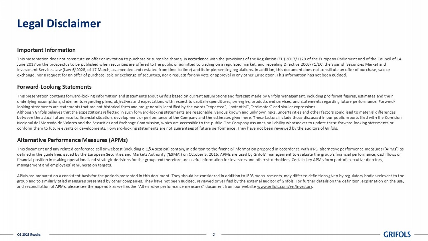 - 2 - Q1 2025 Results Legal Disclaimer Important Information This presentation does not constitute an offer or invitation to purchase or subscribe shares, in accordance with the provisio ns of the Regulation (EU) 2017/1129 of the European Parliament and of the Council of 14 June 2017 on the prospectus to be published when securities are offered to the public or admitted to trading on a regulated m ark et, and repealing Directive 2003/71/EC, the Spanish Securities Market and Investment Services Law (Law 6/2023, of 17 March, as amended and restated from time to time) and its implementing regulations . I n addition, this document does not constitute an offer of purchase, sale or exchange, nor a request for an offer of purchase, sale or exchange of securities, nor a request for any vote or approval in a ny other jurisdiction. This information has not been audited. Forward - Looking Statements This presentation contains forward - looking information and statements about Grifols based on current assumptions and forecast ma de by Grifols management, including pro forma figures, estimates and their underlying assumptions, statements regarding plans, objectives and expectations with respect to capital expenditures, synergi es, products and services, and statements regarding future performance. Forward - looking statements are statements that are not historical facts and are generally identified by the words “expected”, “potent ial ”, “estimates” and similar expressions. Although Grifols believes that the expectations reflected in such forward - looking statements are reasonable, various known and u nknown risks, uncertainties and other factors could lead to material differences between the actual future results, financial situation, development or performance of the Company and the estimates given her e. These factors include those discussed in our public reports filed with the Comisión Nacional del Mercado de Valores and the Securities and Exchange Commission, which are accessible to the public. The Company a ssu mes no liability whatsoever to update these forward - looking statements or conform them to future events or developments. Forward - looking statements are not guarantees of future performance. They have no t been reviewed by the auditors of Grifols. Alternative Performance Measures (APMs) This document and any related conference call or webcast (including a Q&A session) contain, in addition to the financial info rma tion prepared in accordance with IFRS, alternative performance measures (‘APMs’) as defined in the guidelines issued by the European Securities and Markets Authority (‘ESMA’) on October 5, 2015. APMs are used by Grifols’ management to evaluate the group’s financial performance, cash flows or financial position in making operational and strategic decisions for the group and therefore are useful information for inves tor s and other stakeholders. Certain key APMs form part of executive directors, management and employees’ remuneration targets. APMs are prepared on a consistent basis for the periods presented in this document. They should be considered in addition to IFR S measurements, may differ to definitions given by regulatory bodies relevant to the group and to similarly titled measures presented by other companies. They have not been audited, reviewed or verified by the ext ernal auditor of Grifols. For further details on the definition, explanation on the use, and reconciliation of APMs, please see the appendix as well as the “Alternative performance measures” document from our websi te www.grifols.com/en/investors .