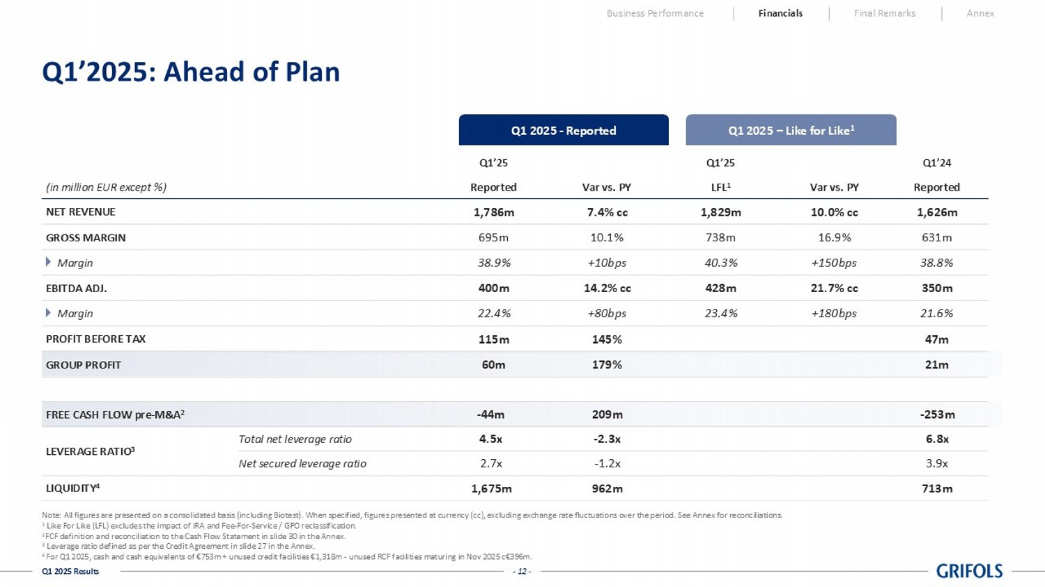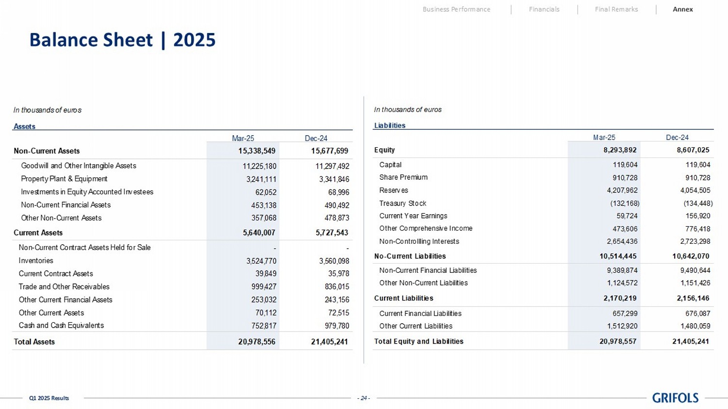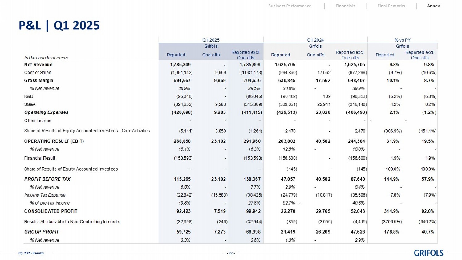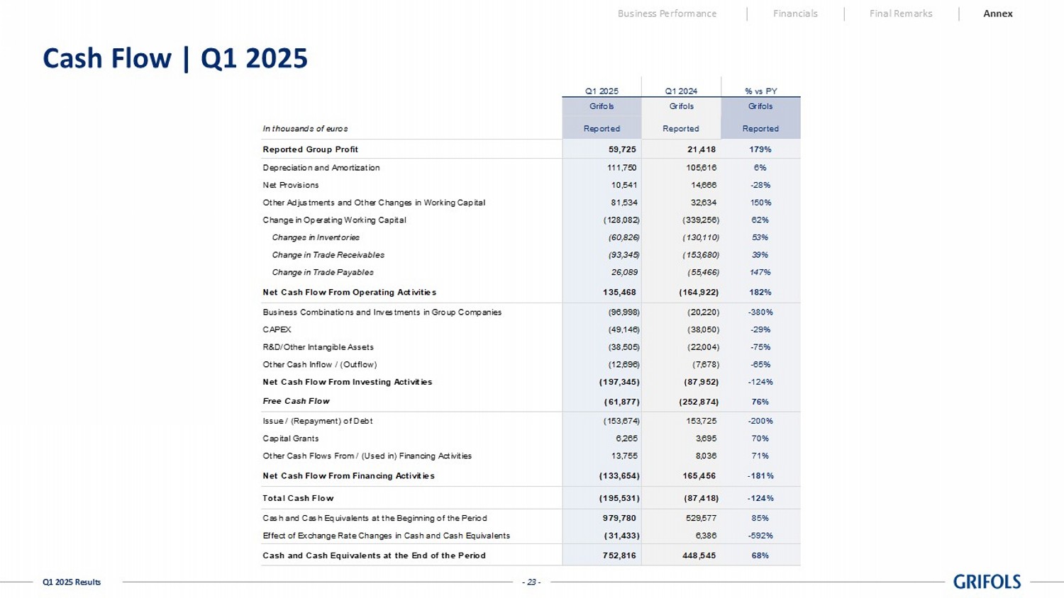One-offs Reported One-offs Reported excl. One-offs Reported Reported excl. One-offs Net Revenue 1,785,809 - 1,785,809 1,625,705 - 1,625,705 9.8% 9.8% Cost of Sales (1,091,142) 9,969 (1,081,173) (994,860) 17,562 (977,298) (9.7%) (10.6%) Gross Margin 694,667 9,969 704,636 630,845 17,562 648,407 10.1% 8.7% % Net revenue 38.9% - 39.5% 38.8% - 39.9% - - R&D (96,046) - (96,046) (90,462) 109 (90,353) (6.2%) (6.3%) SG&A (324,652) 9,283 (315,369) (339,051) 22,911 (316,140) 4.2% 0.2% Operating Expenses (420,698) 9,283 (411,415) (429,513) 23,020 (406,493) 2.1% (1.2%) Other Income - - - - - - - - (5,111) 3,850 (1,261) 2,470 - 2,470 (306.9%) (151.1%) OPERATING RESULT (EBIT) 268,858 23,102 291,960 203,802 40,582 244,384 31.9% 19.5% % Net revenue 15.1% - 16.3% 12.5% - 15.0% - - Financial Result (153,593) - (153,593) (156,600) - (156,600) 1.9% 1.9% - - - (145) - (145) 100.0% 100.0% PROFIT BEFORE TAX 115,265 23,102 138,367 47,057 40,582 87,640 144.9% 57.9% % Net revenue 6.5% - 7.7% 2.9% - 5.4% - - Income Tax Expense (22,842) (15,583) (38,425) (24,779) (10,817) (35,596) 7.8% (7.9%) % of pre-tax income 19.8% - 27.8% 52.7% - 40.6% - - CONSOLIDATED PROFIT 92,423 7,519 99,942 22,278 29,765 52,043 314.9% 92.0% Results Attributable to Non-Controlling Interests (32,698) (246) (32,944) (859) (3,556) (4,415) (3706.5%) (646.2%) GROUP PROFIT 59,725 7,273 66,998 21,419 26,209 47,628 178.8% 40.7% % Net revenue 3.3% - 3.8% 1.3% - 2.9% Q1 2025 % vs PY Share of Results of Equity Accounted Investees Share of Results of Equity Accounted Investees - Core Activities Grifols GrifolsGrifols Q1 2024 - 23 - Q1 2025 Results Cash Flow | Q1 2025 Business Performance Financials Final Remarks Annex In thousands of euros Reported Reported Reported Reported Group Profit 59,725 21,418 179% Depreciation and Amortization 111,750 105,616 6% Net Provisions 10,541 14,666 -28% Other Adjustments and Other Changes in Working Capital 81,534 32,634 150% Change in Operating Working Capital (128,082) (339,256) 62% Changes in Inventories (60,826) (130,110) 53% Change in Trade Receivables (93,345) (153,680) 39% Change in Trade Payables 26,089 (55,466) 147% Net Cash Flow From Operating Activities 135,468 (164,922) 182% Business Combinations and Investments in Group Companies (96,998) (20,220) -380% CAPEX (49,146) (38,050) -29% R&D/Other Intangible Assets (38,505) (22,004) -75% Other Cash Inflow / (Outflow) (12,696) (7,678) -65% Net Cash Flow From Investing Activities (197,345) (87,952) -124% Free Cash Flow (61,877) (252,874) 76% Issue / (Repayment) of Debt (153,674) 153,725 -200% Capital Grants 6,265 3,695 70% Other Cash Flows From / (Used in) Financing Activities 13,755 8,036 71% Net Cash Flow From Financing Activities (133,654) 165,456 -181% Total Cash Flow (195,531) (87,418) -124% Cash and Cash Equivalents at the Beginning of the Period 979,780 529,577 85% Effect of Exchange Rate Changes in Cash and Cash Equivalents (31,433) 6,386 -592% Cash and Cash Equivalents at the End of the Period 752,816 448,545 68% Q1 2025 Q1 2024 % vs PY Grifols Grifols Grifols