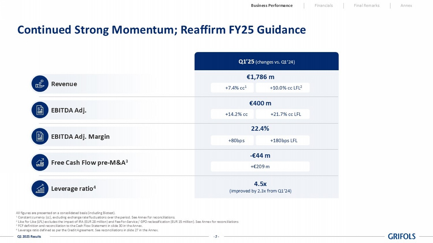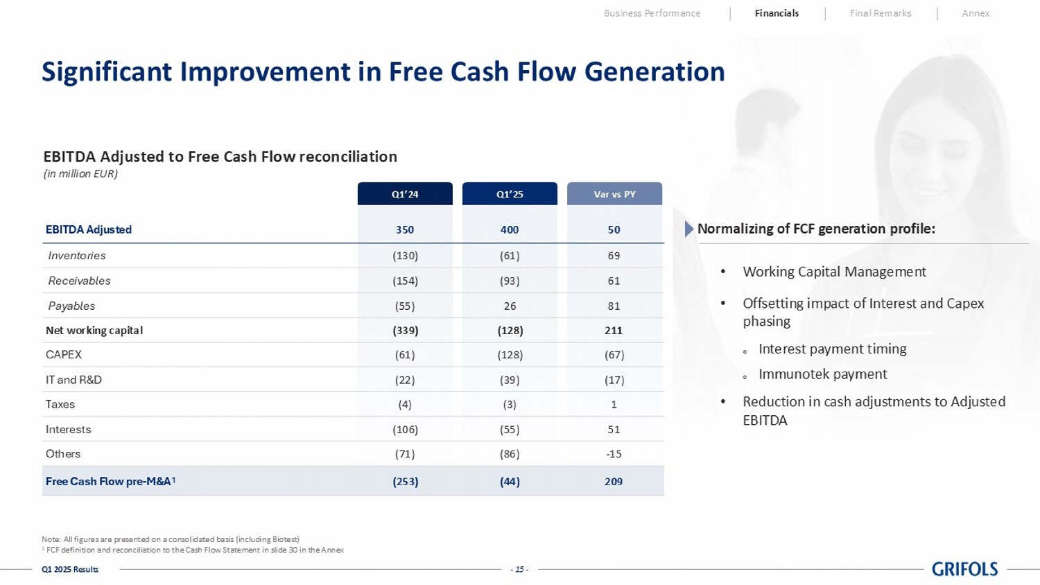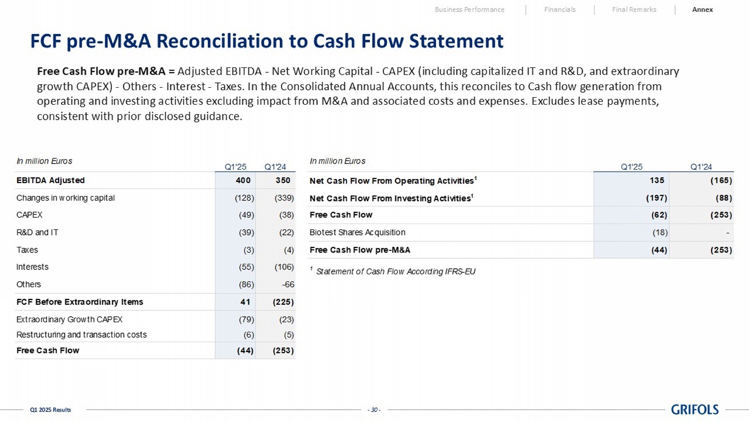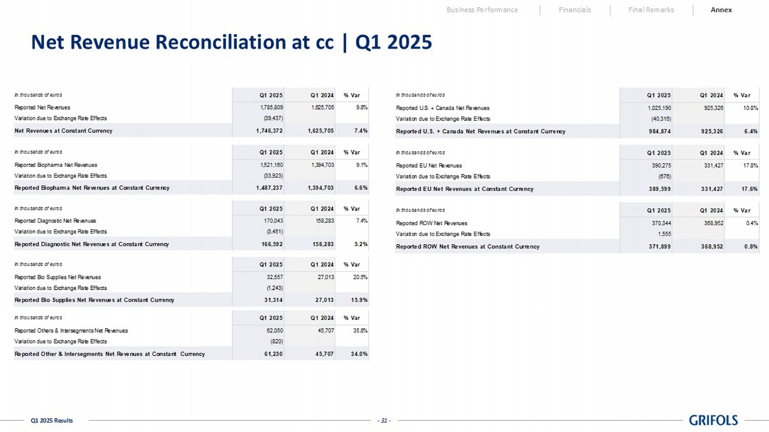 One-offs Reported One-offs Reported excl. One-offs Reported Reported excl. One-offs Net Revenue 1,785,809 - 1,785,809 1,625,705 - 1,625,705 9.8% 9.8% Cost of Sales (1,091,142) 9,969 (1,081,173) (994,860) 17,562 (977,298) (9.7%) (10.6%) Gross Margin 694,667 9,969 704,636 630,845 17,562 648,407 10.1% 8.7% % Net revenue 38.9% - 39.5% 38.8% - 39.9% - - R&D (96,046) - (96,046) (90,462) 109 (90,353) (6.2%) (6.3%) SG&A (324,652) 9,283 (315,369) (339,051) 22,911 (316,140) 4.2% 0.2% Operating Expenses (420,698) 9,283 (411,415) (429,513) 23,020 (406,493) 2.1% (1.2%) Other Income - - - - - - - - (5,111) 3,850 (1,261) 2,470 - 2,470 (306.9%) (151.1%) OPERATING RESULT (EBIT) 268,858 23,102 291,960 203,802 40,582 244,384 31.9% 19.5% % Net revenue 15.1% - 16.3% 12.5% - 15.0% - - Financial Result (153,593) - (153,593) (156,600) - (156,600) 1.9% 1.9% - - - (145) - (145) 100.0% 100.0% PROFIT BEFORE TAX 115,265 23,102 138,367 47,057 40,582 87,640 144.9% 57.9% % Net revenue 6.5% - 7.7% 2.9% - 5.4% - - Income Tax Expense (22,842) (15,583) (38,425) (24,779) (10,817) (35,596) 7.8% (7.9%) % of pre-tax income 19.8% - 27.8% 52.7% - 40.6% - - CONSOLIDATED PROFIT 92,423 7,519 99,942 22,278 29,765 52,043 314.9% 92.0% Results Attributable to Non-Controlling Interests (32,698) (246) (32,944) (859) (3,556) (4,415) (3706.5%) (646.2%) GROUP PROFIT 59,725 7,273 66,998 21,419 26,209 47,628 178.8% 40.7% % Net revenue 3.3% - 3.8% 1.3% - 2.9% Q1 2025 % vs PY Share of Results of Equity Accounted Investees Share of Results of Equity Accounted Investees - Core Activities Grifols GrifolsGrifols Q1 2024 - 23 - Q1 2025 Results Cash Flow | Q1 2025 Business Performance Financials Final Remarks Annex In thousands of euros Reported Reported Reported Reported Group Profit 59,725 21,418 179% Depreciation and Amortization 111,750 105,616 6% Net Provisions 10,541 14,666 -28% Other Adjustments and Other Changes in Working Capital 81,534 32,634 150% Change in Operating Working Capital (128,082) (339,256) 62% Changes in Inventories (60,826) (130,110) 53% Change in Trade Receivables (93,345) (153,680) 39% Change in Trade Payables 26,089 (55,466) 147% Net Cash Flow From Operating Activities 135,468 (164,922) 182% Business Combinations and Investments in Group Companies (96,998) (20,220) -380% CAPEX (49,146) (38,050) -29% R&D/Other Intangible Assets (38,505) (22,004) -75% Other Cash Inflow / (Outflow) (12,696) (7,678) -65% Net Cash Flow From Investing Activities (197,345) (87,952) -124% Free Cash Flow (61,877) (252,874) 76% Issue / (Repayment) of Debt (153,674) 153,725 -200% Capital Grants 6,265 3,695 70% Other Cash Flows From / (Used in) Financing Activities 13,755 8,036 71% Net Cash Flow From Financing Activities (133,654) 165,456 -181% Total Cash Flow (195,531) (87,418) -124% Cash and Cash Equivalents at the Beginning of the Period 979,780 529,577 85% Effect of Exchange Rate Changes in Cash and Cash Equivalents (31,433) 6,386 -592% Cash and Cash Equivalents at the End of the Period 752,816 448,545 68% Q1 2025 Q1 2024 % vs PY Grifols Grifols Grifols