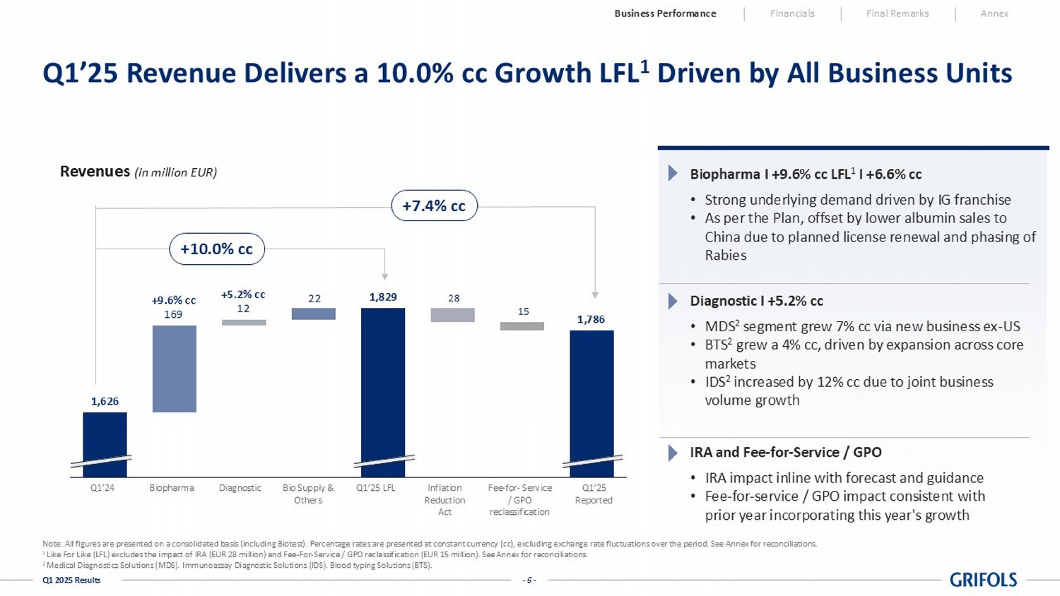 See Annex for reconciliations. 1 Like For Like (LFL) excludes the impact of IRA (EUR 28 million) and Fee - For - Service / GPO reclassification (EUR 15 million). See Annex for reconciliations.