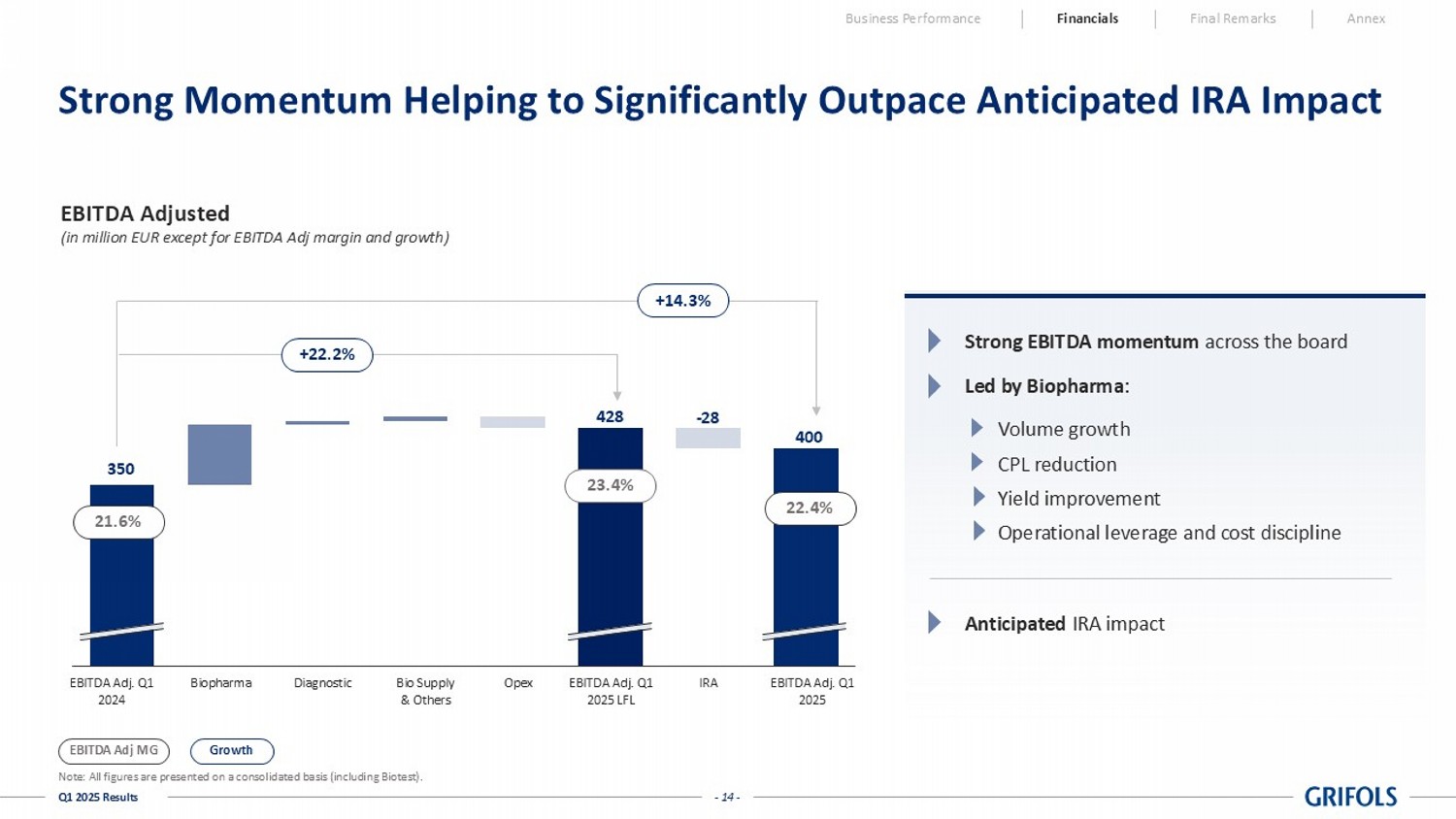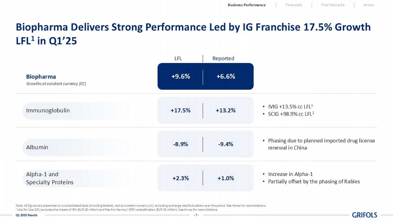 Due to the impact of the Inflation Reduction Act on its financial results, Grifols expects to share greater detail in 2025 giving investors and analysts further visibility on its actual performance and underlying momentum. As a result, for 2025, Grifols expects to show both reported figures and LFL2 figures to make them comparable to previous quarters. LFL figures adjust for the impact on Biopharma performance of both the Inflation Reduction Act Medicare Part D Redesign (IRA) and the Fee-for-Services reclassification in Q4’24.