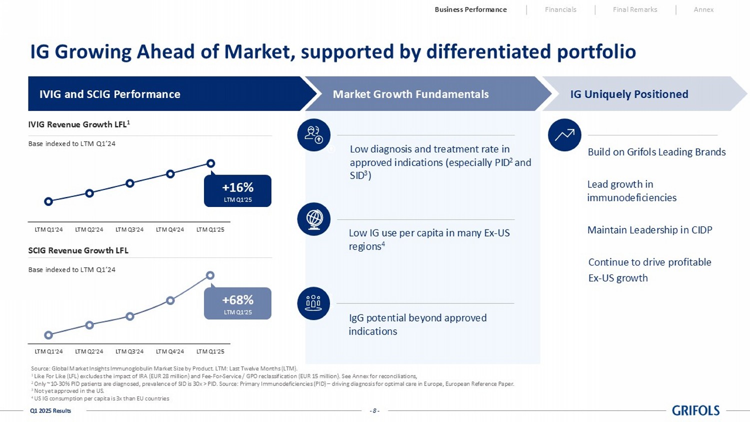 Percentage rates are presented at constant curre ncy (cc), excluding exchange rate fluctuations over the period. See Annex for reconciliations. 1 Like For Like (LFL) excludes the impact of IRA (EUR 28 million) and Fee - For - Service / GPO reclassification (EUR 15 million). See Annex for reconciliations. 2 Medical Diagnostics Solutions (MDS). Immunoassay Diagnostic Solutions (IDS). Blood typing Solutions (BTS). Revenues (in million EUR) 1,626 1,829 1 2 3 4 5 6 7 8 Q1’24 Biopharma Diagnostic Bio Supply & Others Q1’25 LFL Fee - for - S ervice / GPO reclassification Q1’25 Reported Inflation Reduction Act 1,786 +9.6% cc 169 +5.2% cc 12 22 15 28 +10.0% cc +7.4% cc Business Performance Financials Final Remarks Annex Biopharma I +9.6% cc LFL 1 I +6.6% cc • Strong underlying demand driven by IG franchise • As per the Plan, offset by lower albumin sales to China due to planned license renewal and phasing of Rabies Diagnostic I +5.2% cc • MDS 2 segment grew 7% cc via new business ex - US • BTS 2 grew a 4% cc, driven by expansion across core markets • IDS 2 increased by 12% cc due to joint business volume growth IRA and Fee - for - Service / GPO • IRA impact inline with forecast and guidance • Fee - for - service / GPO impact consistent with prior year incorporating this year's growth - 7 - Q1 2025 Results Biopharma Delivers Strong Performance Led by IG Franchise 17.5% Growth LFL 1 in Q1’25 Business Performance Financials Final Remarks Annex Biopharma Immunoglobulin Albumin Alpha - 1 and Specialty P roteins • IVIG +13.5% cc LFL 1 • SCIG +98.9% cc LFL 1 • Phasing due to planned imported drug license renewal in China • Increase in Alpha - 1 • Partially offset by the phasing of Rabies +17.5% - 8.9% +2.3% +9.6% +13.2% - 9.4% +1.0% +6.6% LFL Reported Growths at constant currency (CC) Note: All figures are presented on a consolidated basis (including Biotest), and at constant currency (cc), excluding exchang e r ate fluctuations over the period.