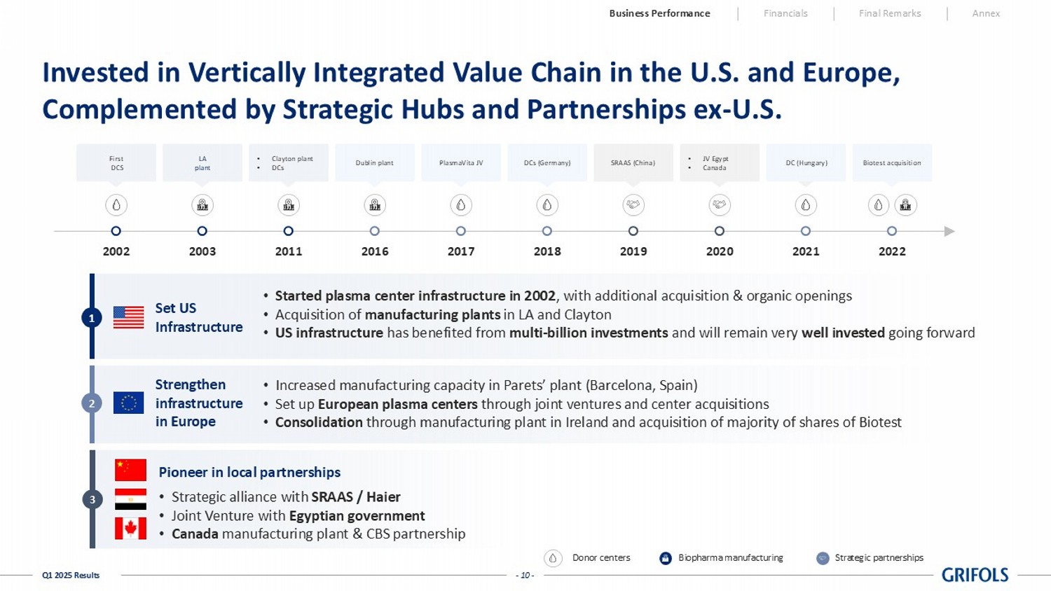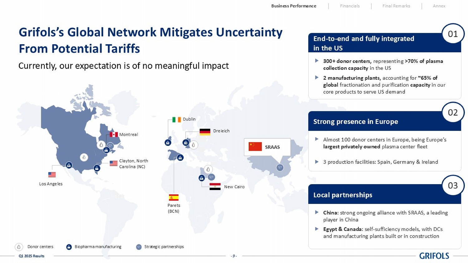4 US IG consumption per capita is 3x than EU countries Business Performance Financials Final Remarks Annex IVIG Revenue Growth LFL 1 Base indexed to LTM Q1’24 LTM Q1'24 LTM Q2'24 LTM Q3'24 LTM Q4'24 LTM Q1'25 SCIG Revenue Growth LFL Base indexed to LTM Q1’24 LTM Q1'24 LTM Q2'24 LTM Q3'24 LTM Q4'24 LTM Q1'25 +16% LTM Q1’25 +68% LTM Q1’25 Low diagnosis and treatment rate in approved indications (especially PID 2 and SID 3 ) Low IG use per capita in many Ex - US regions 4 IgG potential beyond approved indications IVIG and SCIG Performance Market Growth Fundamentals Build on Grifols Leading Brands Lead growth in immunodeficiencies IG Uniquely Positioned Maintain Leadership in CIDP Continue to drive profitable Ex - US growth - 9 - Q1 2025 Results Grifols’s Global Network Mitigates Uncertainty From Potential Tariffs Los Angeles Clayton, North Carolina (NC) Montreal New Cairo Parets (BCN) Dublin SRAAS Dreieich Donor centers Biopharma manufacturing Strategic partnerships End - to - end and fully integrated in the US 300+ donor centers, representing >70% of plasma collection capacity in the US 2 manufacturing plants, accounting for ~65% of global fractionation and purification capacity in our core products to serve US demand 01 Strong presence in Europe Almost 100 donor centers in Europe, being Europe’s largest privately owned plasma center fleet 3 production facilities: Spain, Germany & Ireland 02 Local partnerships China: strong ongoing alliance with SRAAS, a leading player in China Egypt & Canada: self - sufficiency models, with DCs and manufacturing plants built or in construction 03 Currently, our expectation is of no meaningful impact Business Performance Financials Final Remarks Annex - 10 - Q1 2025 Results Invested in Vertically Integrated Value Chain in the U.S. and Europe, Complemented by Strategic Hubs and Partnerships ex - U.S. 2002 2003 2011 2016 2017 2018 2019 2020 2021 2022 First 43 DCS First DCS LA plant • Clayton plant • DCs Dublin plant PlasmaVita JV DCs (Germany) SRAAS (China) • JV Egypt • Canada DC (Hungary) Biotest acquisition 1 2 3 • Started plasma center infrastructure in 2002 , with additional acquisition & organic openings • Acquisition of manufacturing plants in LA and Clayton • US infrastructure has benefited from multi - billion investments and will remain very well invested going forward Set US Infrastructure • Increased manufacturing capacity in Parets’ plant (Barcelona, Spain) • Set up European plasma centers through joint ventures and center acquisitions • Consolidation through manufacturing plant in Ireland and acquisition of majority of shares of Biotest Strengthen infrastructure in Europe • Strategic alliance with SRAAS / Haier • Joint Venture with Egyptian government • Canada manufacturing plant & CBS partnership Pioneer in local partnerships Donor centers Biopharma manufacturing Strategic partnerships Business Performance Financials Final Remarks Annex