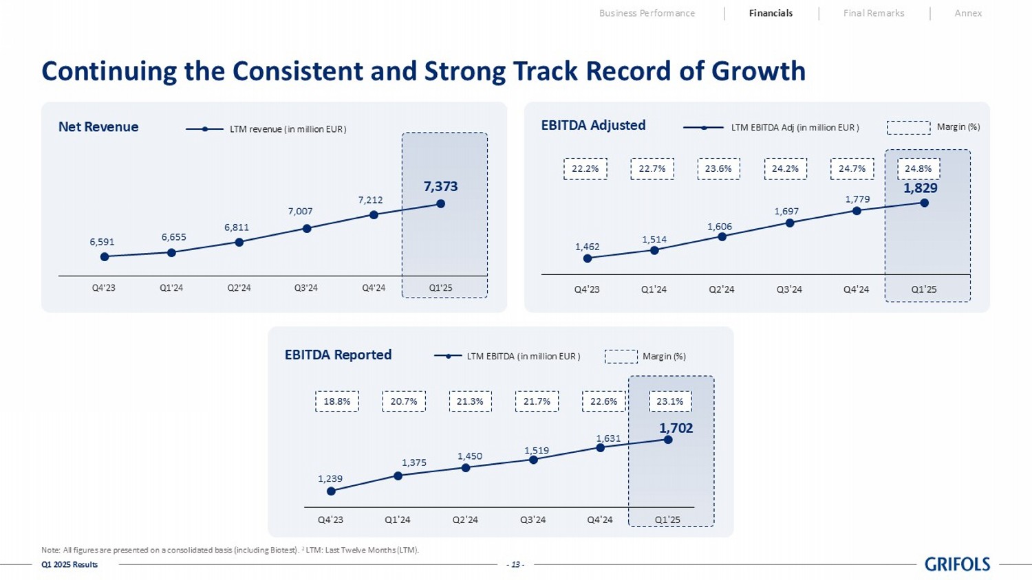 - 12 - Q1 2025 Results Q1’2025: Ahead of Plan Business Performance Financials Final Remarks Annex Note: All figures are presented on a consolidated basis (including Biotest). When specified, figures presented at currency (c c), excluding exchange rate fluctuations over the period. See Annex for reconciliations. 1 Like For Like (LFL) excludes the impact of IRA and Fee - For - Service / GPO reclassification. 2 FCF definition and reconciliation to the Cash Flow Statement in slide 30 in the Annex. 3 Leverage ratio defined as per the Credit Agreement in slide 27 in the Annex. 4 For Q1 2025, cash and cash equivalents of €753m + unused credit facilities € 1,318 m - unused RCF facilities maturing in Nov 2025 c€396m. Q 1 2025 – Like for Like 1 Q 1 2025 - Reported Q1’24 Q1’25 Q1’25 Reported Var vs. PY LFL 1 Var vs. PY Reported (in million EUR except %) 1,626m 10.0% cc 1,829m 7.4% cc 1,786m NET REVENUE 631m 16.9% 738m 10.1% 695m GROSS MARGIN 38.8% +150bps 40.3% +10bps 38.9% Margin 350m 21.7% cc 428m 14.2% cc 400m EBITDA ADJ. 21.6% +180bps 23.4% +80bps 22.4% Margin 47m 145% 115m PROFIT BEFORE TAX 21m 179% 60m GROUP PROFIT - 253m 209m - 44m FREE CASH FLOW pre - M&A 2 6.8x - 2.3x 4.5x Total net leverage ratio LEVERAGE RATIO 3 3.9x - 1.2x 2.7x Net secured leverage ratio 713m 962m 1,675m LIQUIDITY 4 - 13 - Q1 2025 Results Continuing the Consistent and Strong Track Record of Growth Business Performance Financials Final Remarks Annex Note: All figures are presented on a consolidated basis (including Biotest).