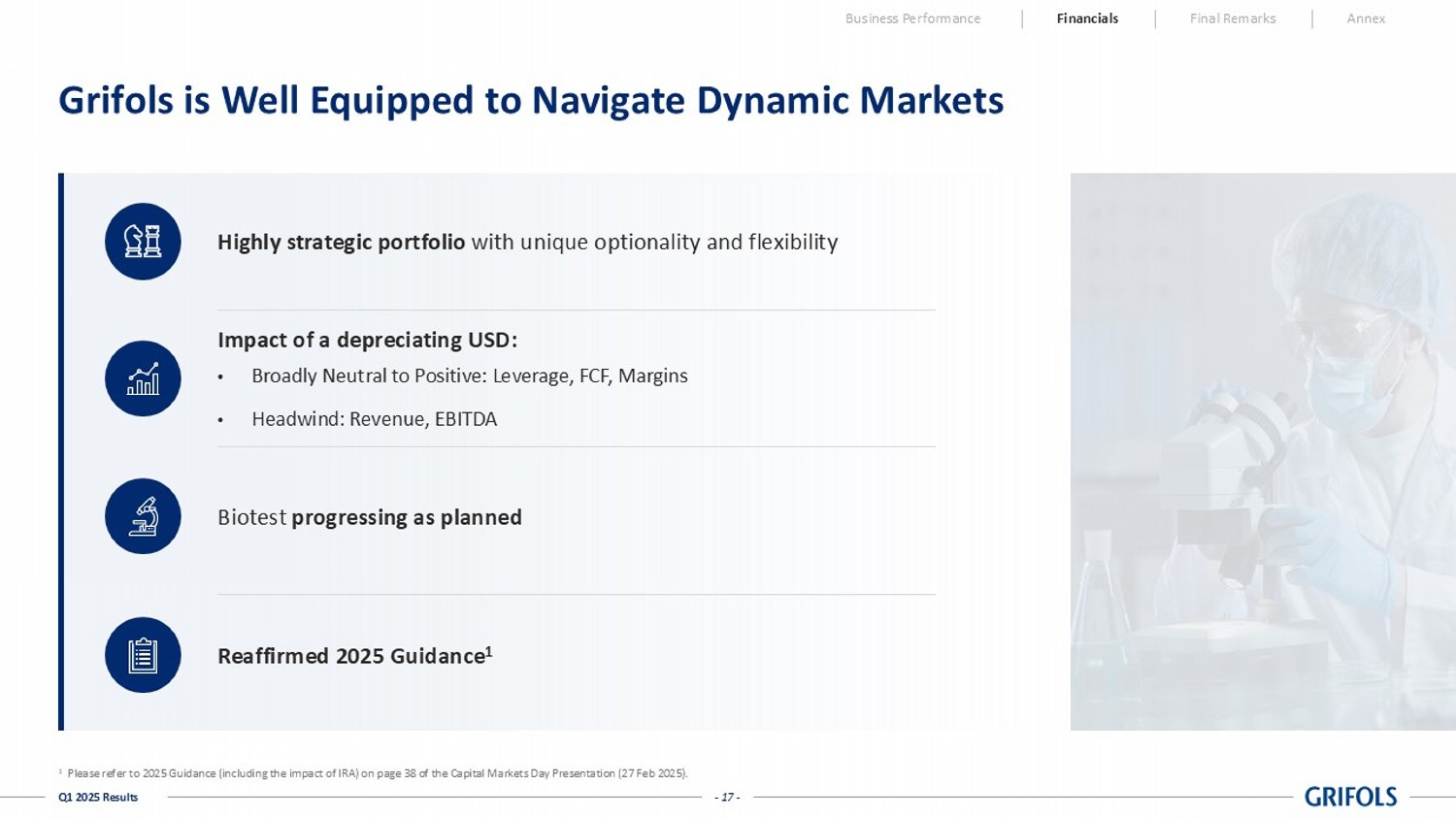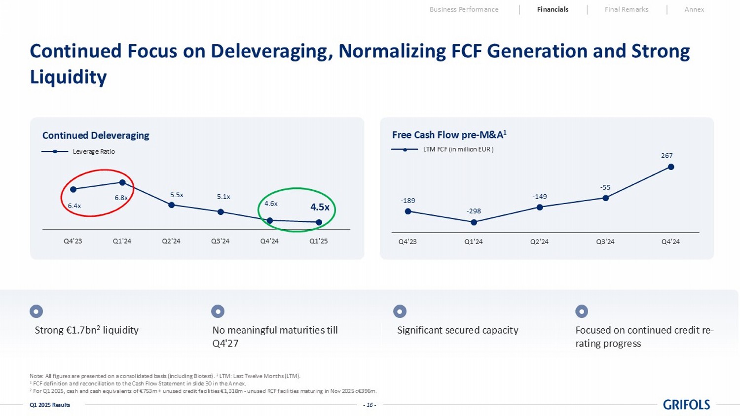 Q1 2025 LFL IRA 21.6% 23.4% 22.4% EBITDA Adj MG Growth - 15 - Q1 2025 Results Q1’25 Var vs PY Q1’24 50 400 350 EBITDA Adjusted 69 (61) (130) Inventories 61 (93) (154) Receivables 81 26 (55) Payables 211 (128) (339) Net working capital (67) (128) (61) CAPEX (17) (39) (22) IT and R&D 1 (3) (4) Taxes 51 (55) (106) Interests - 15 (86) (71) Others 209 (44) (253) Free Cash Flow pre - M&A 1 Business Performance Financials Final Remarks Annex Note: All figures are presented on a consolidated basis (including Biotest) 1 FCF definition and reconciliation to the Cash Flow Statement in slide 30 in the Annex EBITDA Adjusted to Free Cash Flow reconciliation (in million EUR) Significant Improvement in Free Cash Flow Generation Normalizing of FCF generation profile: • Working Capital Management • Offsetting impact of Interest and Capex phasing o Interest payment timing o Immunotek payment • Reduction in cash adjustments to Adjusted EBITDA - 16 - Q1 2025 Results Business Performance Financials Final Remarks Annex Significant secured capacity Strong €1.7bn 2 liquidity Focused on continued credit re - rating progress Continued Focus on Deleveraging, Normalizing FCF Generation and Strong Liquidity - 189 - 298 - 149 - 55 267 Q4'23 Q1'24 Q2'24 Q3'24 Q4'24 Free Cash Flow pre - M&A 1 LTM FCF ( in million EUR ) Note: All figures are presented on a consolidated basis (including Biotest).
