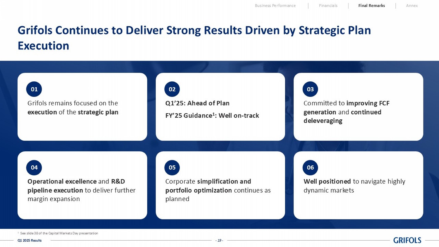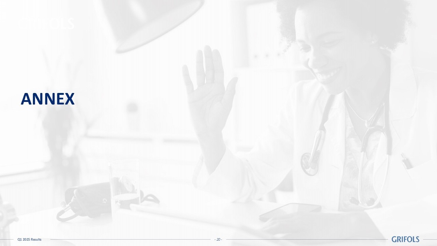 - 19 - Q1 2025 Results Grifols remains focused on the execution of the strategic plan Q1’25: Ahead of Plan FY’25 Guidance 1 : Well on - track Committed to improving FCF generation and continued deleveraging Operational excellence and R&D pipeline execution to deliver further margin expansion Corporate simplification and portfolio optimization continues as planned Well positioned to navigate highly dynamic markets 01 02 03 04 05 06 Grifols Continues to Deliver Strong Results Driven by Strategic Plan Execution Business Performance Financials Final Remarks Annex 1 See slide 38 of the Capital Markets Day presentation - 20 - Q1 2025 Results ANNEX