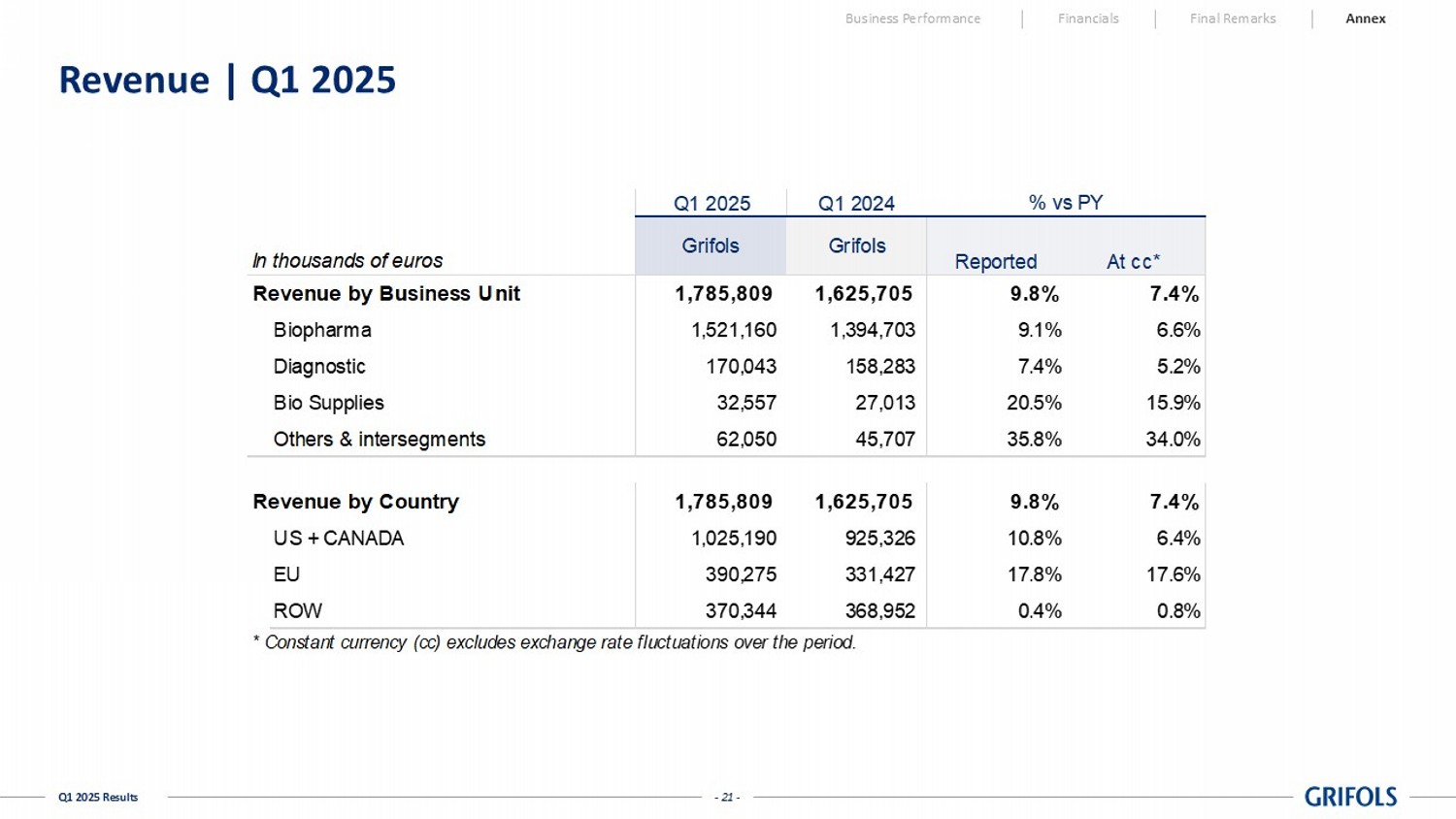 - 21 - Q1 2025 Results Revenue | Q1 2025 Q1 2025 Q1 2024 In thousands of euros Reported At cc* Revenue by Business Unit 1,785,809 1,625,705 9.8% 7.4% Biopharma 1,521,160 1,394,703 9.1% 6.6% Diagnostic 170,043 158,283 7.4% 5.2% Bio Supplies 32,557 27,013 20.5% 15.9% Others & intersegments 62,050 45,707 35.8% 34.0% Revenue by Country 1,785,809 1,625,705 9.8% 7.4% US + CANADA 1,025,190 925,326 10.8% 6.4% EU 390,275 331,427 17.8% 17.6% ROW 370,344 368,952 0.4% 0.8% * Constant currency (cc) excludes exchange rate fluctuations over the period. Grifols Grifols % vs PY Business Performance Financials Final Remarks Annex - 22 - Q1 2025 Results P&L | Q1 2025 Business Performance Financials Final Remarks Annex In thousands of euros Reported One-offs Reported excl.