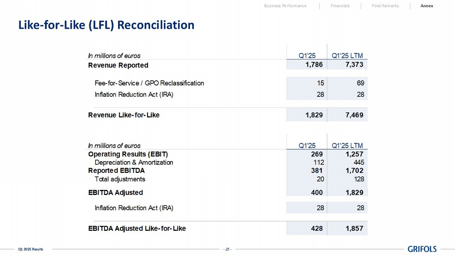 - 24 - Q1 2025 Results Balance Sheet | 2025 Business Performance Financials Final Remarks Annex In thousands of euros Mar-25 Dec-24 15,338,549 15,677,699 11,225,180 11,297,492 3,241,111 3,341,846 62,052 68,996 453,138 490,492 357,068 478,873 5,640,007 5,727,543 - - 3,524,770 3,560,098 39,849 35,978 999,427 836,015 253,032 243,156 70,112 72,515 752,817 979,780 20,978,556 21,405,241 Cash and Cash Equivalents Goodwill and Other Intangible Assets Property Plant & Equipment Assets Non-Current Assets Total Assets Current Assets Inventories Current Contract Assets Other Current Financial Assets Non-Current Contract Assets Held for Sale Trade and Other Receivables Investments in Equity Accounted Investees Non-Current Financial Assets Other Non-Current Assets Other Current Assets In thousands of euros Mar-25 Dec-24 8,293,892 8,607,025 119,604 119,604 910,728 910,728 4,207,962 4,054,505 Treasury Stock (132,168) (134,448) 59,724 156,920 473,606 776,418 2,654,436 2,723,298 10,514,445 10,642,070 9,389,874 9,490,644 1,124,572 1,151,426 2,170,219 2,156,146 657,299 676,087 1,512,920 1,480,059 20,978,557 21,405,241 Other Current Liabilities Total Equity and Liabilities Other Comprehensive Income Non-Controllling Interests No-Current Liabilities Non-Current Financial Liabilities Other Non-Current Liabilities Share Premium Reserves Current Year Earnings Current Liabilities Current Financial Liabilities Capital Equity Liabilities - 25 - Q1 2025 Results Like - for - Like (LFL) Reconciliation Business Performance Financials Final Remarks Annex In millions of euros Q1'25 Q1'25 LTM Revenue Reported 1,786 7,373 Fee-for-Service / GPO Reclassification 15 69 Inflation Reduction Act (IRA) 28 28 Revenue Like-for-Like 1,829 7,469 In millions of euros Q1'25 Q1'25 LTM Operating Results (EBIT) 269 1,257 Depreciation & Amortization 112 445 Reported EBITDA 381 1,702 Total adjustments 20 128 EBITDA Adjusted 400 1,829 Inflation Reduction Act (IRA) 28 28 EBITDA Adjusted Like-for-Like 428 1,857
