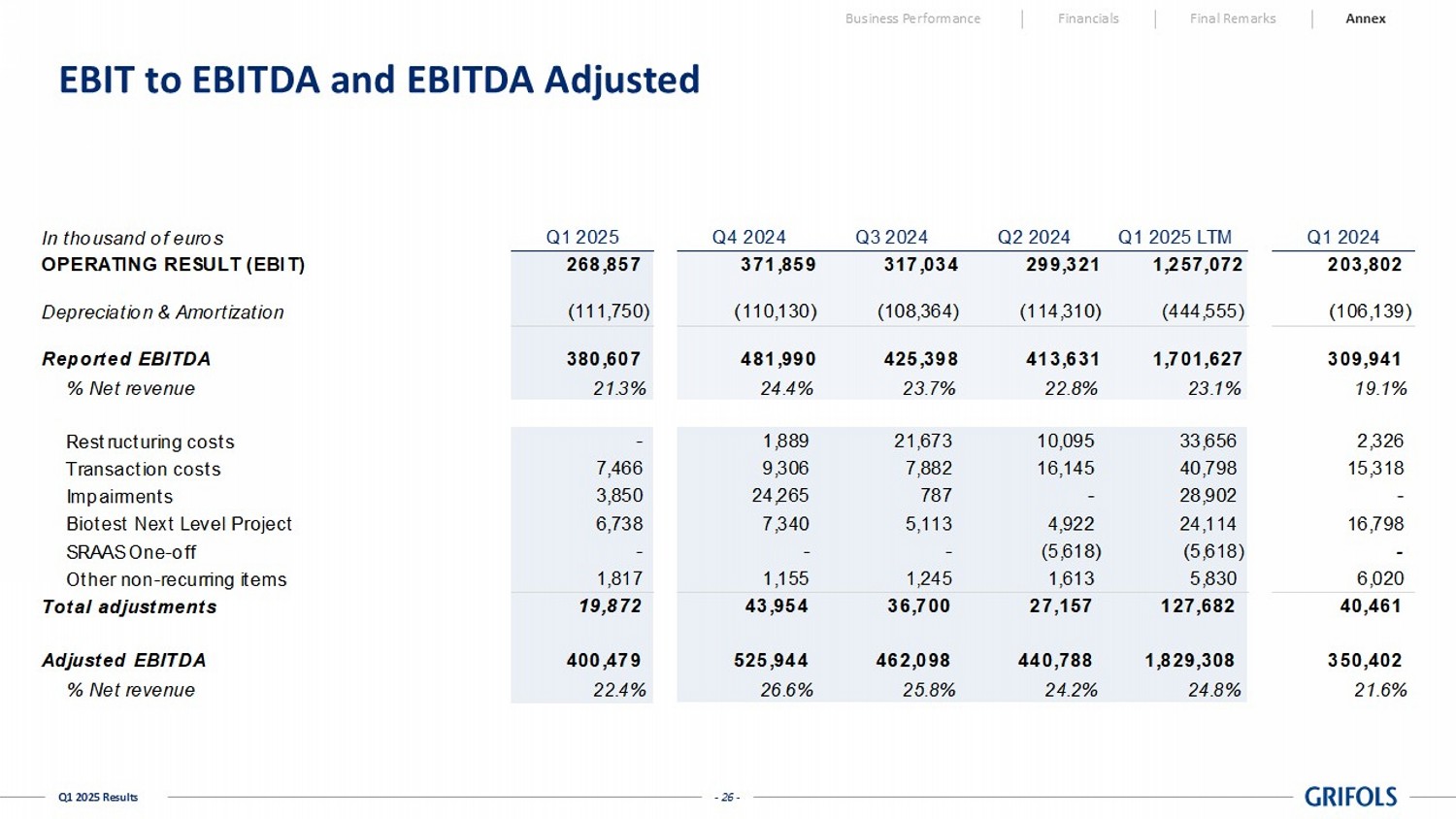 - 26 - Q1 2025 Results EBIT to EBITDA and EBITDA Adjusted Business Performance Financials Final Remarks Annex In thousand of euros 268,857 371,859 317,034 299,321 1,257,072 203,802 (111,750) (110,130) (108,364) (114,310) (444,555) (106,139) Reported EBITDA 380,607 481,990 425,398 413,631 1,701,627 309,941 % Net revenue 21.3% 24.4% 23.7% 22.8% 23.1% 19.1% Restructuring costs - 1,889 21,673 10,095 33,656 2,326 Transaction costs 7,466 9,306 7,882 16,145 40,798 15,318 Impairments 3,850 24,265 787 - 28,902 - Biotest Next Level Project 6,738 7,340 5,113 4,922 24,114 16,798 SRAAS One-off - - - (5,618) (5,618) - Other non-recurring items 1,817 1,155 1,245 1,613 5,830 6,020 Total adjustments 19,872 43,954 36,700 27,157 127,682 40,461 Adjusted EBITDA 400,479 525,944 462,098 440,788 1,829,308 350,402 % Net revenue 22.4% 26.6% 25.8% 24.2% 24.8% 21.6% Q1 2024Q1 2025 Q2 2024 Q1 2025 LTMQ3 2024Q4 2024 Depreciation & Amortization OPERATING RESULT (EBIT)