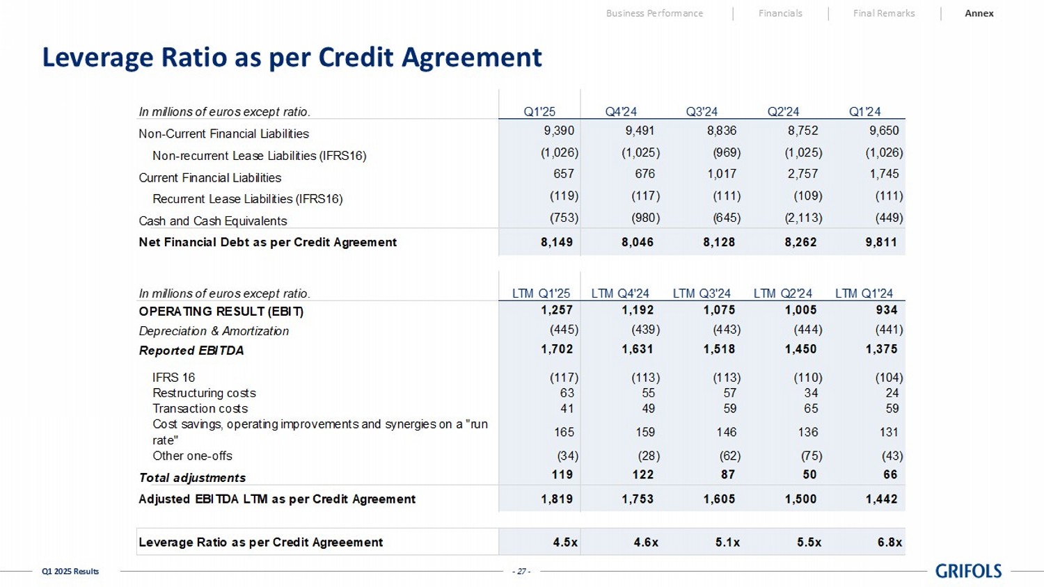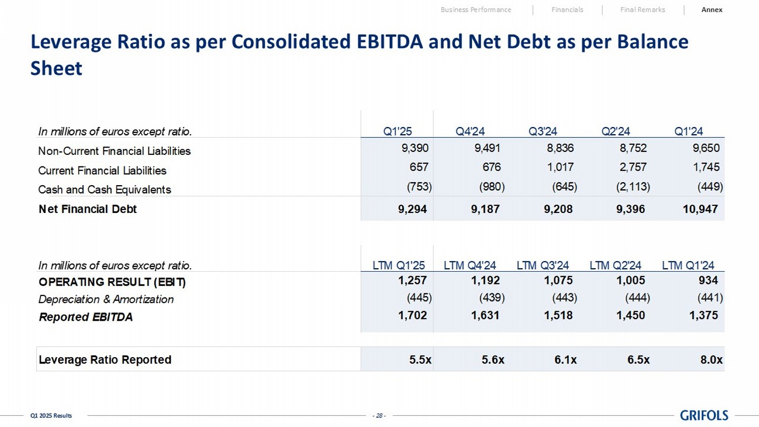 - 27 - Q1 2025 Results Leverage Ratio as per Credit Agreement Business Performance Financials Final Remarks Annex In millions of euros except ratio. Q1'25 Q4'24 Q3'24 Q2'24 Q1'24 Non-Current Financial Liabilities 9,390 9,491 8,836 8,752 9,650 Non-recurrent Lease Liabilities (IFRS16) (1,026) (1,025) (969) (1,025) (1,026) Current Financial Liabilities 657 676 1,017 2,757 1,745 Recurrent Lease Liabilities (IFRS16) (119) (117) (111) (109) (111) Cash and Cash Equivalents (753) (980) (645) (2,113) (449) Net Financial Debt as per Credit Agreement 8,149 8,046 8,128 8,262 9,811 In millions of euros except ratio. LTM Q1'25 LTM Q4'24 LTM Q3'24 LTM Q2'24 LTM Q1'24 OPERATING RESULT (EBIT) 1,257 1,192 1,075 1,005 934 Depreciation & Amortization (445) (439) (443) (444) (441) Reported EBITDA 1,702 1,631 1,518 1,450 1,375 IFRS 16 (117) (113) (113) (110) (104) Restructuring costs 63 55 57 34 24 Transaction costs 41 49 59 65 59 Cost savings, operating improvements and synergies on a "run rate" 165 159 146 136 131 Other one-offs (34) (28) (62) (75) (43) Total adjustments 119 122 87 50 66 Adjusted EBITDA LTM as per Credit Agreement 1,819 1,753 1,605 1,500 1,442 Leverage Ratio as per Credit Agreeement 4.5x 4.6x 5.1x 5.5x 6.8x - 28 - Q1 2025 Results Leverage Ratio as per Consolidated EBITDA and Net Debt as per Balance Sheet Business Performance Financials Final Remarks Annex In millions of euros except ratio.