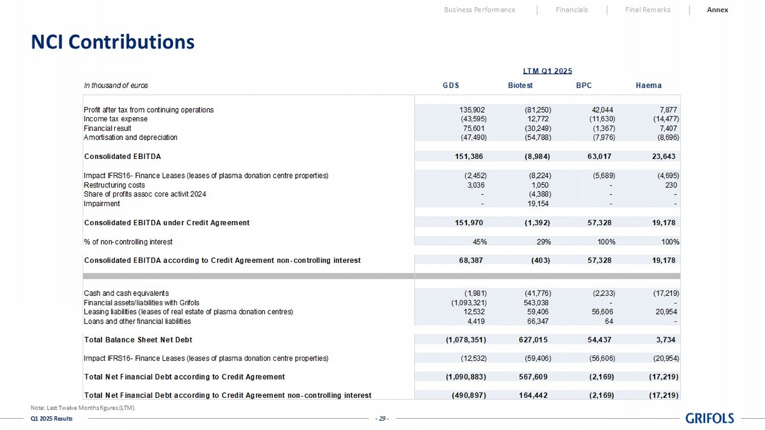 LTM Q1'25 LTM Q4'24 LTM Q3'24 LTM Q2'24 LTM Q1'24 OPERATING RESULT (EBIT) 1,257 1,192 1,075 1,005 934 Depreciation & Amortization (445) (439) (443) (444) (441) Reported EBITDA 1,702 1,631 1,518 1,450 1,375 Leverage Ratio Reported 5.5x 5.6x 6.1x 6.5x 8.0x - 29 - Q1 2025 Results NCI Contributions Business Performance Financials Final Remarks Annex In thousand of euros GDS Biotest BPC Haema Profit after tax from continuing operations 135,902 (81,250) 42,044 7,877 Income tax expense (43,595) 12,772 (11,630) (14,477) Financial result 75,601 (30,249) (1,367) 7,407 Amortisation and depreciation (47,490) (54,788) (7,976) (8,696) Consolidated EBITDA 151,386 (8,984) 63,017 23,643 Impact IFRS16- Finance Leases (leases of plasma donation centre properties) (2,452) (8,224) (5,689) (4,695) Restructuring costs 3,036 1,050 - 230 Share of profits assoc core activit 2024 - (4,388) - - Impairment - 19,154 - - Consolidated EBITDA under Credit Agreement 151,970 (1,392) 57,328 19,178 % of non-controlling interest 45% 29% 100% 100% Consolidated EBITDA according to Credit Agreement non-controlling interest 68,387 (403) 57,328 19,178 Cash and cash equivalents (1,981) (41,776) (2,233) (17,219) Financial assets/liabilities with Grifols (1,093,321) 543,038 - - Leasing liabilities (leases of real estate of plasma donation centres) 12,532 59,406 56,606 20,954 Loans and other financial liabilities 4,419 66,347 64 - Total Balance Sheet Net Debt (1,078,351) 627,015 54,437 3,734 Impact IFRS16- Finance Leases (leases of plasma donation centre properties) (12,532) (59,406) (56,606) (20,954) Total Net Financial Debt according to Credit Agreement (1,090,883) 567,609 (2,169) (17,219) Total Net Financial Debt according to Credit Agreement non-controlling interest (490,897) 164,442 (2,169) (17,219) LTM Q1 2025 Note: Last Twelve Months figures (LTM).