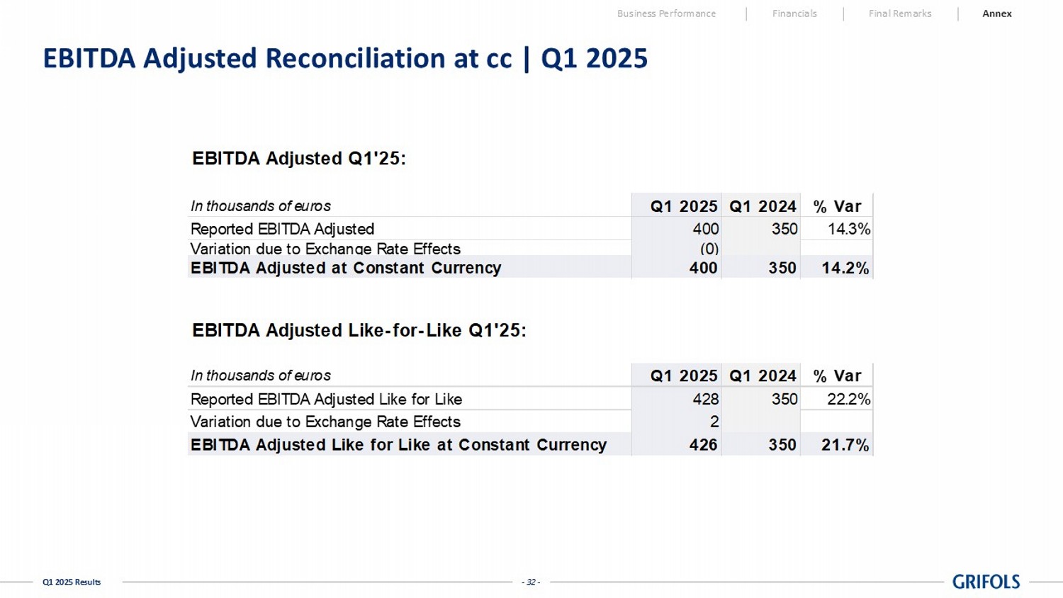 Business Performance Financials Final Remarks Annex In million Euros Q1'25 Q1'24 In million Euros Q1'25 Q1'24 EBITDA Adjusted 400 350 Net Cash Flow From Operating Activities 1 135 (165) Changes in working capital (128) (339) Net Cash Flow From Investing Activities 1 (197) (88) CAPEX (49) (38) Free Cash Flow (62) (253) R&D and IT (39) (22) Biotest Shares Acquisition (18) - Taxes (3) (4) Free Cash Flow pre-M&A (44) (253) Interests (55) (106) Others (86) -66 FCF Before Extraordinary Items 41 (225) Extraordinary Growth CAPEX (79) (23) Restructuring and transaction costs (6) (5) Free Cash Flow (44) (253) 1 Statement of Cash Flow According IFRS-EU - 31 - Q1 2025 Results Net Revenue Reconciliation at cc | Q1 2025 In thousands of euros Q1 2025 Q1 2024 % Var Reported U.S. + Canada Net Revenues 1,025,190 925,326 10.8% Variation due to Exchange Rate Effects (40,316) Reported U.S. + Canada Net Revenues at Constant Currency 984,874 925,326 6.4% In thousands of euros Q1 2025 Q1 2024 % Var Reported EU Net Revenues 390,275 331,427 17.8% Variation due to Exchange Rate Effects (676) Reported EU Net Revenues at Constant Currency 389,599 331,427 17.6% In thousands of euros Q1 2025 Q1 2024 % Var Reported ROW Net Revenues 370,344 368,952 0.4% Variation due to Exchange Rate Effects 1,555 Reported ROW Net Revenues at Constant Currency 371,899 368,952 0.8% In thousands of euros Q1 2025 Q1 2024 % Var Reported Net Revenues 1,785,809 1,625,705 9.8% Variation due to Exchange Rate Effects (39,437) Net Revenues at Constant Currency 1,746,372 1,625,705 7.4% In thousands of euros Q1 2025 Q1 2024 % Var Reported Biopharma Net Revenues 1,521,160 1,394,703 9.1% Variation due to Exchange Rate Effects (33,923) Reported Biopharma Net Revenues at Constant Currency 1,487,237 1,394,703 6.6% In thousands of euros Q1 2025 Q1 2024 % Var Reported Diagnostic Net Revenues 170,043 158,283 7.4% Variation due to Exchange Rate Effects (3,451) Reported Diagnostic Net Revenues at Constant Currency 166,592 158,283 5.2% In thousands of euros Q1 2025 Q1 2024 % Var Reported Bio Supplies Net Revenues 32,557 27,013 20.5% Variation due to Exchange Rate Effects (1,243) Reported Bio Supplies Net Revenues at Constant Currency 31,314 27,013 15.9% In thousands of euros Q1 2025 Q1 2024 % Var Reported Others & Intersegments Net Revenues 62,050 45,707 35.8% Variation due to Exchange Rate Effects (820) Reported Other & Intersegments Net Revenues at Constant Currency 61,230 45,707 34.0% Business Performance Financials Final Remarks Annex - 32 - Q1 2025 Results EBITDA Adjusted Reconciliation at cc | Q1 2025 Business Performance Financials Final Remarks Annex EBITDA Adjusted Q1'25: In thousands of euros Q1 2025 Q1 2024 % Var Reported EBITDA Adjusted 400 350 14.3% Variation due to Exchange Rate Effects (0) EBITDA Adjusted at Constant Currency 400 350 14.2% EBITDA Adjusted Like-for-Like Q1'25: In thousands of euros Q1 2025 Q1 2024 % Var Reported EBITDA Adjusted Like for Like 428 350 22.2% Variation due to Exchange Rate Effects 2 EBITDA Adjusted Like for Like at Constant Currency 426 350 21.7%