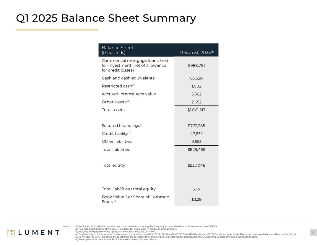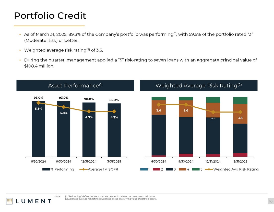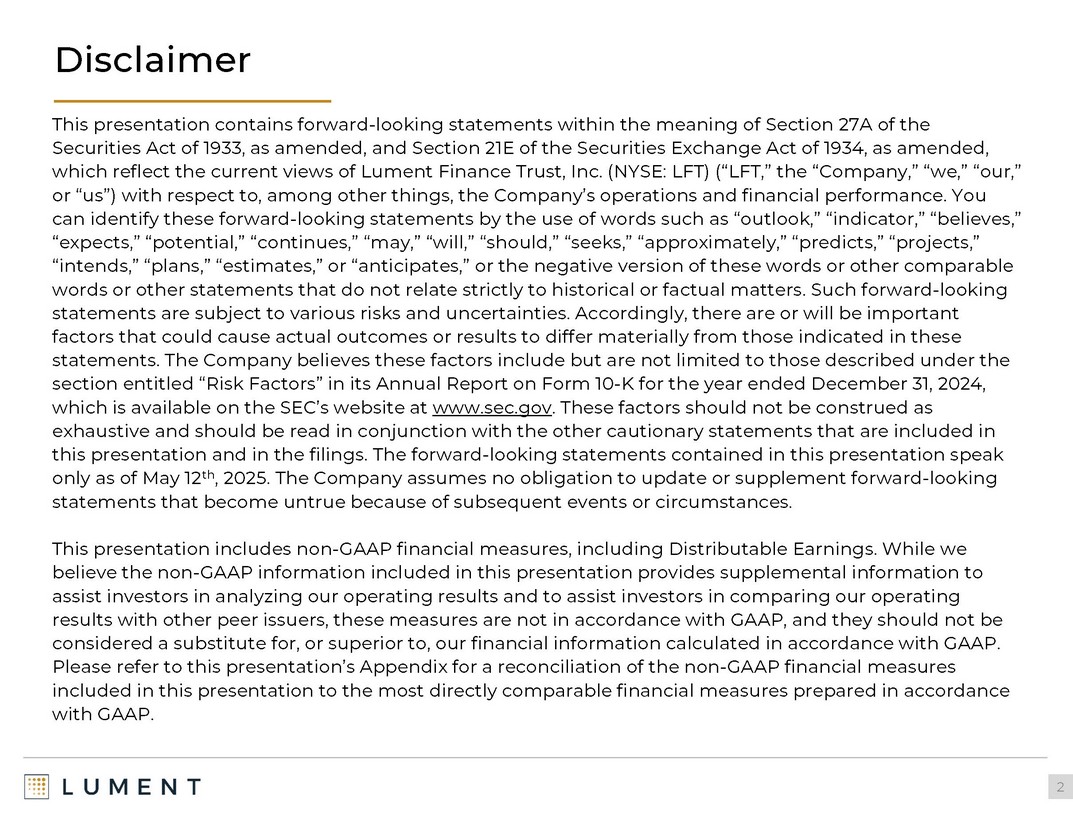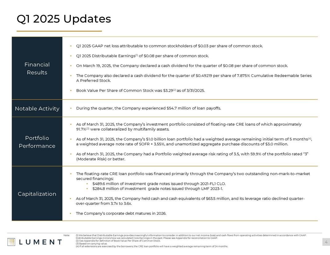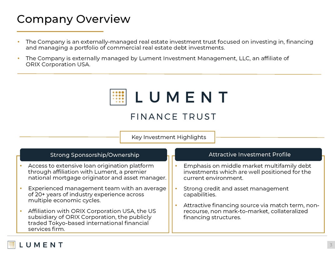 2025年5月 Lument Finance Trust 2025年第1四半期決算補足免責事項 2 本プレゼンテーションには、1933年証券法第27A条(改正後)および1934年証券取引法第21E条(改正後)に定義される意味での将来見通しに関する記述が含まれており、これらは、特に当社の事業および財務業績に関するLument Finance Trust, Inc.これらの将来見通しに関する記述は、「見通し」、「指標」、「確信」、「期待」、「可能性」、「継続」、「可能性」、「予定」、「はずみ」、「追求」、「おおよそ」、「予測」、「プロジェクト」、「意図」、「計画」、「見積もり」、「予想」などの言葉、またはこれらの言葉の否定バージョン、あるいは他の類似の言葉、あるいは過去または事実に厳密には関係しないその他の記述の使用により識別することができます。このような将来の見通しに関する記述には、さまざまなリスクや不確実性が伴います。従って、実際の結果や業績がこれらの記述と大きく異なる可能性がある重要な要因が存在するか、または存在する予定です。これらの要因には、SECのウェブサイト(www.sec.gov )で入手可能な2024年12月31日終了年度の年次報告書(Form 10 - K)の「リスク要因」の項に記載されているものが含まれますが、これらに限定されるものではないと当社は考えています。これらの要因はすべてを網羅したものと解釈されるべきではなく、本プレゼンテーションおよび提出書類に含まれるその他の注意事項と合わせて読む必要があります。本プレゼンテーションに含まれる将来の見通しに関する記述は、2025年5月12日時点のものです。当社は、後発事象や状況により真実でなくなった将来予想に関する記述を更新または補足する義務を負うものではありません。本プレゼンテーションには、分配可能利益を含む非 GAAP 財務指標が含まれています。当社は、本プレゼンテーションに含まれる非GAAPベースの情報は、投資家が当社の経営成績を分析する際の補助的な情報、および投資家が当社の経営成績を他の同業他社と比較する際の補助的な情報を提供するものであると考えていますが、これらの指標はGAAPに準拠したものではなく、GAAPに準拠して算出された当社の財務情報に代わるもの、またはGAAPに準拠して算出された財務情報に優るものとみなされるべきではありません。本プレゼンテーションに含まれる非GAAPベースの財務指標と、GAAPに基づいて作成された最も直接的に比較可能な財務指標との調整表については、本プレゼンテーションの付録をご参照ください。