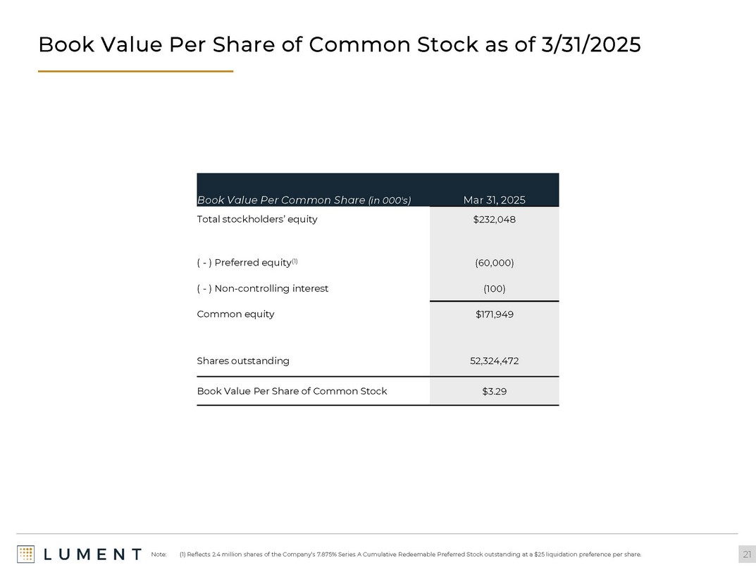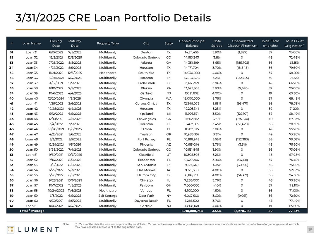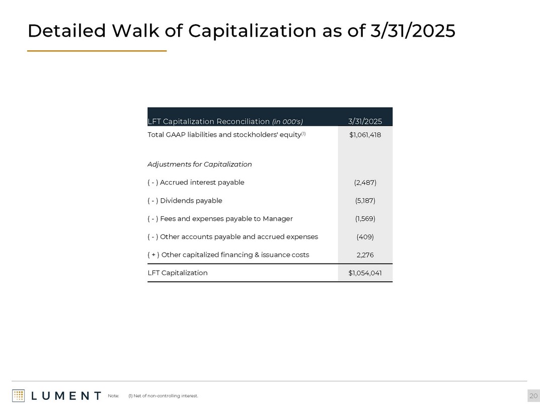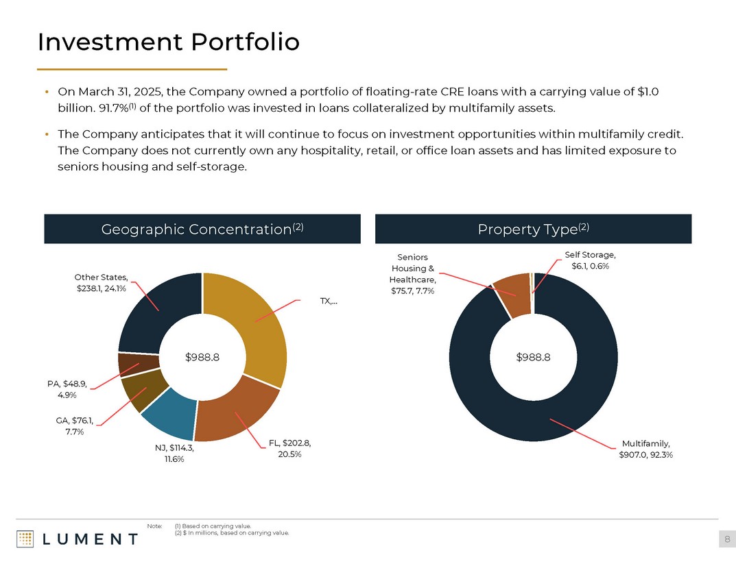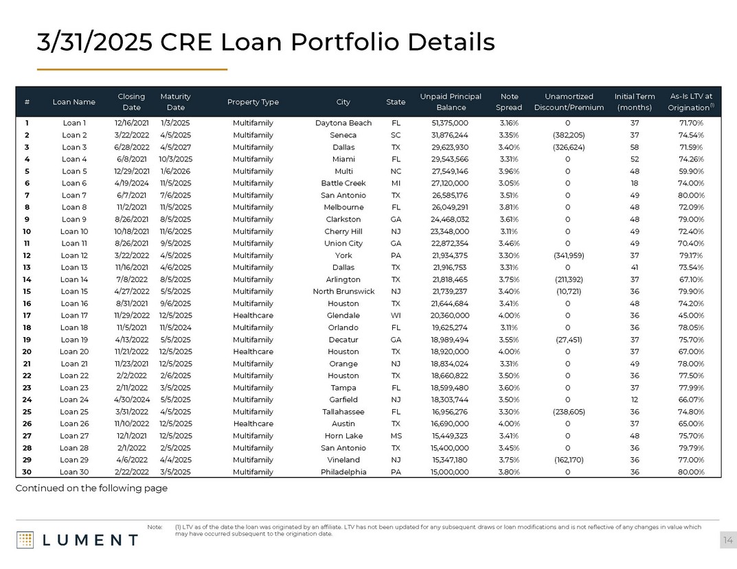 2025年5月 Lument Finance Trust 2025年第1四半期決算補足免責事項 2 本プレゼンテーションには、1933年証券法第27A条(改正後)および1934年証券取引法第21E条(改正後)に定義される意味での将来見通しに関する記述が含まれており、これらは、特に当社の事業および財務業績に関するLument Finance Trust, Inc.これらの将来見通しに関する記述は、「見通し」、「指標」、「確信」、「期待」、「可能性」、「継続」、「可能性」、「予定」、「はずみ」、「追求」、「おおよそ」、「予測」、「プロジェクト」、「意図」、「計画」、「見積もり」、「予想」などの言葉、またはこれらの言葉の否定バージョン、あるいは他の類似の言葉、あるいは過去または事実に厳密には関係しないその他の記述の使用により識別することができます。このような将来の見通しに関する記述には、さまざまなリスクや不確実性が伴います。従って、実際の結果や業績がこれらの記述と大きく異なる可能性がある重要な要因が存在するか、または存在する予定です。これらの要因には、SECのウェブサイト(www.sec.gov )で入手可能な2024年12月31日終了年度の年次報告書(Form 10 - K)の「リスク要因」の項に記載されているものが含まれますが、これらに限定されるものではないと当社は考えています。これらの要因はすべてを網羅したものと解釈されるべきではなく、本プレゼンテーションおよび提出書類に含まれるその他の注意事項と合わせて読む必要があります。本プレゼンテーションに含まれる将来の見通しに関する記述は、2025年5月12日時点のものです。当社は、後発事象や状況により真実でなくなった将来予想に関する記述を更新または補足する義務を負うものではありません。本プレゼンテーションには、分配可能利益を含む非 GAAP 財務指標が含まれています。当社は、本プレゼンテーションに含まれる非GAAPベースの情報は、投資家が当社の経営成績を分析する際の補助的な情報、および投資家が当社の経営成績を他の同業他社と比較する際の補助的な情報を提供するものであると考えていますが、これらの指標はGAAPに準拠したものではなく、GAAPに準拠して算出された当社の財務情報に代わるもの、またはGAAPに準拠して算出された財務情報に優るものとみなされるべきではありません。本プレゼンテーションに含まれる非GAAPベースの財務指標と、GAAPに基づいて作成された最も直接的に比較可能な財務指標との調整表については、本プレゼンテーションの付録をご参照ください。