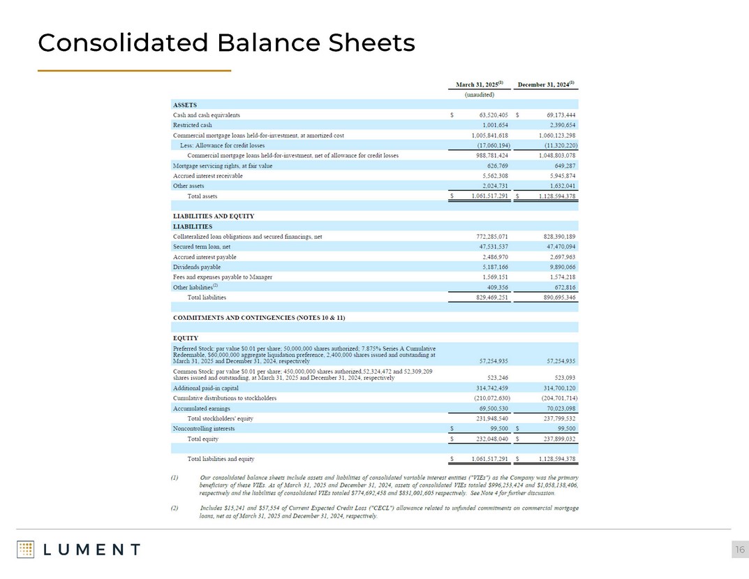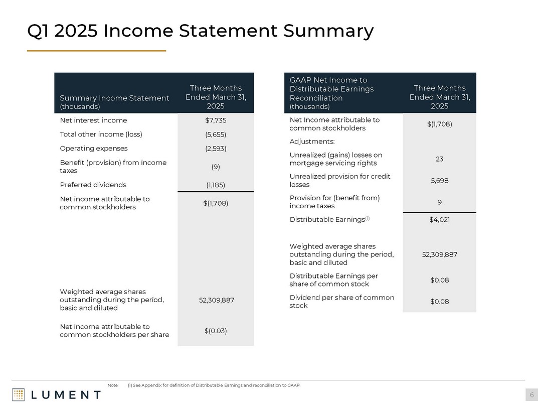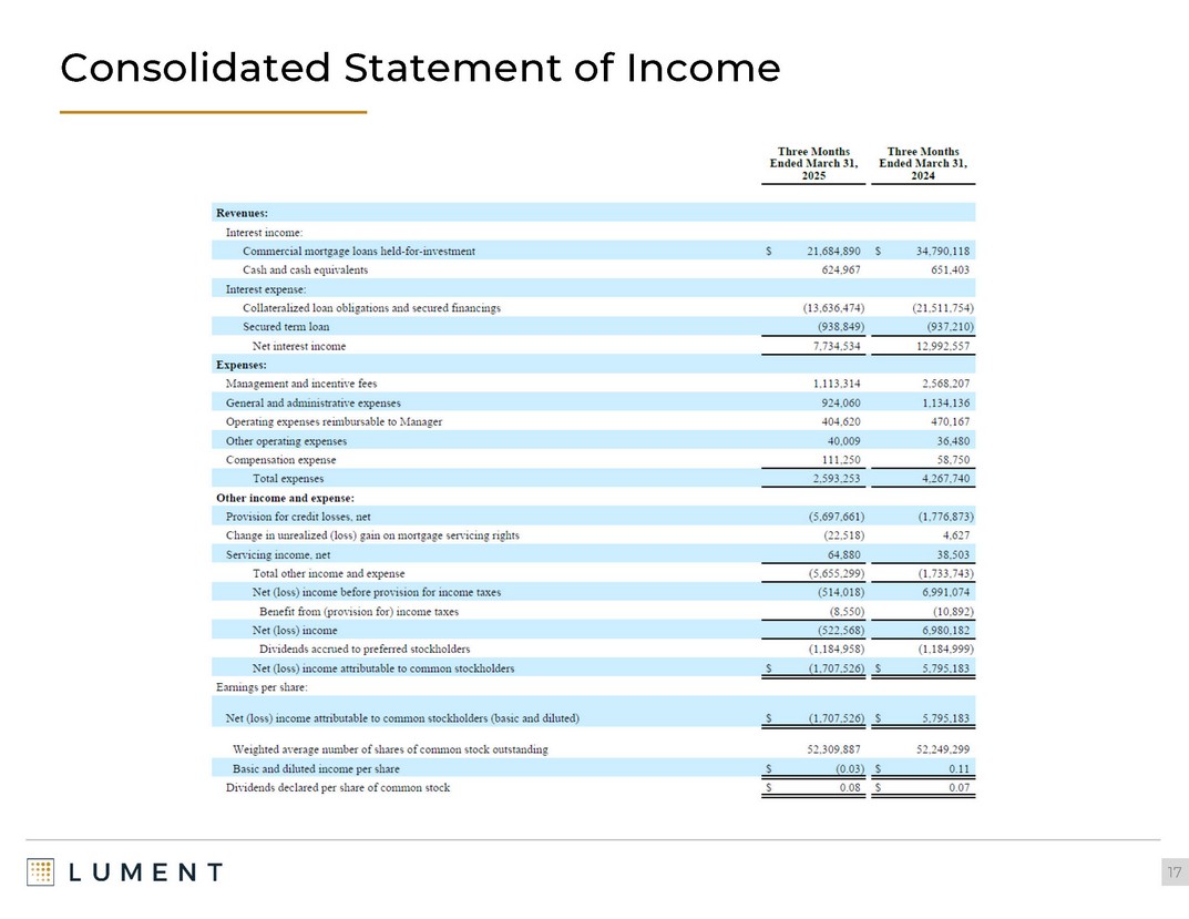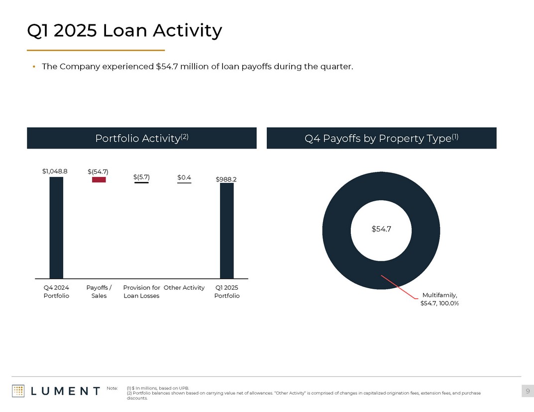 ニューヨーク2025年5月12日PR Newswire=共同通信JBN】ルメント・ファイナンス・トラスト(NYSE:LFT)(「当社」、「LFT」または「会社」)は本日、第1四半期決算を発表した。第1四半期のGAAPベースの普通株主に帰属する純損失は170万ドル(普通株式1株当たり0.03ドル)でした。第1四半期の分配可能利益は400万ドル、普通株式1株当たり0.08ドルでした。当社は業績の詳細なプレゼンテーションも発表しており、www.lumentfinancetrust.com。