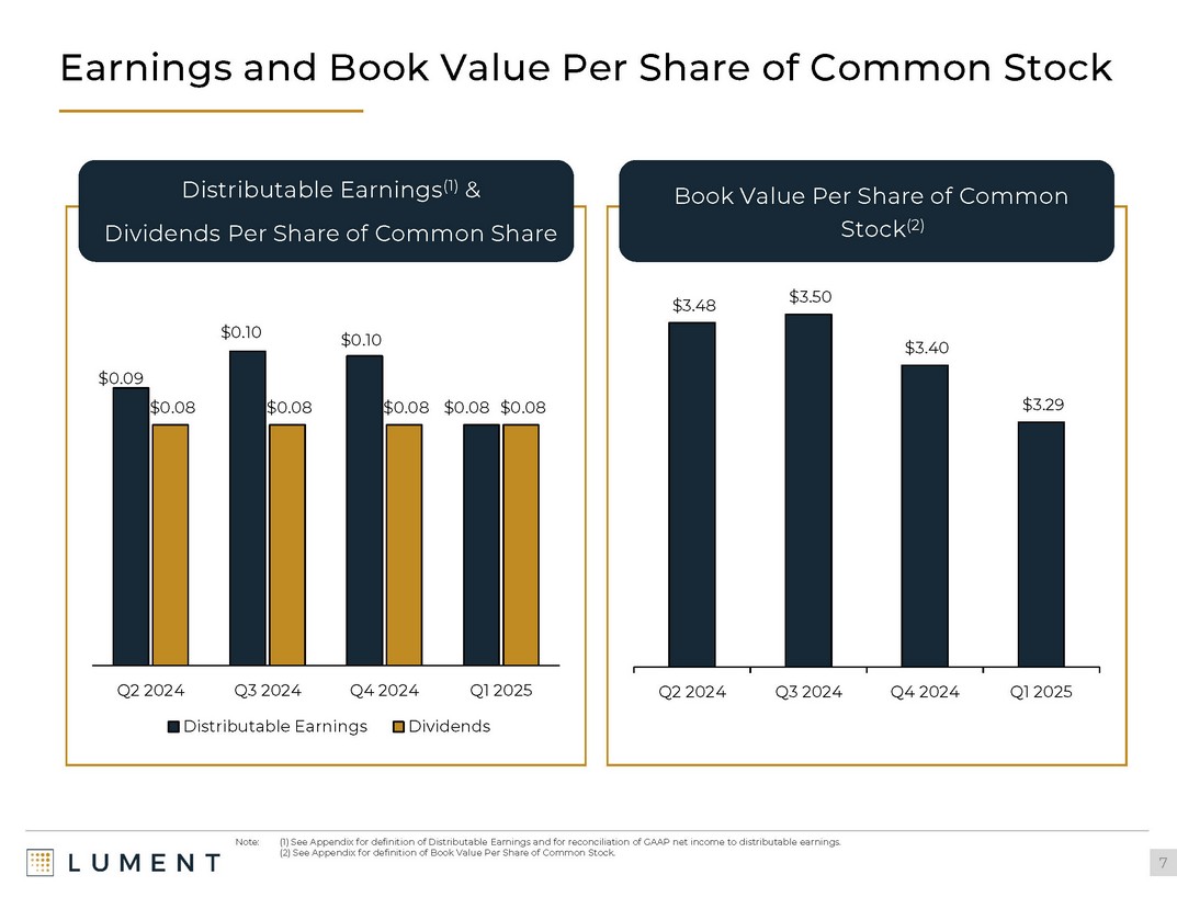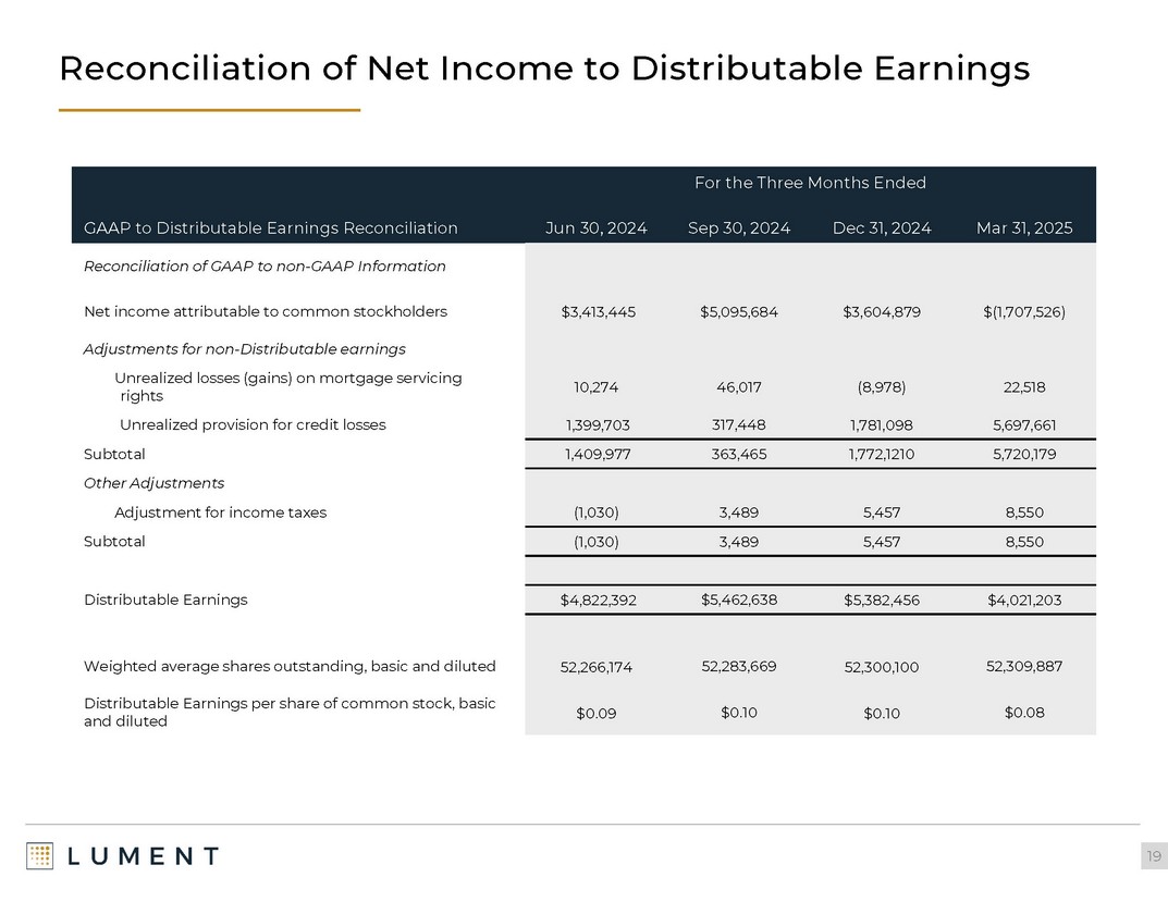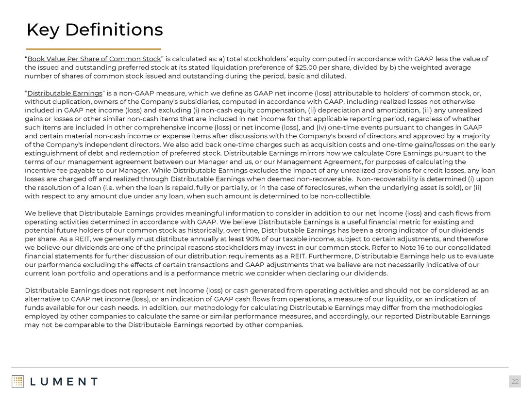 分配可能利益は非 GAAP 指標であり、GAAP に基づいて計算された普通株式保有者に帰属する当期純利益(損失)(GAAP の当期純利益(損失)に含まれない実現損失を含み、(i)現金支出を伴わない株式報酬、(ii)減価償却費および償却費、(iii)未実現損益、または該当する報告期間の当期純利益に含まれるその他類似の非現金項目を除いたものと定義しています、(iv)GAAPの変更に従った一時的な事象、および当社の取締役会と協議し、当社の独立取締役の過半数によって承認された特定の重要な非現金損益項目。分配可能利益は、当社のマネジャーであるLument Investment Management, LLC(以下「マネジャー」)とのマネジメント契約の条項に従い、マネジャーに支払う報奨金を計算する目的で「コア利益」を計算する方法を反映したものです。