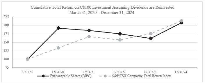 The Corporation may from time-to-time, subject to applicable law, purchase exchangeable shares for cancellation in the open market, provided that any necessary approval has been obtained. In November 2024, the TSX accepted a notice filed by the Corporation of its intention to renew its normal course issuer bid to repurchase outstanding exchangeable shares, which permits the Corporation to repurchase up to 10% of the total public float of exchangeable shares, or up to 11,889,600 exchangeable shares. Repurchases under our normal course issuer bid were authorized to commence on December 2, 2024 and our normal course issuer bid will terminate on December 1, 2025, or earlier should we complete our repurchases prior to such date. The actual number of exchangeable shares to be purchased and the timing of such purchases will be determined by the Corporation, and all purchases will be made through the facilities of the TSX, the NYSE and/or Canadian and U.S. alternative trading systems, if eligible. For the year ended December 31, 2024, we did not repurchase any of our exchangeable shares. A copy of the Notice of Intention for each normal course issuer bid may be obtained without charge by contacting Investor Relations by phone at 1-416-956-5129 (toll free in North America at 1-866-989-0311) or by email at bip.enquiries@brookfield.com.