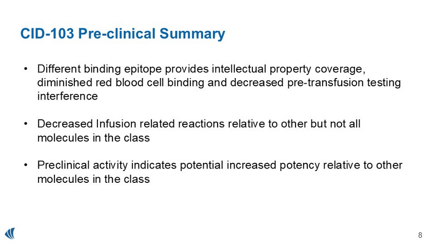 A promising and advancing pipeline Phase 1 IND/CTA enabling Preclinical Discovery Focus Approach CID - 103 (anti - CD38 monoclonal antibody) ITP (Immune Thrombocytopenia) AMR (Anti - body Mediated Rejection) AA (Aplastic Anemia) PTLD ( Post - transplant lymphoproliferative disorder) Monotherapy (IV) 6 CID - 103 Pre - clinical Summary • Different binding epitope provides intellectual property coverage, diminished red blood cell binding and decreased pre - transfusion testing interference • Decreased Infusion related reactions relative to other but not all molecules in the class • Preclinical activity indicates potential increased potency relative to other molecules in the class 7