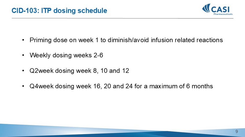 CID - 103: ITP dosing schedule • Priming dose on week 1 to diminish/avoid infusion related reactions • Weekly dosing weeks 2 - 6 • Q2week dosing week 8, 10 and 12 • Q4week dosing week 16, 20 and 24 for a maximum of 6 months 8 CID - 103: Approved ITP Study Design Part A Study Schematic Dose Escalation Study design allows for the testing of potential lower therapeutic doses and for testing of intermediate/higher dose levels.