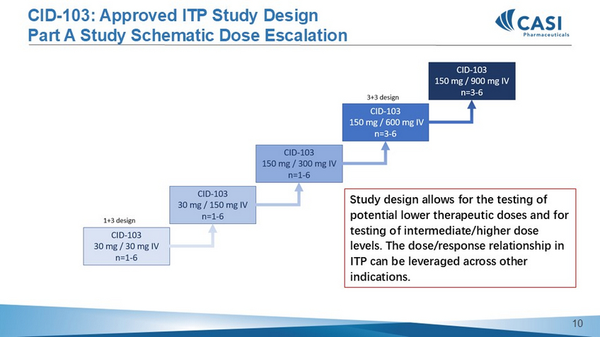 CID - 103: Approved ITP Study Design Part A Study Schematic Dose Escalation Study design allows for the testing of potential lower therapeutic doses and for testing of intermediate/higher dose levels. The dose/response relationship in ITP can be leveraged across other indications.