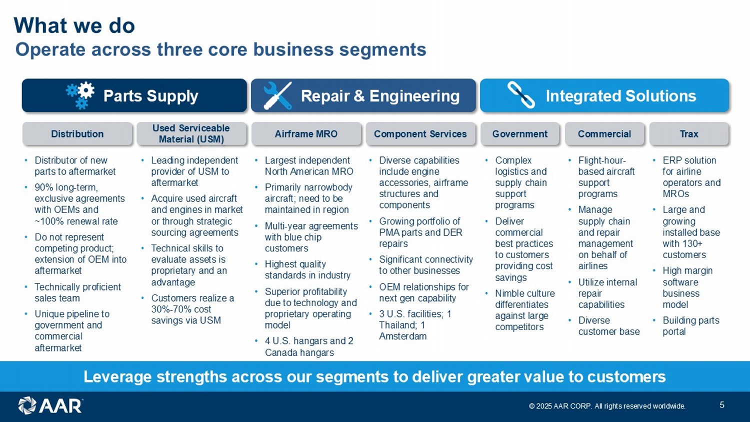 All rights reserved worldwide. 4 AAR transformation: a focused company positioned for growth • Disparate portfolio with little transparency • Low operating margins • In 2019, embarked on strategy to focus on core aviation services offering and improve margins • Focused portfolio in core aftermarket aviation services with greater transparency • Exited / restructured multiple non - core businesses / contracts • Completed two acquisitions (Trax and Triumph Product Support) • Significantly expanded margins • Pure play provider of aftermarket aviation services • Differentiated portfolio with significant intellectual property • Organic and inorganic investments to drive growth and margin expansion Aviation Services 91% Expeditionary Services 9% Parts Supply , 40% Repair & Engineering , 32% Integrated Solutions , 24% Expeditionary Services , 4% $ 105 $ 318 7.2% margin 11.7% margin Revenue Mix Adjusted EBITDA and % margin Revenue Mix Adjusted EBITDA and % margin Parts Supply Repair & Engineering Integrated Solutions ~13% margin Revenue Mix Adjusted EBITDA and % margin Note: Financials for Past represent FY2015 and Present represent LTM Q3 FY2025. See Appendix for reconciliation of Non - GAAP fin ancial measures Past Present Future Businesses divested since FY2015: • Airlift • Composites Manufacturing • Landing Gear • Metals Fabrication Operations © 2025 AAR CORP.