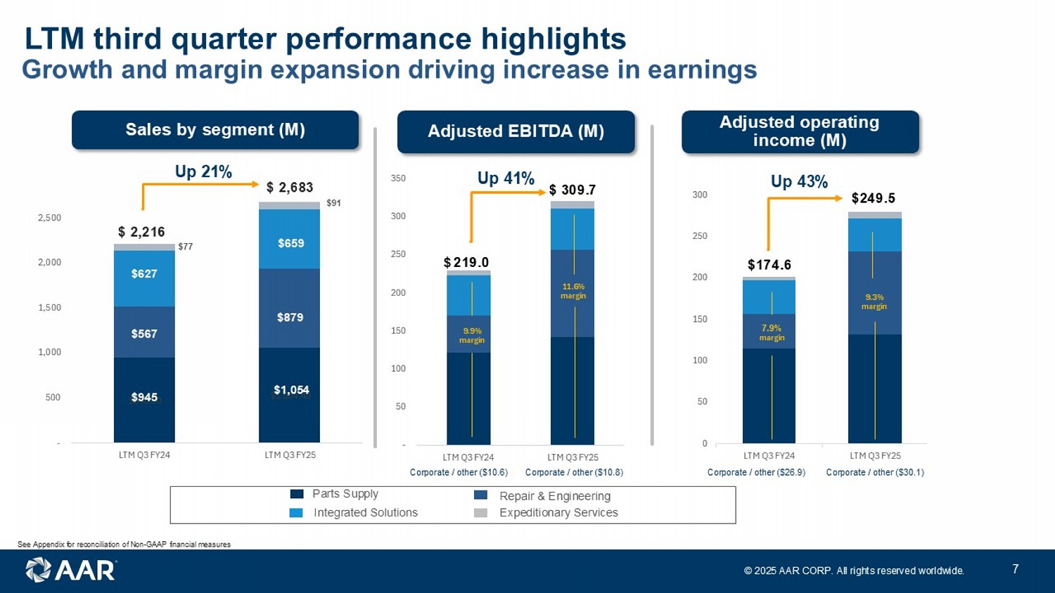 All rights reserved worldwide. 6 Business highlights Financial statistics (Q3 FY25 LTM) • Sales of $1,054 million • Adjusted EBITDA of $141.8 million • Adjusted EBITDA margin of 13.4% Parts Supply Financial statistics (Q3 FY25 LTM) • Sales of $879 million • Adjusted EBITDA of $115.0 million • Adjusted EBITDA margin of 13.1% Repair & Engineering • Add • add Financial statistics (Q3 FY25 LTM) • Sales of $659 million • Adjusted EBITDA of $54.6 million • Adjusted EBITDA margin of 8.3% Integrated Solutions Highlights • Thirteen consecutive quarters of double - digit y - o - y sales growth in Distribution • Multiple recent new business wins across multiple suppliers (Chromalloy, Unison, Whippany, etc.) Highlights • Integration of Product Support acquisition near completion; expect $10M in cost synergies realized in FY26 • Expansions of Oklahoma City and Miami hangars in process Highlights • Strong momentum for Trax software with recent new business wins with Rolls - Royce, SIA Engineering and Cathay Pacific • Opportunity to help U.S. Government achieve cost savings by utilizing AAR services See Appendix for reconciliation of Non - GAAP financial measures © 2025 AAR CORP.