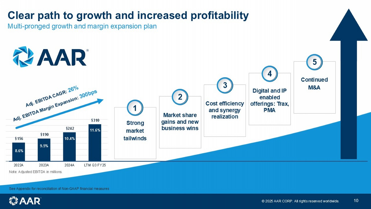 All rights reserved worldwide. 9 Capital allocation framework and net leverage Q4 FY24 Q1 FY25 Q2 FY25 Q3 FY25 3.17x 3.31x 3.30x 3.58x March 1, 2024 Product Support acquisition Lower by 0.52x Pro forma net debt to pro forma adjusted EBITDA 3.06x See Appendix for reconciliation of Non - GAAP financial measures Maintain flexible balance sheet Organic investment to drive growth Opportunistic acquisitions Return to shareholders • Delevered since Product Support acquisition • Target net leverage of 2.0x – 2.5x EBITDA • Max leverage ratio of ~3.75x EBITDA • Support new business wins in Parts Supply • Strategic Airframe MRO expansion • Digital and IP enabled offerings: Trax and PMA • Adherence to strategic filters and financial criteria • Focused on core segments • Increase intellectual property in portfolio • Repurchased $97.5M of stock through Q3 FY25 with remaining authorization of $52.5M • Will evaluate further usage and expansion based on alternative organic and inorganic opportunities © 2025 AAR CORP.