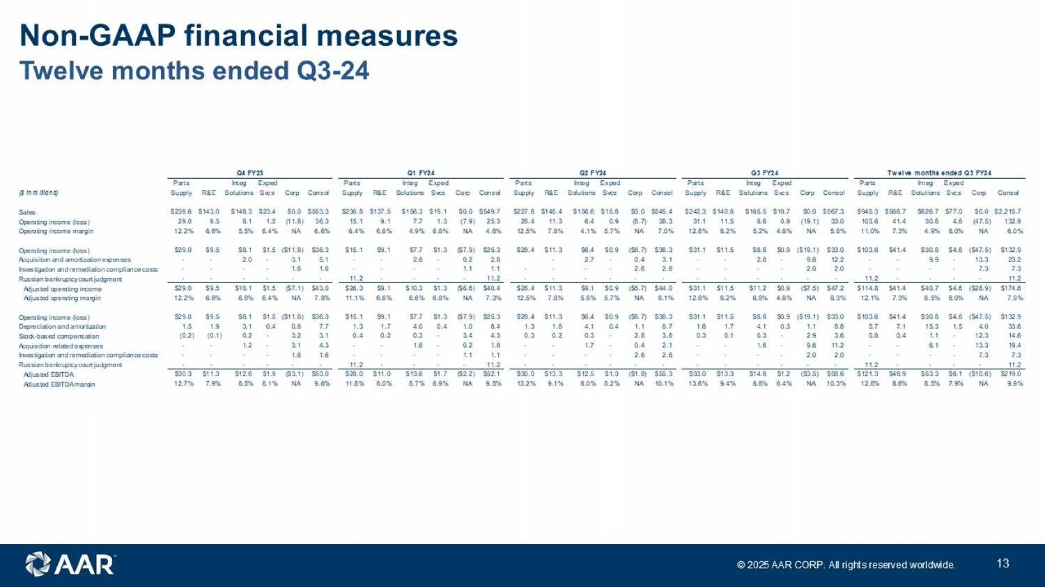 All rights reserved worldwide. 14 Twelve months ended Q3 - 25 Non - GAAP financial measures Q4 FY24 Q1 FY25 Q2 FY25 Q3 FY25 Twelve months ended Q3 FY25 Parts Integ Exped Parts Integ Exped Parts Integ Exped Parts Integ Exped Parts Integ Exped ($ in millions) Supply R&E Solutions Svcs Corp Consol Supply R&E Solutions Svcs Corp Consol Supply R&E Solutions Svcs Corp Consol Supply R&E Solutions Svcs Corp Consol Supply R&E Solutions Svcs Corp Consol Sales $260.3 $216.4 $163.5 $16.3 $0.0 $656.5 $249.7 $217.6 $168.9 $25.5 $0.0 $661.7 $273.7 $228.8 $163.4 $20.2 $0.0 $686.1 $270.7 $215.9 $162.9 $28.7 $0.0 $678.2 $1,054.4 $878.7 $658.7 $90.7 $0.0 $2,682.5 Operating income (loss) 35.2 20.6 1.2 0.4 (24.8) 32.6 30.1 21.1 7.7 (1.7) (13.8) 43.4 31.6 22.8 6.5 2.2 (65.4) (2.3) 45.4 19.0 9.6 6.4 (9.3) 71.1 142.3 83.5 25.0 7.3 (113.3) 144.8 Operating income margin 13.5% 9.5% 0.7% 2.5% NA 5.0% 12.1% 9.7% 4.6% -6.7% NA 6.6% 11.5% 10.0% 4.0% 10.9% NA -0.3% 16.8% 8.8% 5.9% 22.3% NA 10.5% 13.5% 9.5% 3.8% 8.0% NA 5.4% Sales $260.3 $216.4 $163.5 $16.3 $0.0 $656.5 $249.7 $217.6 $168.9 $25.5 $0.0 $661.7 $273.7 $228.8 $163.4 $20.2 $0.0 $686.1 $270.7 $215.9 $162.9 $28.7 $0.0 $678.2 $1,054.4 $878.7 $658.7 $90.7 $0.0 $2,682.5 Contract termination cost (benefit) - - 2.3 - - 2.3 - - - (9.5) - (9.5) - - - - - - - - - (4.0) - (4.0) - - 2.3 (13.5) - (11.2) Adjusted sales $260.3 $216.4 $165.8 $16.3 $0.0 $658.8 $249.7 $217.6 $168.9 $16.0 $0.0 $652.2 $273.7 $228.8 $163.4 $20.2 $0.0 $686.1 $270.7 $215.9 $162.9 $24.7 $0.0 $674.2 $1,054.4 $878.7 $661.0 $77.2 $0.0 $2,671.3 Operating income (loss) $35.2 $20.6 $1.2 $0.4 ($24.8) $32.6 $30.1 $21.1 $7.7 ($1.7) ($13.8) $43.4 $31.6 $22.8 $6.5 $2.2 ($65.4) ($2.3) $45.4 $19.0 $9.6 $6.4 ($9.3) $71.1 $142.3 $83.5 $25.0 $7.3 ($113.3) $144.8 Acquisition, integration and amortization expenses - 3.7 3.3 - 11.6 18.6 - 4.6 2.8 - 1.6 9.0 - 5.3 1.8 - 0.1 7.2 - 4.9 2.8 - (0.2) 7.5 - 18.5 10.7 - 13.1 42.3 FCPA settlement and investigation costs - - - - 4.8 4.8 - - - - 5.0 5.0 - - - - 59.2 59.2 - - - - 1.1 1.1 - - - - 70.1 70.1 Contract termination cost (benefit) - - 4.8 - - 4.8 - - - 3.2 - 3.2 - - - - - - - - - (3.0) - (3.0) - - 4.8 0.2 - 5.0 Gain related to sale of joint venture - - - - - - - (1.4) - - - (1.4) - (0.7) - - - (0.7) - - - - - - - (2.1) - - - (2.1) Severance - 0.5 - - - 0.5 - - - - - - - - - - - - - - - - - - - 0.5 - - - 0.5 Russian bankruptcy court judgment (reversal) - - - - - - - - - - - - - - - - - - (11.1) - - - - (11.1) (11.1) - - - - (11.1) Adjusted operating income $35.2 $24.8 $9.3 $0.4 ($8.4) $61.3 $30.1 $24.3 $10.5 $1.5 ($7.2) $59.2 $31.6 $27.4 $8.3 $2.2 ($6.1) $63.4 $34.3 $23.9 $12.4 $3.4 ($8.4) $65.6 $131.2 $100.4 $40.5 $7.5 ($30.1) $249.5 Adjusted operating margin 13.5% 11.5% 5.6% 2.5% NA 9.3% 12.1% 11.2% 6.2% 9.4% NA 9.1% 11.5% 12.0% 5.1% 10.9% NA 9.2% 12.7% 11.1% 7.6% 13.8% NA 9.7% 12.4% 11.4% 6.1% 9.7% NA 9.3% Operating income (loss) $35.2 $20.6 $1.2 $0.4 ($24.8) $32.6 $30.1 $21.1 $7.7 ($1.7) ($13.8) $43.4 $31.6 $22.8 $6.5 $2.2 ($65.4) ($2.3) $45.4 $19.0 $9.6 $6.4 ($9.3) $71.1 $142.3 $83.5 $25.0 $7.3 ($113.3) $144.8 Depreciation and amortization 2.9 6.3 4.0 0.4 1.7 15.3 2.1 6.2 3.7 0.4 1.1 13.5 1.8 6.3 4.4 0.4 1.1 14.0 1.9 6.5 4.2 0.4 1.0 14.0 8.7 25.3 16.3 1.6 4.9 56.8 Stock-based compensation 0.3 0.2 0.3 - 3.0 3.8 0.5 0.4 0.3 - 3.8 5.0 0.5 0.1 0.6 - 3.8 5.0 0.6 0.6 0.5 - 3.9 5.6 1.9 1.3 1.7 - 14.5 19.4 Acquisition and integration expenses - 0.7 2.3 - 11.6 14.6 - 1.6 1.8 - 1.6 5.0 - 2.4 0.8 - - 3.2 - 1.8 1.9 - (0.2) 3.5 - 6.5 6.8 - 13.0 26.3 FCPA settlement and investigation costs - - - - 4.8 4.8 - - - - 5.0 5.0 - - - - 59.2 59.2 - - - - 1.1 1.1 - - - - 70.1 70.1 Contract termination costs (benefit) - - 4.8 - - 4.8 - - - 3.2 - 3.2 - - - - - - - - - (3.0) - (3.0) - - 4.8 0.2 - 5.0 Gain related to sale of joint venture - - - - - - - (1.4) - - - (1.4) - (0.7) - - - (0.7) - - - - - - - (2.1) - - - (2.1) Severance - 0.5 - - - 0.5 - - - - - - - - - - - - - - - - - - - 0.5 - - - 0.5 Russian bankruptcy court judgment - - - - - - - - - - - - - - - - - - (11.1) - - - - (11.1) (11.1) - - - - (11.1) Adjusted EBITDA $38.4 $28.3 $12.6 $0.8 ($3.7) $76.4 $32.7 $27.9 $13.5 $1.9 ($2.3) $73.7 $33.9 $30.9 $12.3 $2.6 ($1.3) $78.4 $36.8 $27.9 $16.2 $3.8 ($3.5) $81.2 $141.8 $115.0 $54.6 $9.1 ($10.8) $309.7 Adjusted EBITDA margin 14.8% 13.1% 7.6% 4.9% NA 11.6% 13.1% 12.8% 8.0% 11.9% NA 11.3% 12.4% 13.5% 7.5% 12.9% NA 11.4% 13.6% 12.9% 9.9% 15.4% NA 12.0% 13.4% 13.1% 8.3% 11.8% NA 11.6% © 2025 AAR CORP.