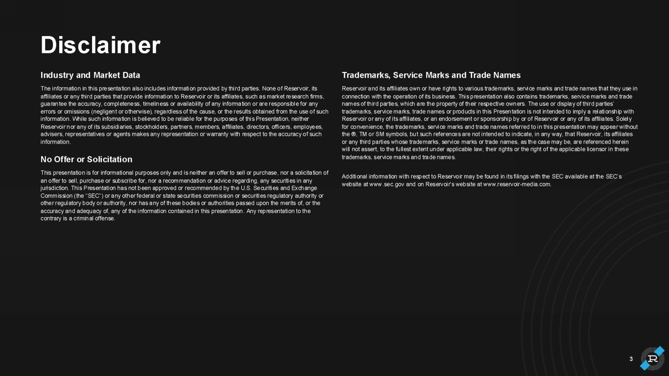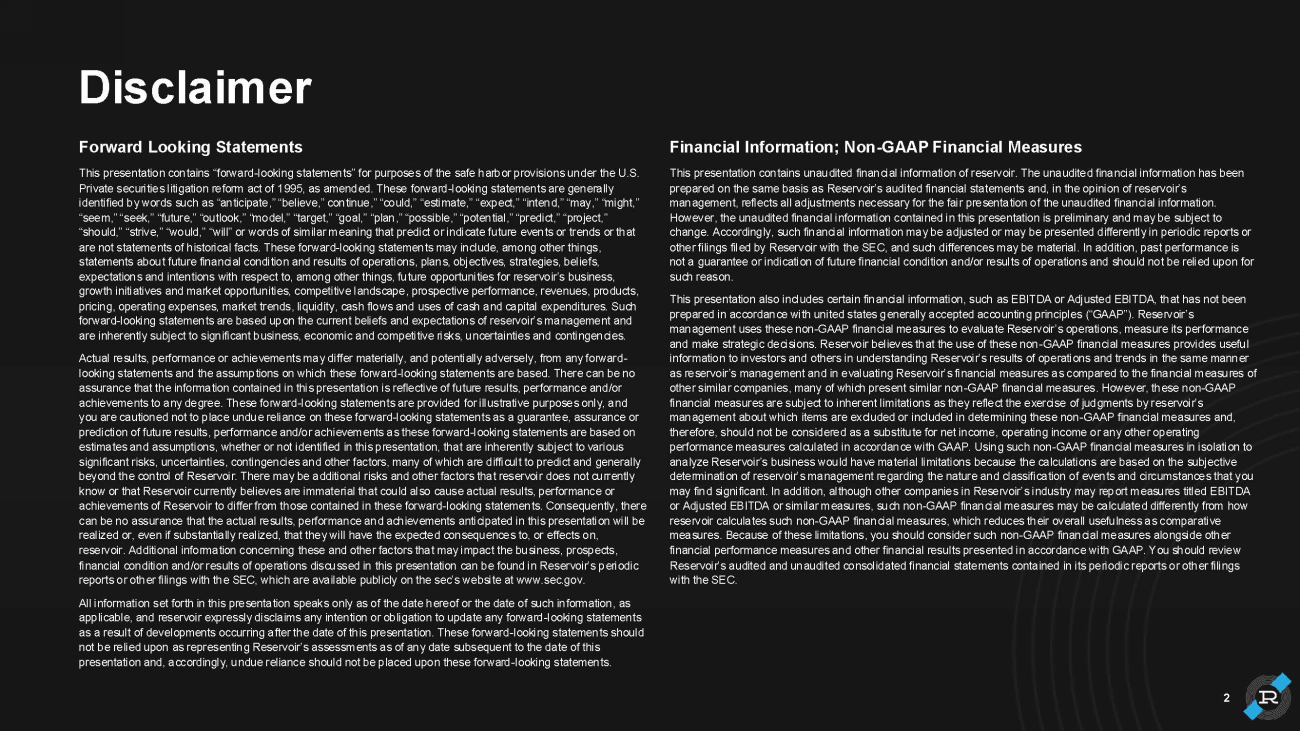 Forward Looking Statements This presentation contains “forward - looking statements” for purposes of the safe harbor provisions under the U.S. Private securities litigation reform act of 1995, as amended. These forward - looking statements are generally identified by words such as “anticipate,” “believe,” continue,” “could,” “estimate,” “expect,” “intend,” “may,” “might,” “seem,” “seek,” “future,” “outlook,” “model,” “target,” “goal,” “plan,” “possible,” “potential,” “predict,” “project,” “should,” “strive,” “would,” “will” or words of similar meaning that predict or indicate future events or trends or that are not statements of historical facts. These forward - looking statements may include, among other things, statements about future financial condition and results of operations, plans, objectives, strategies, beliefs, expectations and intentions with respect to, among other things, future opportunities for reservoir’s business, growth initiatives and market opportunities, competitive landscape, prospective performance, revenues, products, pricing, operating expenses, market trends, liquidity, cash flows and uses of cash and capital expenditures. Such forward - looking statements are based upon the current beliefs and expectations of reservoir’s management and are inherently subject to significant business, economic and competitive risks, uncertainties and contingencies. Actual results, performance or achievements may differ materially, and potentially adversely, from any forward - looking statements and the assumptions on which these forward - looking statements are based. There can be no assurance that the information contained in this presentation is reflective of future results, performance and/or achievements to any degree. These forward - looking statements are provided for illustrative purposes only, and you are cautioned not to place undue reliance on these forward - looking statements as a guarantee, assurance or prediction of future results, performance and/or achievements as these forward - looking statements are based on estimates and assumptions, whether or not identified in this presentation, that are inherently subject to various significant risks, uncertainties, contingencies and other factors, many of which are difficult to predict and generally beyond the control of Reservoir. There may be additional risks and other factors that reservoir does not currently know or that Reservoir currently believes are immaterial that could also cause actual results, performance or achievements of Reservoir to differ from those contained in these forward - looking statements. Consequently, there can be no assurance that the actual results, performance and achievements anticipated in this presentation will be realized or, even if substantially realized, that they will have the expected consequences to, or effects on, reservoir. Additional information concerning these and other factors that may impact the business, prospects, financial condition and/or results of operations discussed in this presentation can be found in Reservoir’s periodic reports or other filings with the SEC, which are available publicly on the sec’s website at www.sec.gov. All information set forth in this presentation speaks only as of the date hereof or the date of such information, as applicable, and reservoir expressly disclaims any intention or obligation to update any forward - looking statements as a result of developments occurring after the date of this presentation. These forward - looking statements should not be relied upon as representing Reservoir’s assessments as of any date subsequent to the date of this presentation and, accordingly, undue reliance should not be placed upon these forward - looking statements. Financial Information; Non - GAAP Financial Measures This presentation contains unaudited financial information of reservoir. The unaudited financial information has been prepared on the same basis as Reservoir’s audited financial statements and, in the opinion of reservoir’s management, reflects all adjustments necessary for the fair presentation of the unaudited financial information. However, the unaudited financial information contained in this presentation is preliminary and may be subject to change. Accordingly, such financial information may be adjusted or may be presented differently in periodic reports or other filings filed by Reservoir with the SEC, and such differences may be material. In addition, past performance is not a guarantee or indication of future financial condition and/or results of operations and should not be relied upon for such reason. This presentation also includes certain financial information, such as EBITDA or Adjusted EBITDA, that has not been prepared in accordance with united states generally accepted accounting principles (“GAAP”). Reservoir’s management uses these non - GAAP financial measures to evaluate Reservoir’s operations, measure its performance and make strategic decisions. Reservoir believes that the use of these non - GAAP financial measures provides useful information to investors and others in understanding Reservoir’s results of operations and trends in the same manner as reservoir’s management and in evaluating Reservoir’s financial measures as compared to the financial measures of other similar companies, many of which present similar non - GAAP financial measures. However, these non - GAAP financial measures are subject to inherent limitations as they reflect the exercise of judgments by reservoir’s management about which items are excluded or included in determining these non - GAAP financial measures and, therefore, should not be considered as a substitute for net income, operating income or any other operating performance measures calculated in accordance with GAAP. Using such non - GAAP financial measures i