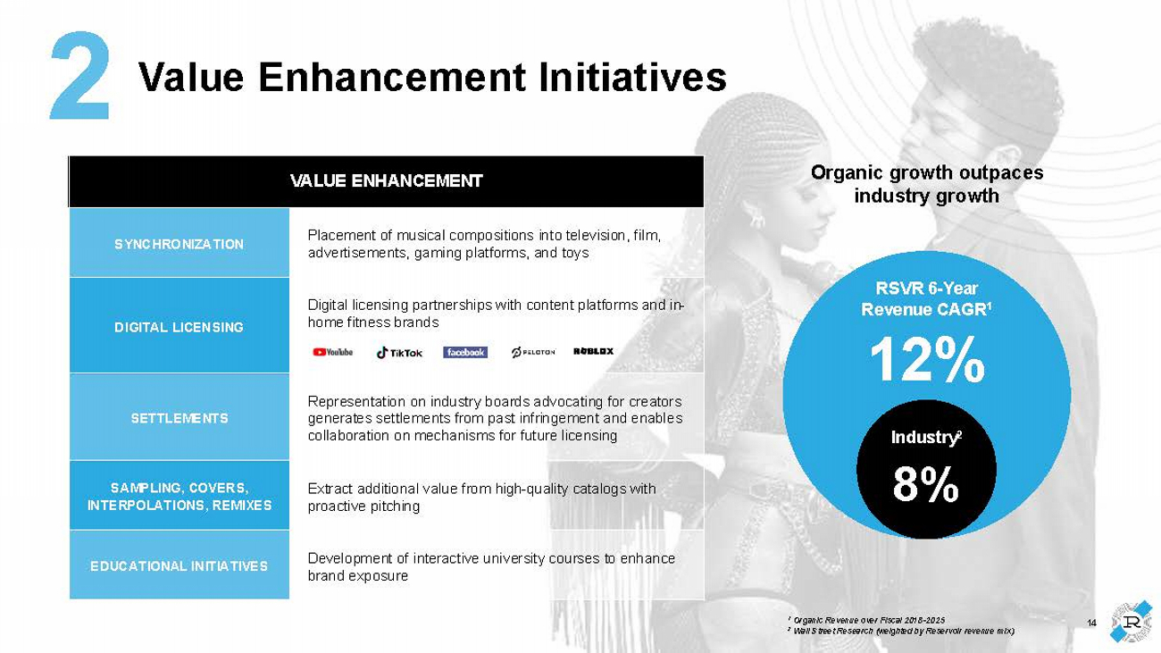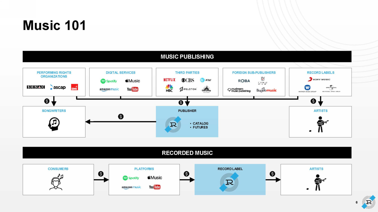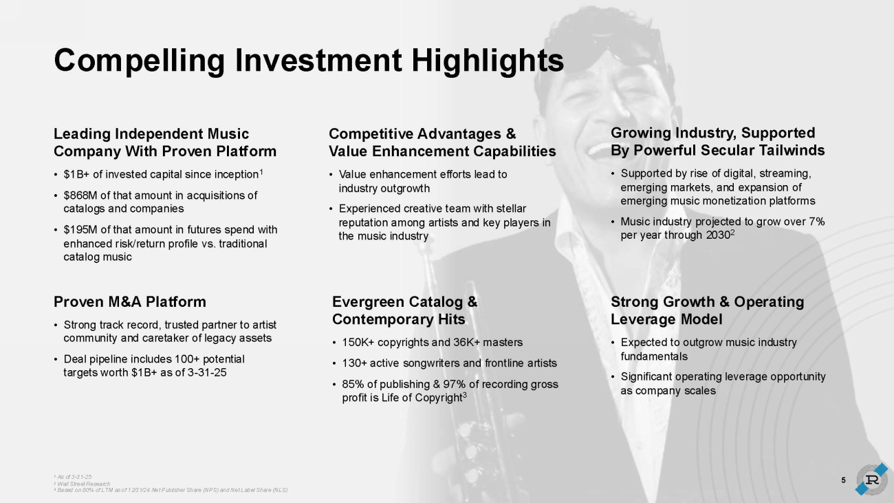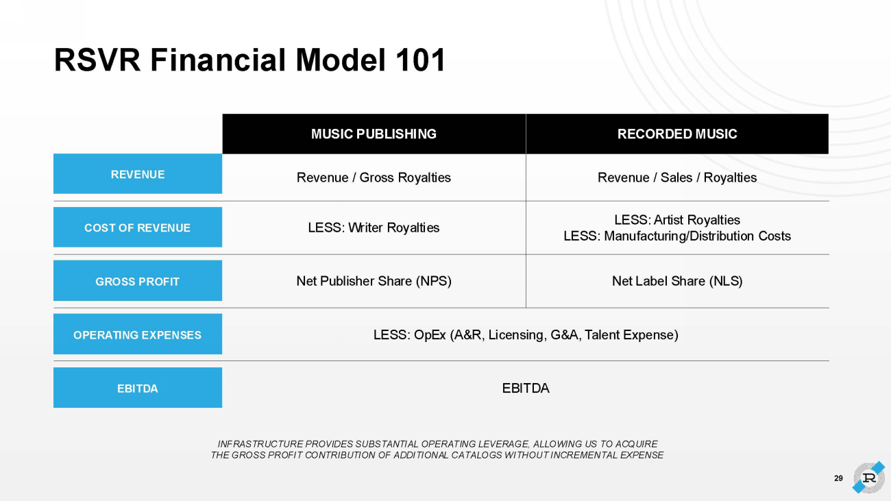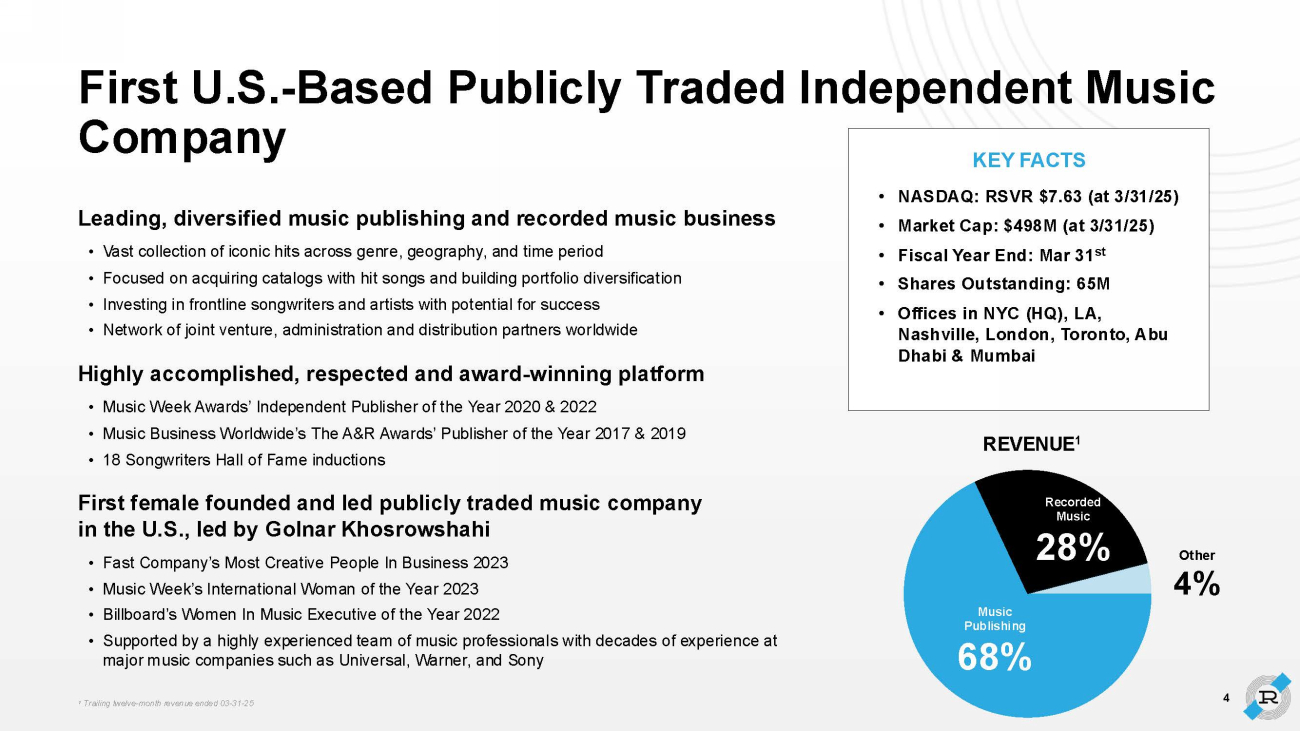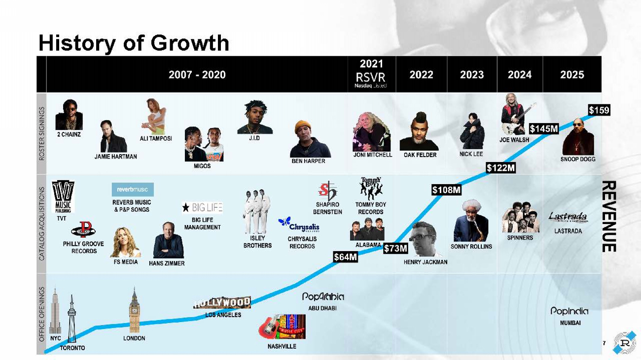 First U.S. - Based Publicly Traded Independent Music Company KEY FACTS • NASDAQ: RSVR $7.63 (at 3/31/25) • Market Cap: $498M (at 3/31/25) • Fiscal Year End: Mar 31 st • Shares Outstanding: 65M • Offices in NYC (HQ), LA, Nashville, London, Toronto, Abu Dhabi & Mumbai 4 Leading, diversified music publishing and recorded music business • Vast collection of iconic hits across genre, geography, and time period • Focused on acquiring catalogs with hit songs and building portfolio diversification • Investing in frontline songwriters and artists with potential for success • Network of joint venture, administration and distribution partners worldwide Highly accomplished, respected and award - winning platform • Music Week Awards’ Independent Publisher of the Year 2020 & 2022 • Music Business Worldwide’s The A&R Awards’ Publisher of the Year 2017 & 2019 • 18 Songwriters Hall of Fame inductions First female founded and led publicly traded music company in the U.S., led by Golnar Khosrowshahi • Fast Company’s Most Creative People In Business 2023 • Music Week’s International Woman of the Year 2023 • Billboard’s Women In Music Executive of the Year 2022 • Supported by a highly experienced team of music professionals with decades of experience at major music companies such as Universal, Warner, and Sony REVENUE 1 1 Trailing twelve - month revenue ended 03 - 31 - 25 Music Publishing 68% Recorded Music 28% Other 4% 1 As of 3 - 31 - 25 2 Wall Street Research 3 Based on 80% of LTM as of 12/31/24 Net Publisher Share (NPS) and Net Label Share (NLS) Compelling Investment Highlights Leading Independent Music Company With Proven Platform • $1B+ of invested capital since inception 1 • $868M of that amount in acquisitions of catalogs and companies • $195M of that amount in futures spend with enhanced risk/return profile vs. traditional catalog music Evergreen Catalog & Contemporary Hits • 150K+ copyrights and 36K+ masters • 130+ active songwriters and frontline artists • 85% of publishing & 97% of recording gross profit is Life of Copyright 3 Proven M&A Platform • Strong track record, trusted partner to artist community and caretaker of legacy assets • Deal pipeline includes 100+ potential targets worth $1B+ as of 3 - 31 - 25 Strong Growth & Operating Leverage Model • Expected to outgrow music industry fundamentals • Significant operating leverage opportunity as company scales Growing Industry, Supported By Powerful Secular Tailwinds • Supported by rise of digital, streaming, emerging markets, and expansion of emerging music monetization platforms • Music industry projected to grow over 7% per year through 2030 2 Competitive Advantages & Value Enhancement Capabilities • Value enhancement efforts lead to industry outgrowth • Experienced creative team with stellar reputation among artists and key players in the music industry 5