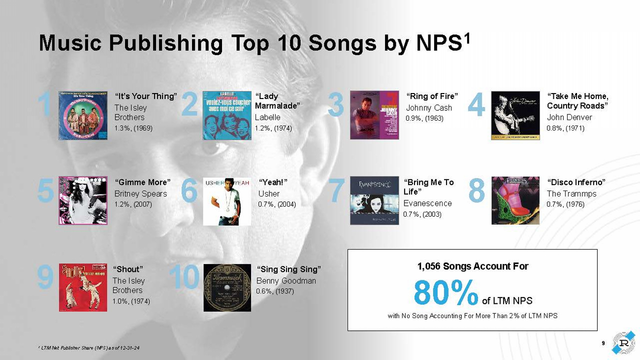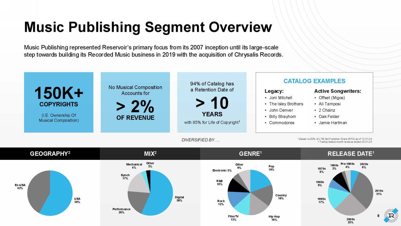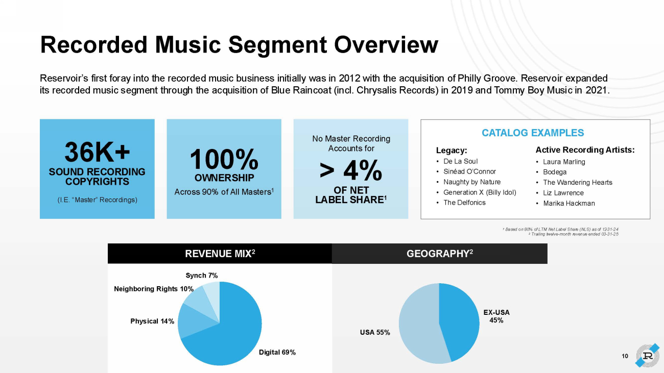 202 0s 6% 2010s 31% 200 0s 25% 199 0s 17% 198 0s 6% 197 0s 8% 3% 196 0s Pre - 196 0s 4% Pop 19% Country 16% Hip Hop 16% Film/TV 13% Rock 12% R&B 10% Electronic 5% Other 9% 1 Based on 80% of LTM Net Publisher Share (NPS) as of 12 - 31 - 24 2 Trailing twelve - month revenue ended 03 - 31 - 25 GEOGRAPHY 2 MIX 2 GENRE 1 RELEASE DATE 1 150K+ COPYRIGHTS (I.E. Ownership Of Musical Composition) Music Publishing Segment Overview Music Publishing represented Reservoir’s primary focus from its 2007 inception until its large - scale step towards building its Recorded Music business in 2019 with the acquisition of Chrysalis Records. 8 “Yeah!” Usher 0.7%, (2004) “Take Me Home, Country Roads” John Denver 0.8%, (1971) “Ring of Fire” Johnny Cash 0.9%, (1963) 9 10 1 2 3 5 6 7 4 8 “Shout” The Isley Brothers 1.0%, (1974) “Disco Inferno” The Trammps 0.7%, (1976) “Lady Marmalade” Labelle 1.2%, (1974) “Bring Me To Life” Evanescence 0.7%, (2003) “Gimme More” Britney Spears 1.2%, (2007) “It’s Your Thing” The Isley Brothers 1.3%, (1969) “Sing Sing Sing” Benny Goodman 0.6%, (1937) 1 LTM Net Publisher Shar e ( NPS) as of 12 - 31 - 24 1,056 Songs Account For 80% of LTM NPS with No Song Accounting For More Than 2% of LTM NPS Music Publishing Top 10 Songs by NPS 1 9