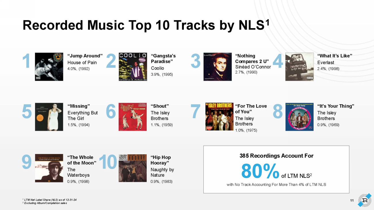 REVENUE MIX 2 Digital 69% Physical 14% Synch 7% Neighboring Rights 10% 1 Based on 80% of LTM Net Label Share (NLS) as of 12 - 31 - 24 2 Trailing twelve - month revenue ended 03 - 31 - 25 100% OWNERSHIP Across 90% of All Masters 1 No Master Recording Accounts for > 4% OF NET LABEL SHARE 1 36K+ SOUND RECORDING COPYRIGHTS (I.E. “Master” Recordings) Recorded Music Segment Overview Reservoir’s first foray into the recorded music business initially was in 2012 with the acquisition of Philly Groove. Reservoir expanded its recorded music segment through the acquisition of Blue Raincoat (incl. Chrysalis Records) in 2019 and Tommy Boy Music in 2021. Legacy: • De La Soul • Laura Marling • Sinéad O’Connor • Bodega • Naughty by Nature • The Wandering Hearts • Generation X (Billy Idol) • Liz Lawrence • The Delfonics • Marika Hackman EX - USA 45% USA 55% 10 GEOGRAPHY 2 CATALOG EXAMPLES Active Recording Artists: