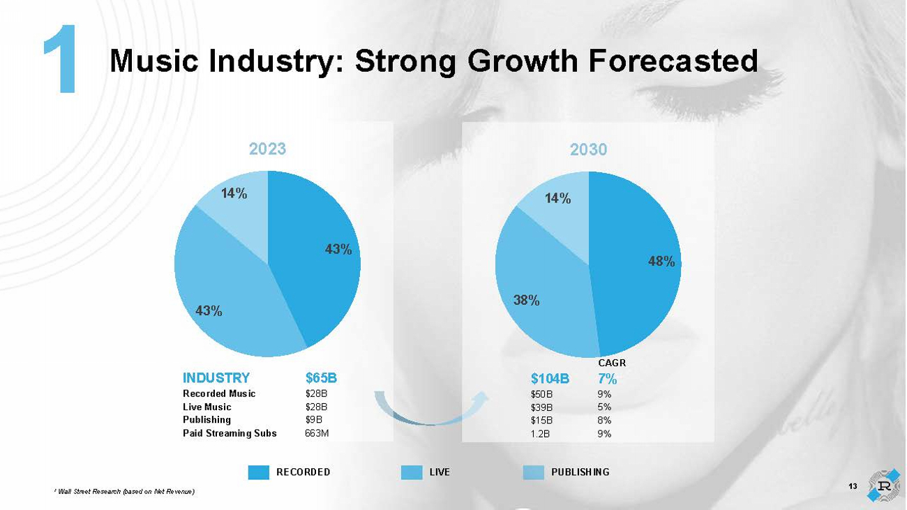 Growth Drivers 12 STRONG SECULAR TAILWINDS VALUE ENHANCEMENT INITIATIVES PROVEN M&A PLATFORM & NEW SIGNINGS OPERATING LEVERAGE & CASH FLOW GENERATION 1 Wall Street Research (based on Net Revenue) Music Industry: Strong Growth Forecasted RECORDED LIVE PUBLISHING 13 INDUSTRY Recorded Music Live Music Publishing Paid Streaming Subs $65B $28B $28B $9B 663M 2023 43% 43% 14% $104B $50B $39B $15B 1.2B CAGR 7% 9% 5% 8% 9% 2030 48% 38% 14%