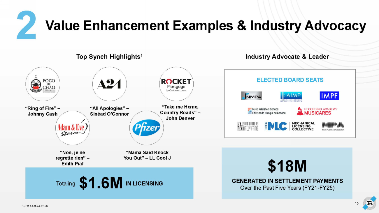 VALUE ENHANCEMENT Placement of musical compositions into television, film, advertisements, gaming platforms, and toys SYNCHRONIZATION Digital licensing partnerships with content platforms and in - home fitness brands DIGITAL LICENSING Representation on industry boards advocating for creators generates settlements from past infringement and enables collaboration on mechanisms for future licensing SETTLEMENTS Extract additional value from high - quality catalogs with proactive pitching SAMPLING, COVERS, INTERPOLATIONS, REMIXES Development of interactive university courses to enhance brand exposure EDUCATIONAL INITIATIVES 1 Or ganic Revenue over Fiscal 2018 - 202 5 2 Wall Street Research (weighted by Reservoir revenue mix) Organic growth outpaces industry growth RSVR 6 - Year Revenue CAGR 1 12% Industry 2 8% Value Enhancement Initiatives 14 “Non, je ne regrette rien” – Edith Piaf “Mama Said Knock You Out” – LL Cool J “Take me Home, Country Roads” – John Denver “Ring of Fire” – Johnny Cash “All Apologies” – Sinéad O’Connor Top Synch Highlights 1 Industry Advocate & Leader $18M GENERATED IN SETTLEMENT PAYMENTS Over the Past Five Years (FY21 - FY25) Value Enhancement Examples & Industry Advocacy Totaling $1.6M IN LICENSING 15 ELECTED BOARD SEATS 1 LTM as of 03 - 31 - 25