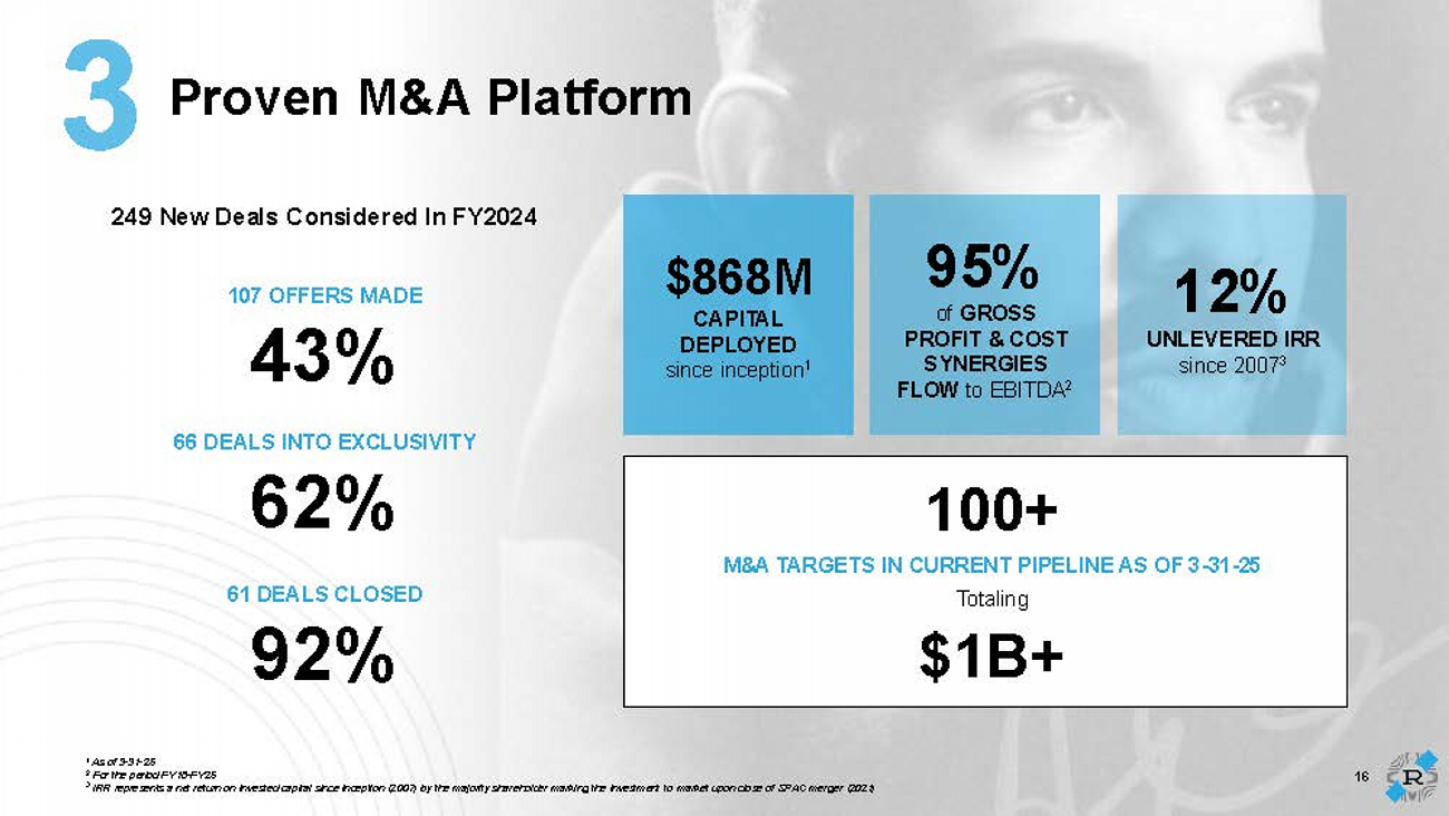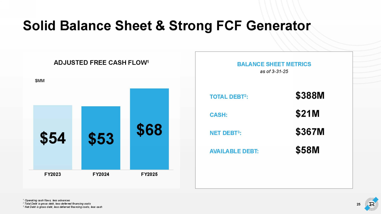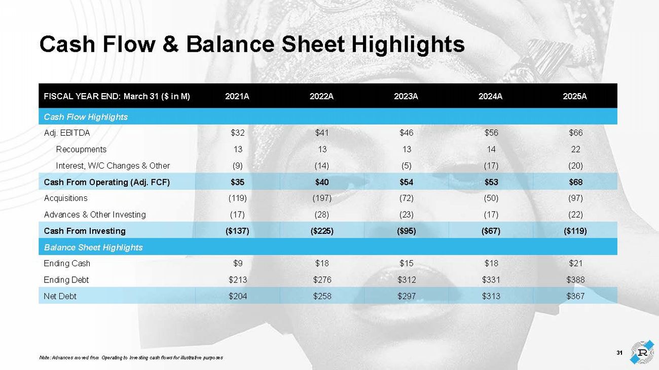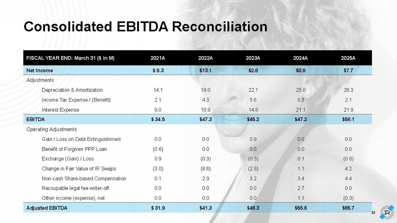 FCF) (97) (50) (72) (197) (119) Acquisitions (22) (17) (23) (28) (17) Advances & Other Investing ($119) ($67) ($95) ($225) ($137) Cash From Investing Balance Sheet Highlights $21 $18 $15 $18 $9 Ending Cash $388 $331 $312 $276 $213 Ending Debt $367 $313 $297 $258 $204 Net Debt Note: Advances moved from Oper atin g to Inve sting cash flows for illustra tive purpo ses 31 Cash Flow & Balance Sheet Highlights 2025A 2024A 2023A 2022A 2021A FISCAL YEAR END: March 31 ($ in M) $7.7 $0.8 $2.8 $13.1 $ 9.3 Net Income Adjustments 26.3 25.0 22.1 19.0 14.1 Depreciation & Amortization 2.1 0.3 5.6 4.3 2.1 Income Tax Expense / (Benefit) 21.9 21.1 14.8 10.9 9.0 Interest Expense $58.1 $47.2 $45.2 $47.3 $ 34.5 EBITDA Operating Adjustments 0.0 0.0 0.9 0.0 0.0 Gain / Loss on Debt Extinguishment 0.0 0.0 0.0 0.0 (0.6) Benefit of Forgiven PPP Loan (0.6) 0.1 (0.3) (0.3) 0.9 Exchange (Gain) / Loss 4.2 1.1 (2.8) (8.6) (3.0) Change in Fair Value of IR Swaps 4.4 3.4 3.2 2.9 0.1 Non - cash Share - based Compensation 0.0 2.7 0.0 0.0 0.0 Recoupable legal fee writer - off (0.3) 1.1 0.0 0.0 0.0 Other income (expense), net $65.7 $55.6 $46.3 $41.3 $ 31.9 Adjusted EBITDA 32 Consolidated EBITDA Reconciliation PR Contact Suzanne Arrabito Reservoir sa@reservoir - media.com | 212 - 675 - 0541 33 IR Contact Jackie Marcus Alpha IR Group RSVR@alpha - ir.com | 312 - 445 - 2870