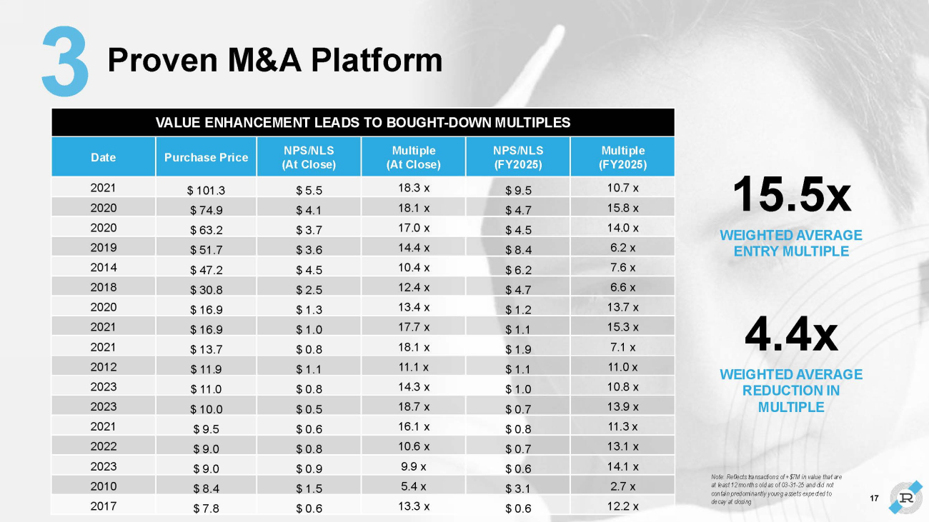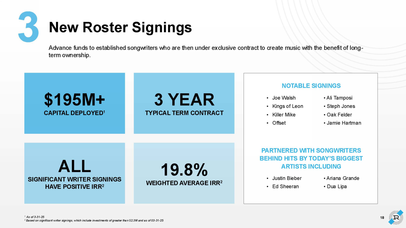 $868M CAPITAL DEPLOYED since inception 1 95% of GROSS PROFIT & COST SYNERGIES FLOW to EBITDA 2 12% UNLEVERED IRR since 2007 3 1 As of 3 - 31 - 25 2 For the p eriod FY18 - FY25 3 IRR repre sen ts a net return on invested cap ital since in cep tion (2 007) by the majority shar eholder marking the investment to market u pon clo se of SPAC mer ger (2021 ) 100+ M&A TARGETS IN CURRENT PIPELINE AS OF 3 - 31 - 25 Totaling $1B+ Proven M&A Platform 107 OFFERS MADE 43% 66 DEALS INTO EXCLUSIVITY 62% 61 DEALS CLOSED 92% 249 New Deals Considered In FY2024 16 Note: Reflects transactions of +$7M in value that are at least 12 months old as of 03 - 31 - 25 and did not contain predominantly young assets expected to decay at closing Proven M&A Platform 15.5x WEIGHTED AVERAGE ENTRY MULTIPLE 4.4x WEIGHTED AVERAGE REDUCTION IN MULTIPLE VALUE ENHANCEMENT LEADS TO BOUGHT - DOWN MULTIPLES Multiple (FY2025) NPS/NLS (FY2025) Multiple (At Close) NPS/NLS (At Close) Purchase Price Date 10.7 x $ 9.5 18.3 x $ 5.5 $ 101.3 2021 15.8 x $ 4.7 18.1 x $ 4.1 $ 74.9 2020 14.0 x $ 4.5 17.0 x $ 3.7 $ 63.2 2020 6.2 x $ 8.4 14.4 x $ 3.6 $ 51.7 2019 7.6 x $ 6.2 10.4 x $ 4.5 $ 47.2 2014 6.6 x $ 4.7 12.4 x $ 2.5 $ 30.8 2018 13.7 x $ 1.2 13.4 x $ 1.3 $ 16.9 2020 15.3 x $ 1.1 17.7 x $ 1.0 $ 16.9 2021 7.1 x $ 1.9 18.1 x $ 0.8 $ 13.7 2021 11.0 x $ 1.1 11.1 x $ 1.1 $ 11.9 2012 10.8 x $ 1.0 14.3 x $ 0.8 $ 11.0 2023 13.9 x $ 0.7 18.7 x $ 0.5 $ 10.0 2023 11.3 x $ 0.8 16.1 x $ 0.6 $ 9.5 2021 13.1 x $ 0.7 10.6 x $ 0.8 $ 9.0 2022 14.1 x $ 0.6 9.9 x $ 0.9 $ 9.0 2023 2.7 x $ 3.1 5.4 x $ 1.5 $ 8.4 2010 12.2 x $ 0.6 13.3 x $ 0.6 $ 7.8 2017 17 Advance funds to established songwriters who are then under exclusive contract to create music with the benefit of long - term ownership.
