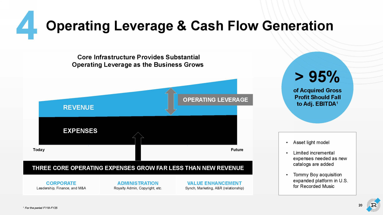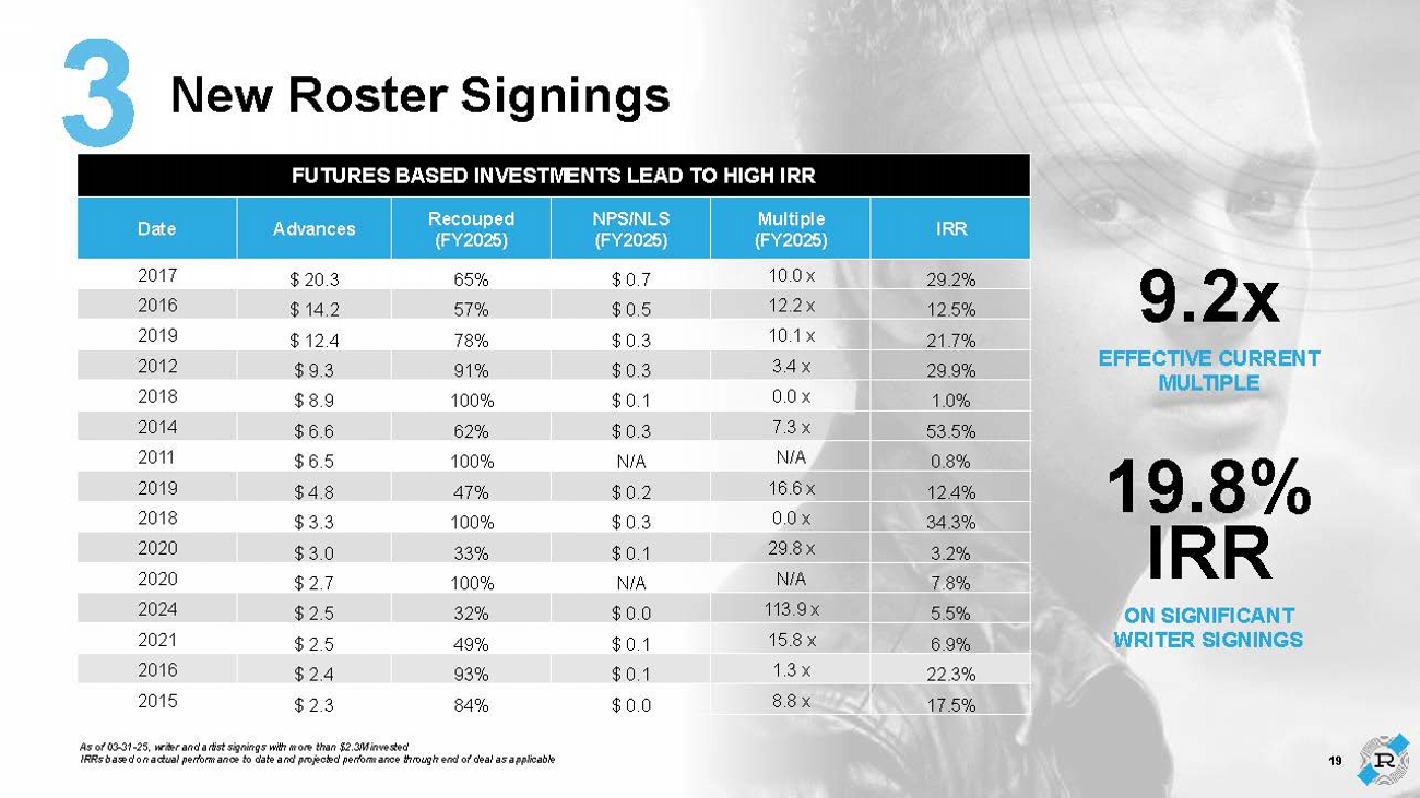 NOTABLE SIGNINGS $195M+ CAPITAL DEPLOYED 1 3 YEAR TYPICAL TERM CONTRACT • Joe Walsh • Kings of Leon • Killer Mike • Offset • Ali Tamposi • Steph Jones • Oak Felder • Jamie Hartman ALL SIGNIFICANT WRITER SIGNINGS HAVE POSITIVE IRR 2 19.8% WEIGHTED AVERAGE IRR 2 1 As of 3 - 31 - 25 2 Based on significa nt writer sign ings, which include investme nts of gr eater tha n $ 2.3 M and as of 03 - 31 - 25 New Roster Signings 18 PARTNERED WITH SONGWRITERS BEHIND HITS BY TODAY’S BIGGEST ARTISTS INCLUDING • Justin Bieber • Ed Sheeran • Ariana Grande • Dua Lipa FUTURES BASED INVESTMENTS LEAD TO HIGH IRR IRR Multiple (FY2025) NPS/NLS (FY2025) Recouped (FY2025) Advances Date 29.2% 10.0 x $ 0.7 65% $ 20.3 2017 12.5% 12.2 x $ 0.5 57% $ 14.2 2016 21.7% 10.1 x $ 0.3 78% $ 12.4 2019 29.9% 3.4 x $ 0.3 91% $ 9.3 2012 1.0% 0.0 x $ 0.1 100% $ 8.9 2018 53.5% 7.3 x $ 0.3 62% $ 6.6 2014 0.8% N/A N/A 100% $ 6.5 2011 12.4% 16.6 x $ 0.2 47% $ 4.8 2019 34.3% 0.0 x $ 0.3 100% $ 3.3 2018 3.2% 29.8 x $ 0.1 33% $ 3.0 2020 7.8% N/A N/A 100% $ 2.7 2020 5.5% 113.9 x $ 0.0 32% $ 2.5 2024 6.9% 15.8 x $ 0.1 49% $ 2.5 2021 22.3% 1.3 x $ 0.1 93% $ 2.4 2016 17.5% 8.8 x $ 0.0 84% $ 2.3 2015 As of 03 - 31 - 25, writer an d artist signin gs with more than $2.3M invested IRRs b ase d on actual performan ce to date a nd projected performance th rough end of deal as a pplicable New Roster Signings 9.2x EFFECTIVE CURRENT MULTIPLE 19.8% IRR ON SIGNIFICANT WRITER SIGNINGS 19 • Asset light model • Limited incremental expenses needed as new catalogs are added • Tommy Boy acquisition expanded platform in U.S. for Recorded Music Core Infrastructure Provides Substantial Operating Leverage as the Business Grows > 95 % of Acquired Gross Profit Should Fall to Adj . EBITDA 1 THREE CORE OPERATING EXPENSES GROW FAR LESS THAN NEW REVENUE CORPORATE Leadership, Finance, and M&A ADMINISTRATION Royalty Admin, Copyright, etc. VALUE ENHANCEMENT Synch, Marketing, A&R (relationship) Today Future OPERATING LEVERAGE REVENUE EXPENSES Operating Leverage & Cash Flow Generation 20 1 For the p eriod FY18 - FY25