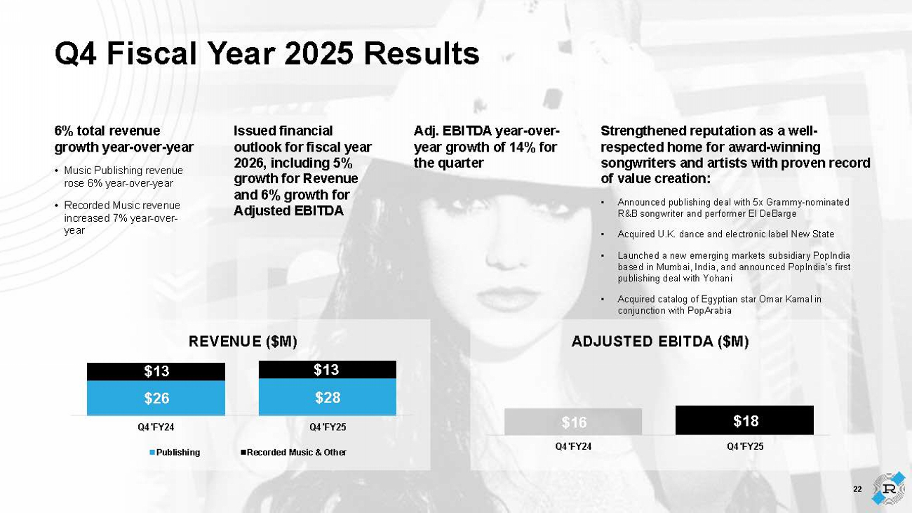 $13 $26 $13 $28 Q4'FY24 Q4'FY25 Publishing Recorded Music & Other REVENUE ($M) $16 Q4'FY24 $18 Q4'FY25 ADJUSTED EBITDA ($M) Q4 Fiscal Year 2025 Results 6% total revenue growth year - over - year • Music Publishing revenue rose 6% year - over - year • Recorded Music revenue increased 7 % year - over - year Issued financial outlook for fiscal year 2026, including 5% growth for Revenue and 6% growth for Adjusted EBITDA Strengthened reputation as a well - respected home for award - winning songwriters and artists with proven record of value creation: • Announced publishing deal with 5x Grammy - nominated R&B songwriter and performer El DeBarge • Acquired U.K. dance and electronic label New State • Launched a new emerging markets subsidiary PopIndia based in Mumbai, India, and announced PopIndia’s first publishing deal with Yohani • Acquired catalog of Egyptian star Omar Kamal in conjunction with PopArabia Adj .
