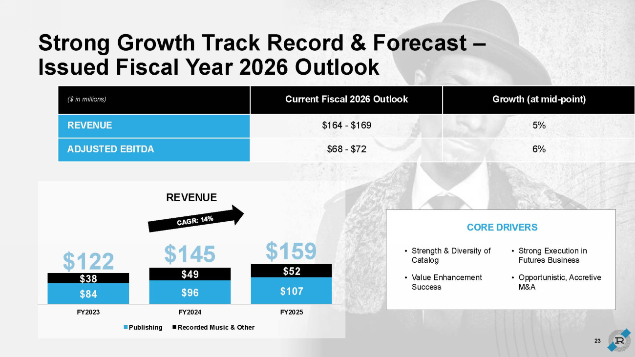 EBITDA year - over - year growth of 14 % for the quarter 22 Strong Growth Track Record & Forecast – Issued Fiscal Year 2026 Outlook Growth (at mid - point) Current Fiscal 2026 Outlook ($ in millions) 5% $164 - $169 REVENUE 6% $68 - $72 ADJUSTED EBITDA $84 $96 $107 $38 $49 $52 FY2023 FY2024 FY2025 Publishing Recorded Music & Other $122 $145 $159 REVENUE • Strength & Diversity of Catalog • Value Enhancement Success CORE DRIVERS • Strong Execution in Futures Business • Opportunistic, Accretive M&A 23 24 Note: Excludes the effect of an y non - cash stock - based compensation expense related to the current stock incentive plan.