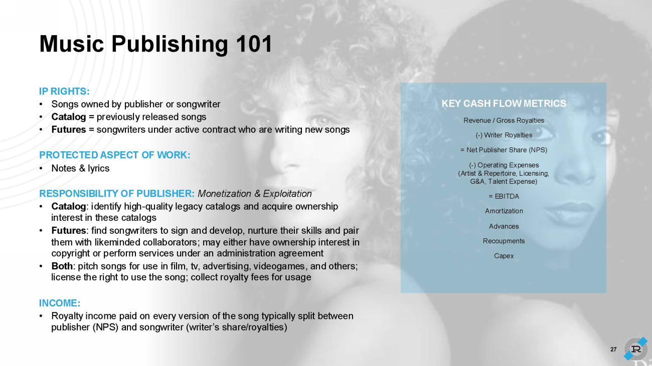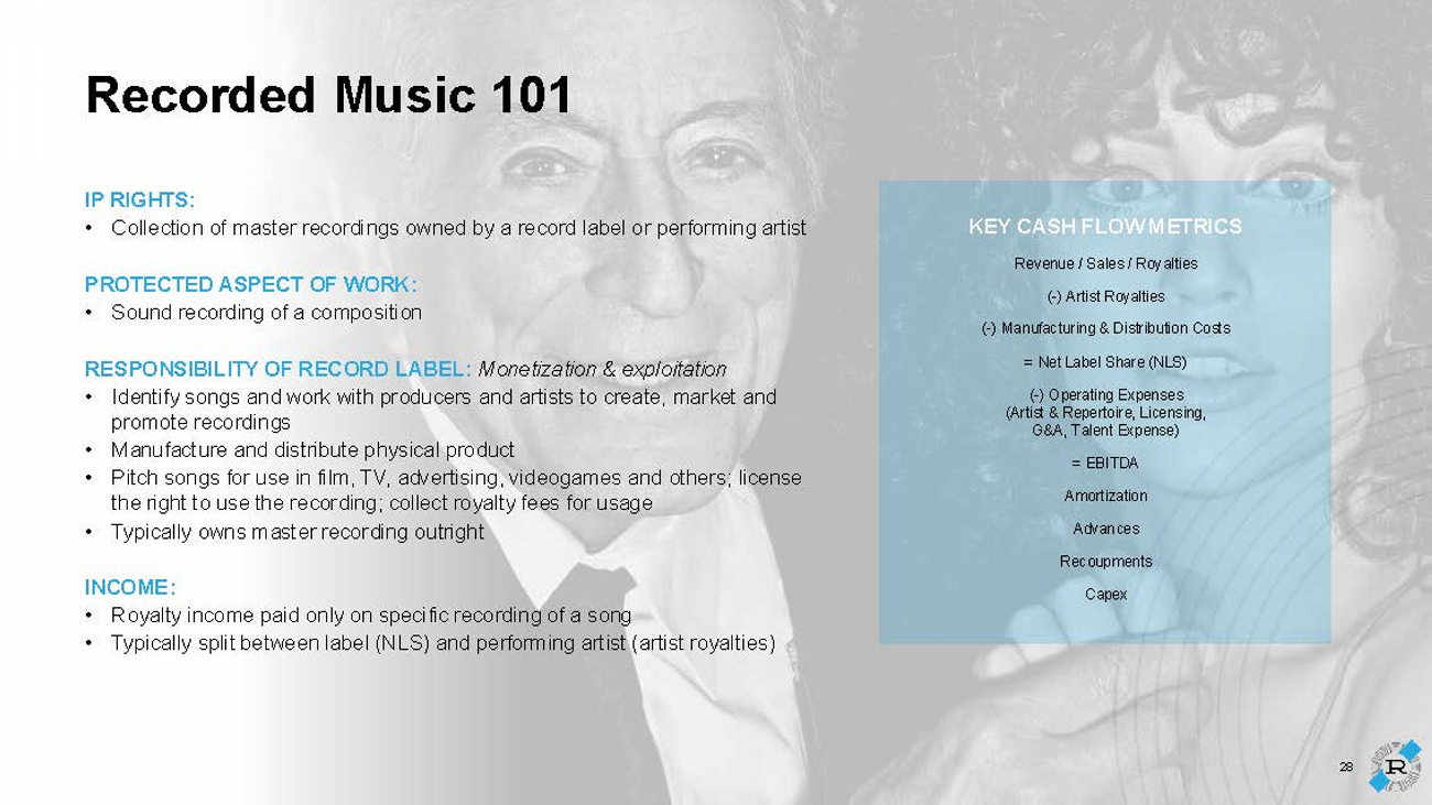 $74 $89 $101 FY2023 FY2024 FY2025 GROSS PROFIT $46 $56 $66 FY2023 FY2024 FY2025 ADJUSTED EBITDA Improving Profitability $MM $MM $54 $53 $68 FY2023 FY2024 FY2025 $MM ADJUSTED FREE CASH FLOW 1 1 Op erating cash flows, less advances 2 Total Debt is gro ss debt, less de fer red fin ancing costs 3 Net Debt is gross debt, less deferr ed fina ncin g costs, less cash (after de - SPAC) BALANCE SHEET METRICS as of 3 - 31 - 25 TOTAL DEBT 2 : CASH: NET DEBT 3 : AVAILABLE DEBT: $388M $21M $367M $58M Solid Balance Sheet & Strong FCF Generator 25 Music Publishing 101 IP RIGHTS: • Songs owned by publisher or songwriter • Catalog = previously released songs • Futures = songwriters under active contract who are writing new songs PROTECTED ASPECT OF WORK: • Notes & lyrics RESPONSIBILITY OF PUBLISHER: Monetization & Exploitation • Catalog : identify high - quality legacy catalogs and acquire ownership interest in these catalogs • Futures : find songwriters to sign and develop, nurture their skills and pair them with likeminded collaborators ; may either have ownership interest in copyright or perform services under an administration agreement • Both : pitch songs for use in film, tv, advertising, videogames, and others ; license the right to use the song ; collect royalty fees for usage INCOME: • Royalty income paid on every version of the song typically split between publisher (NPS) and songwriter (writer’s share/royalties) KEY CASH FLOW METRICS Revenue / Gross Royalties ( - ) Writer Royalties = Net Publisher Share (NPS) ( - ) Operating Expenses (Artist & Repertoire, Licensing, G&A, Talent Expense) = EBITDA Amortization Advances Recoupments Capex 27 Recorded Music 101 IP RIGHTS: • Collection of master recordings owned by a record label or performing artist PROTECTED ASPECT OF WORK: • Sound recording of a composition RESPONSIBILITY OF RECORD LABEL: Monetization & exploitation • Identify songs and work with producers and artists to create, market and promote recordings • Manufacture and distribute physical product • Pitch songs for use in film, TV, advertising, videogames and others; license the right to use the recording; collect royalty fees for usage • Typically owns master recording outright INCOME: • Royalty income paid only on specific recording of a song • Typically split between label (NLS) and performing artist (artist royalties) KEY CASH FLOW METRICS Revenue / Sales / Royalties ( - ) Artist Royalties ( - ) Manufacturing & Distribution Costs = Net Label Share (NLS) ( - ) Operating Expenses (Artist & Repertoire, Licensing, G&A, Talent Expense) = EBITDA Amortization Advances Recoupments Capex 28