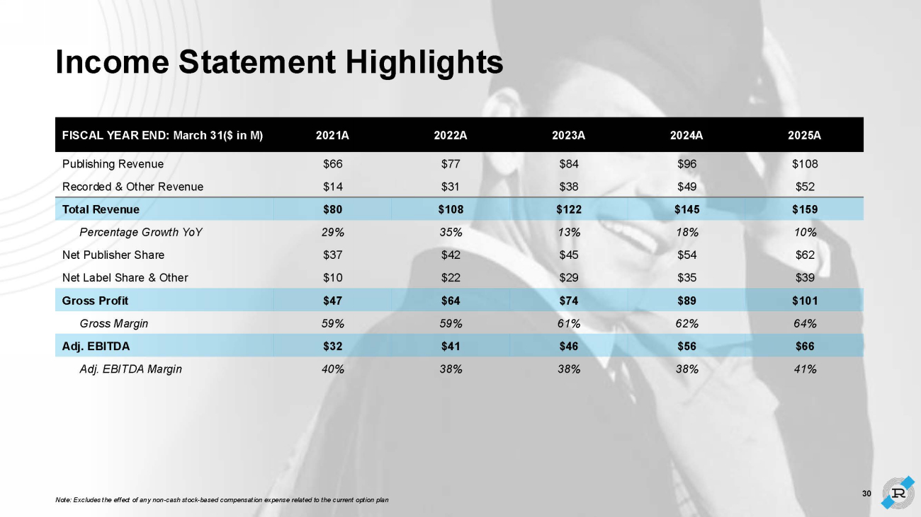 RSVR Financial Model 101 INFRASTRUCTURE PROVIDES SUBSTANTIAL OPERATING LEVERAGE, ALLOWING US TO ACQUIRE THE GROSS PROFIT CONTRIBUTION OF ADDITIONAL CATALOGS WITHOUT INCREMENTAL EXPENSE 29 LESS: OpEx (A&R, Licensing, G&A, Talent Expense) EBITDA RECORDED MUSIC MUSIC PUBLISHING Revenue / Sales / Royalties Revenue / Gross Royalties REVENUE LESS: Artist Royalties LESS: Manufacturing/Distribution Costs LESS: Writer Royalties COST OF REVENUE Net Label Share (NLS) Net Publisher Share (NPS) GROSS PROFIT OPERATING EXPENSES EBITDA 2025A 2024A 2023A 2022A 2021A FISCAL YEAR END: March 31($ in M) $108 $96 $84 $77 $66 Publishing Revenue $52 $49 $38 $31 $14 Recorded & Other Revenue $159 $145 $122 $108 $80 Total Revenue 10% 18% 13% 35% 29% Percentage Growth YoY $62 $54 $45 $42 $37 Net Publisher Share $39 $35 $29 $22 $10 Net Label Share & Other $101 $89 $74 $64 $47 Gross Profit 64% 62% 61% 59% 59% Gross Margin $66 $56 $46 $41 $32 Adj.