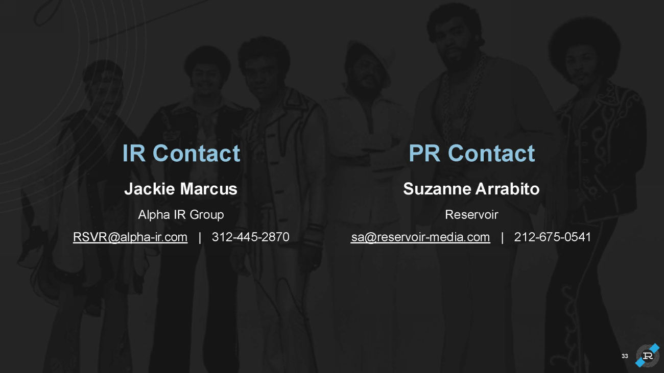 None of Reservoir, its affiliates or any third parties that provide information to Reservoir or its affiliates, such as market research firms, guarantee the accuracy, completeness, timeliness or availability of any information or are responsible for any errors or omissions (negligent or otherwise), regardless of the cause, or the results obtained from the use of such information. While such information is believed to be reliable for the purposes of this Presentation, neither Reservoir nor any of its subsidiaries, stockholders, partners, members, affiliates, directors, officers, employees, advisers, representatives or agents makes any representation or warranty with respect to the accuracy of such information. No Offer or Solicitation This presentation is for informational purposes only and is neither an offer to sell or purchase, nor a solicitation of an offer to sell, purchase or subscribe for, nor a recommendation or advice regarding, any securities in any jurisdiction. This Presentation has not been approved or recommended by the U.S. Securities and Exchange Commission (the “SEC”) or any other federal or state securities commission or securities regulatory authority or other regulatory body or authority, nor has any of these bodies or authorities passed upon the merits of, or the accuracy and adequacy of, any of the information contained in this presentation. Any representation to the contrary is a criminal offense. Trademarks, Service Marks and Trade Names Reservoir and its affiliates own or have rights to various trademarks, service marks and trade names that they use in connection with the operation of its business. This presentation also contains trademarks, service marks and trade names of third parties, which are the property of their respective owners. The use or display of third parties’ trademarks, service marks, trade names or products in this Presentation is not intended to imply a relationship with Reservoir or any of its affiliates, or an endorsement or sponsorship by or of Reservoir or any of its affiliates. Solely for convenience, the trademarks, service marks and trade names referred to in this presentation may appear without the ®, TM or SM symbols, but such references are not intended to indicate, in any way, that Reservoir, its affiliates or any third parties whose trademarks, service marks or trade names, as the case may be, are referenced herein will not assert, to the fullest extent under applicable law, their rights or the right of the applicable licensor in these trademarks, service marks and trade names. Additional information with respect to Reservoir may be found in its filings with the SEC available at the SEC’s website at www.sec.gov and on Reservoir’s website at www.reservoir - media.com.