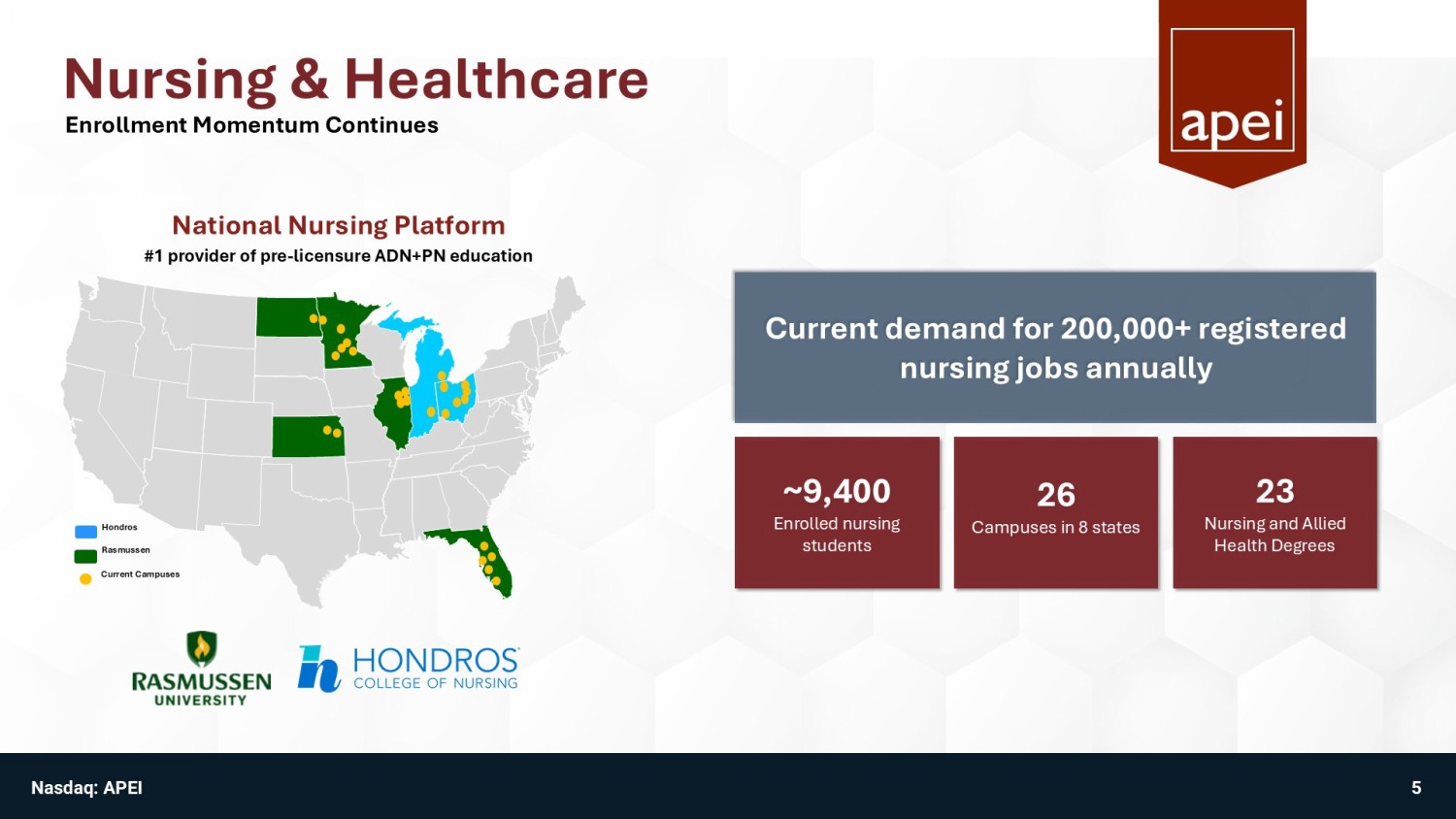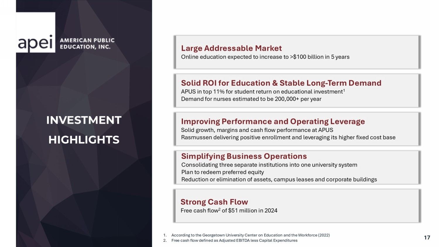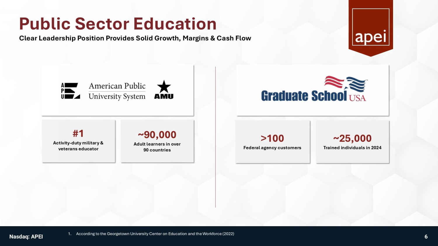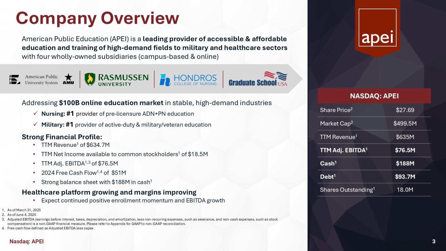 Company Overview American Public Education (APEI) is a leading provider of accessible & affordable education and training of high - demand fields to military and healthcare sectors with four wholly - owned subsidiaries (campus - based & online) Addressing $100B online education market in stable, high - demand industries x Nursing: #1 provider of pre - licensure ADN+PN education x Military: #1 provider of active - duty & military/veteran education Strong Financial Profile: • TTM Revenue 1 of $634.7M • TTM Net Income available to common stockholders 1 of $18.5M • TTM Adj. EBITDA 1,3 of $76.5M • 2024 Free Cash Flow 1,4 of $51M • Strong balance sheet with $188M in cash 1 Healthcare platform growing and margins improving • Expect continued positive enrollment momentum and EBITDA growth Nasdaq: APEI NASDAQ: APEI $27.69 Share Price 2 $499.5M Market Cap 2 $635M TTM Revenue 1 $76.5M TTM Adj. EBITDA 1 $188M Cash 1 $93.7M Debt 1 18.0M Shares Outstanding 1 3 1. As of March 31, 2025 2. As of June 4. 2025 3. Adjusted EBITDA (earnings before interest, taxes, depreciation, and amortization, less non - recurring expenses, such as severance , and non - cash expenses, such as stock compensation) is a non - GAAP financial measure. Please refer to Appendix for GAAP to non - GAAP reconciliation. 4. Free cash flow defined as Adjusted EBITDA less capex 4 1) Adjusted EBITDA (earnings before interest, taxes, depreciation, and amortization less non - recurring expenses, such as severance, and non - cash expenses, such as stock compensation) is a non - GAAP financial measure.