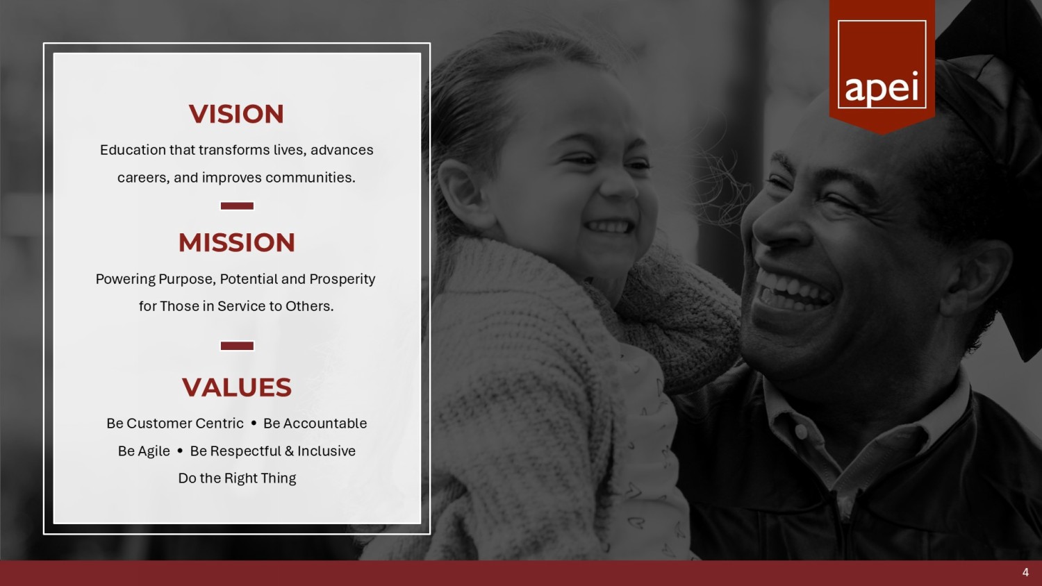 FORWARD - LOOKING STATEMENTS Statements made in this presentation regarding American Public Education, Inc . or its subsidiary institutions (“APEI” or the “Company”) that are not historical facts are forward - looking statements based on current expectations, assumptions, estimates and projections about APEI and the industry . In some cases, forward looking statements can be identified by words such as “anticipate,” “believe,” “seek,” “could,” “estimate,” “expect,” “intend,” “may,” “plan,” “potentially,” “project,” “should,” “will,” “would,” and similar words or their opposites . Forward - looking statements include, without limitation, statements regarding expectations for growth, registration, enrollments, demand, revenues, net income, earnings per share, EBITDA and Adjusted EBITDA, capital expenditures, free cash flow, and plans with respect to and future impacts of recent, current and future initiatives, including the planned combination of APUS, RU and HCN into one consolidated institution, campus and corporate center consolidation, and redemption of preferred stock . Forward - looking statements are subject to risks and uncertainties that could cause actual results to differ materially from those expressed or implied by such statements . Such risks and uncertainties include, among others, risks related to : the Company’s failure to comply with regulatory and accrediting agency requirements, including the “ 90 / 10 Rule”, and to maintain institutional accreditation and the impacts of any actions the Company may take to prevent or correct such failure ; changes in the postsecondary education regulatory environment as a result of U . S . federal elections, including any changes by or as a result of actions of the current administration to the operations of the Department of Education or changes to or the elimination or implementation of laws, regulations, standards, policies, and practices ; potential or actual government shutdowns, as well as government budget and federal workforce uncertainty ; the impact, timing, and projected benefits of the planned combination the Company’s dependence on the effectiveness of its ability to attract students who persist in its subsidiary institutions’ programs ; declines in enrollments at the Company’s subsidiary institutions ; the Company’s inability to effectively brand or market its subsidiary institutions and its subsidiary institutions’ programs ; the Company’s inability to maintain strong relationships with the military and maintain course registrations and enrollments from military students ; the loss or disruption of the Company’s ability to receive funds under Title IV or tuition assistance programs or the reduction, elimination, or suspension of federal funds ; adverse effects of changes the Company makes to improve the student experience and enhance the ability to identify and enroll students who are likely to succeed ; the Company’s need to successfully adjust to future market demands including updating existing programs and developing new programs ; the Company’s loss of eligibility to participate in Title IV programs or ability to process Title IV financial aid ; economic and market conditions and changes in interest rates ; difficulties involving acquisitions ; the Company’s indebtedness and preferred stock, including the refinancing or redemption thereof ; the Company’s dependence on and the need to continue to invest in its technology infrastructure, including with respect to third - party vendors ; the inability to recognize the anticipated benefits of the Company’s cost savings and revenue generating efforts ; the Company’s ability to manage and limit its exposure to bad debt ; and the risk factors described in the risk factor section and elsewhere in the Company’s most recent annual report on Form 10 - K and quarterly report on Form 10 - Q and in the Company’s other SEC filings . You should not place undue reliance on any forward - looking statements . The Company undertakes no obligation to update publicly any forward - looking statements for any reason, unless required by law, even if new information becomes available or other events occur in the future .