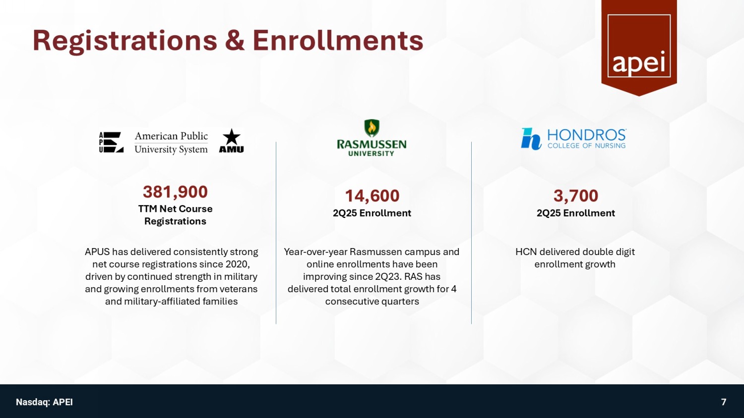 VALUES Be Customer Centric • Be Accountable Be Agile • Be Respectful & Inclusive Do the Right Thing Nursing & Healthcare National Nursing Platform #1 provider of pre - licensure ADN+PN education Hondros Rasmussen Current Campuses ~9,400 Enrolled nursing students 26 Campuses in 8 states 23 Nursing and Allied Health Degrees Nasdaq: APEI 5 Enrollment Momentum Continues Current demand for 200,000+ registered nursing jobs annually Public Sector Education #1 Activity - duty military & veterans educator ~90,000 Adult learners in over 90 countries >100 Federal agency customers ~25,000 Trained individuals in 2024 Nasdaq: APEI 6 Clear Leadership Position Provides Solid Growth, Margins & Cash Flow 1.